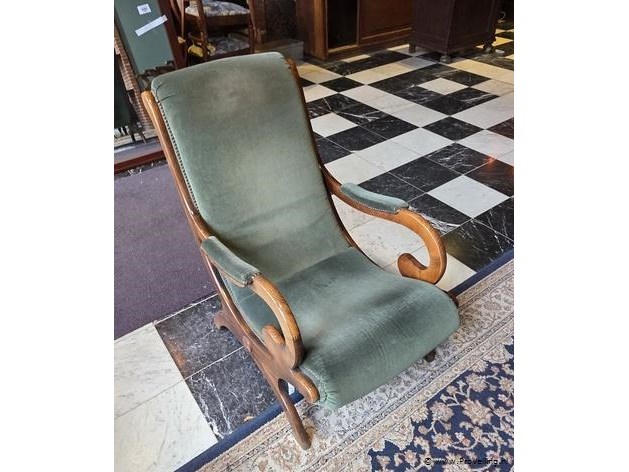 Antieke mahoniehouten stoel met gebogen armleuningen; groen velours bekleed; zie afbeeldingen