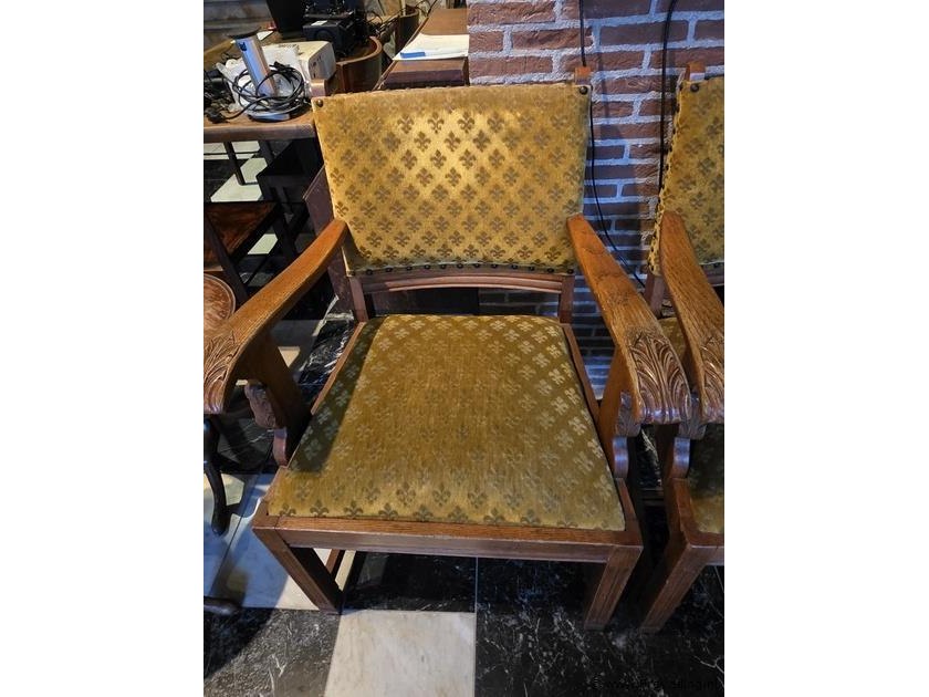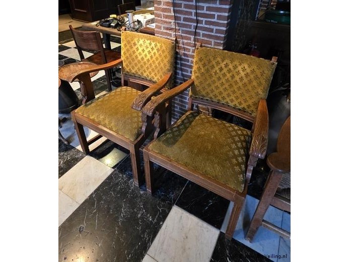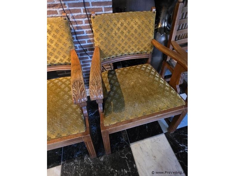 Houten stoel, bekleed met okergele stof, afmeting zithoogte ca. 52cm, bxh ca. 62x97 cm, zie afbeeldingen; aantal 2 stuks.