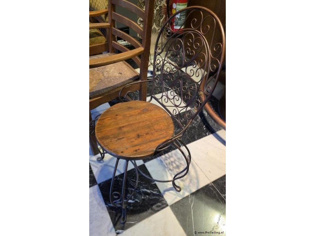 Stoel, ijzer sierwerk met houten zitting