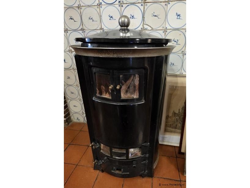 Hetelucht cilinderkachel, zwart geëmailleerd, met mica.-ruitjes, vijftiger jaren, hoogte ca. 80cm, zie afbeeldingen.
