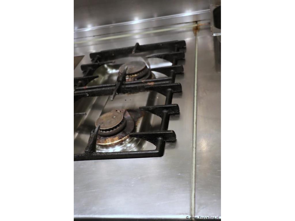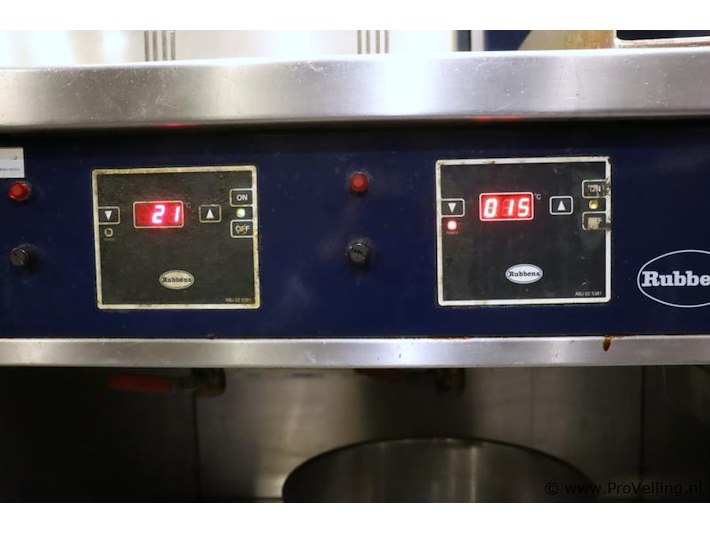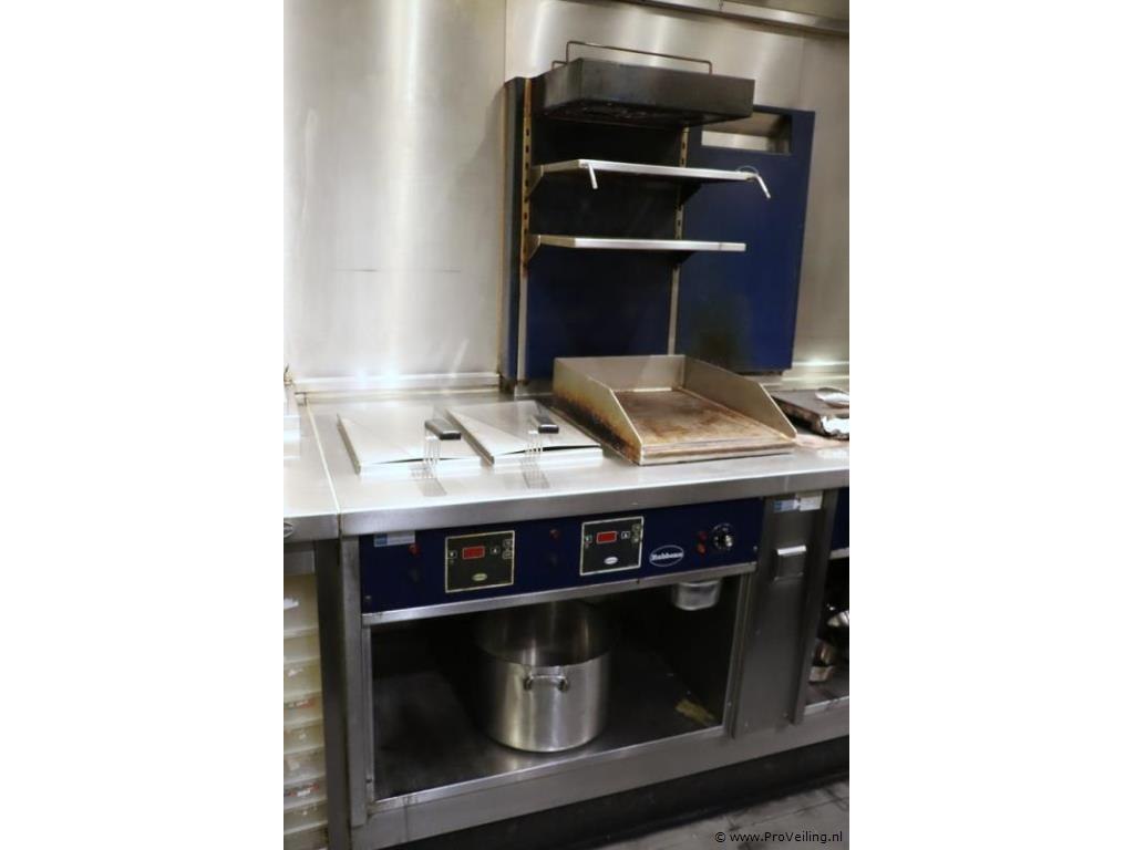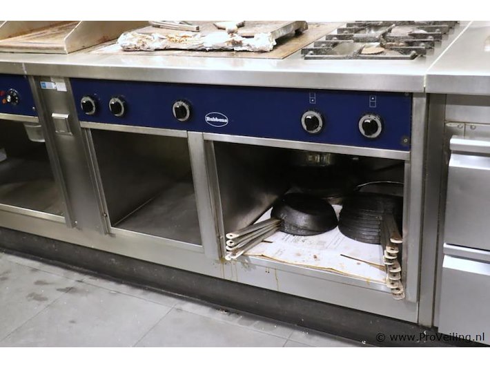 Rubbens RVS horeca bakwand bestaande uit o.a. gasfornuis, grill & frituur; afmetingen ca. 234x90x96cm; door koper zelf vakkundig te demonteren op aanwijzing van ProVeiling. Excl. inhoud.