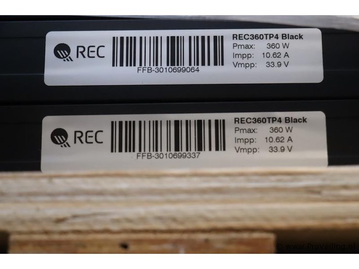 REC Zonnepaneel 360TP4 6002555; aantal 1 pallet á 33 stuks; Pmax: 360W; Impp: 10.62 A; Vmpp: 33.9V; gewicht ca. 705kg; nieuw in verpakking.