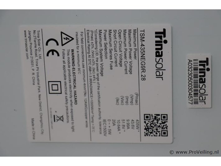 TrinaSolar Vertex S+ Zonnepaneel TSM-435NEG9R.28; pmax: 435W; Vmp: 43.6V; lmp: 9.99A; max. system voltage: IEC1500V; aantal ca. 7 stuks.