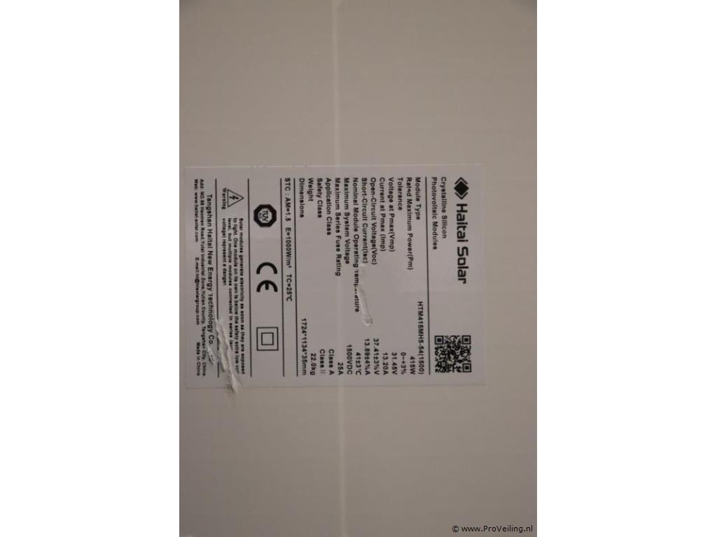 Taiji Zonnepaneel HTM415MH5-54; Pm: 415W; Vmp: 31.45V; Imp: 13.20A; max. system voltage: 1500V; gewicht: 22kg; afmetingen ca. 1724x1134x35mm; aantal ca. 13 stuks.