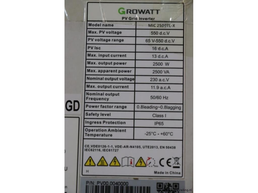PV00.0040000; nieuw in doos; winkelverkoopprijs ca. € 366,-. De Growatt MIC 2500TL-X omvormer heeft een lichter, kleiner en beter ontwerp dan de vorige generatie. Omdat de omvormer erg efficiënt is, kan deze passief gekoeld worden. Daarom is deze krachtige omvormer erg stil. Met het moderne uiterlijk ziet uw installatie er helemaal up-to-date uit! De omvormer heeft een efficiëntie van 98,4%. Het model komt met een ingebouwd overspanningsbeveiliging apparaat (SPD) type II aan DC kant en actieve vlamboogdetectie (AFCI). De MIC serie heeft één Maximum Power Point Tracker (MPPT). Monitoring via Wifi of LAN. Optioneel is ook een speciale RF verbinding beschikbaar, met een groter draadloos bereik dan de standaard Wifi oplossing. Bij alle Growatt omvormers heb je de optie de Growatt Smart Meter te gebruiken. Dit is een slimme meter waarmee je het verbruik én de productie van de zonnepanelen kunt meten en limiteren.