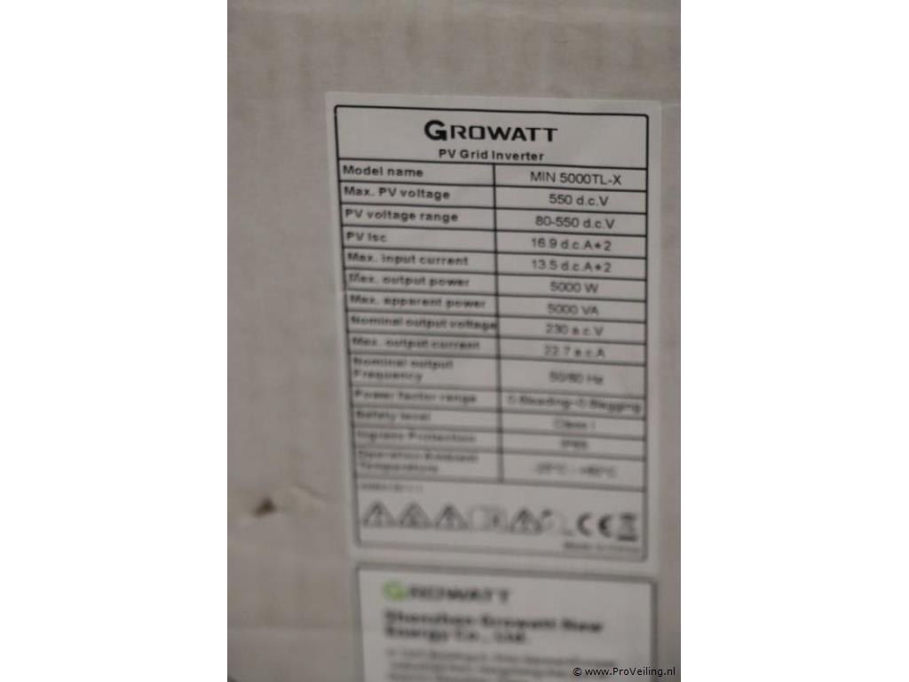 GROWATT MIN AC-gekoppelde PV-omvormer 5000TL-X; accessoires incompleet; nieuw in doos; winkelverkoopprijs ca. € 455,-. Deze Growatt MIN 5000 TL-X omvormer beschikt over 2 MPP Trackers. Dat betekent dat er 2 in serie geschakelde ‘strings’ aangesloten kunnen worden, die elkaar niet beïnvloeden bij bijvoorbeeld schaduwvorming. Ideaal als bijvoorbeeld de onderste helft van het dak pas later zon krijgt dan de bovenste helft, of als er bijvoorbeeld alleen op één helft van het dak schaduwvorming. U kunt op deze omvormer dus 2 strings aansluiten, van gezamenlijk maximaal 7000 wattpiek. En dat terwijl hij al opstart bij 100 Volt. De Growatt MIN serie heeft een nieuw uiterlijk en een touch toets met OLED display, én ondersteunt exportcontrole!