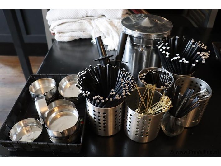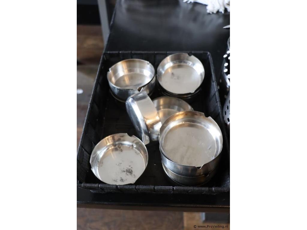 Partij horecabenodigdheden o.a. cocktail roerstaafjes, asbakken & rvs ijsblokjesemmer