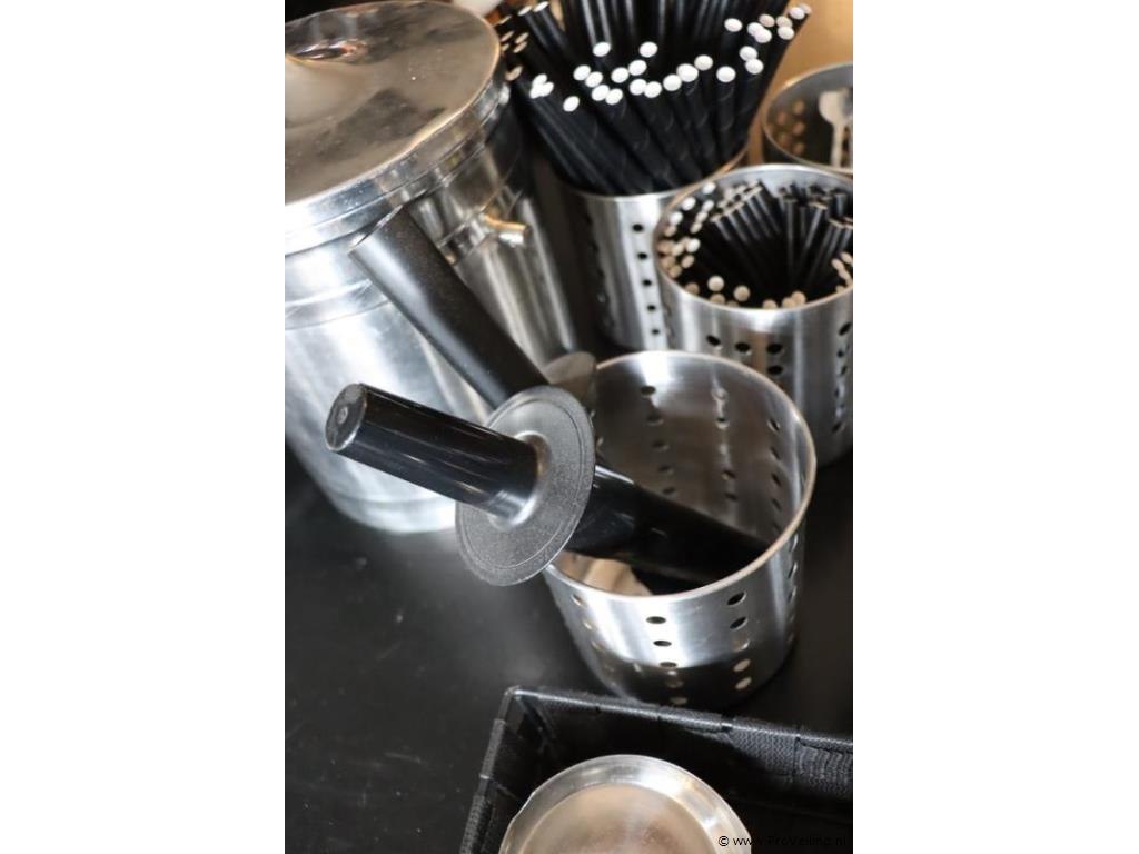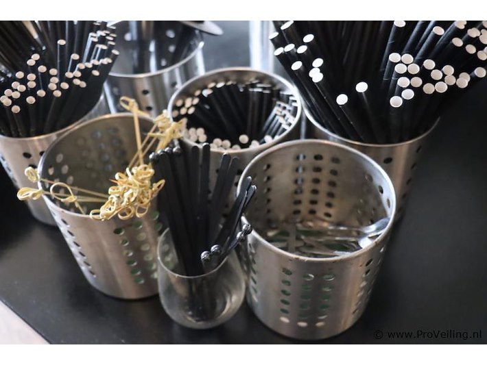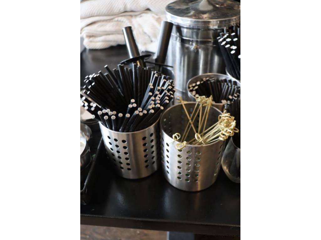 Partij horecabenodigdheden o.a. Cocktail roerstaafjes, asbakken & RVS ijsblokjesemmer; afmetingen ca. Ø 22cm x 23cm (h); zie afbeeldingen.