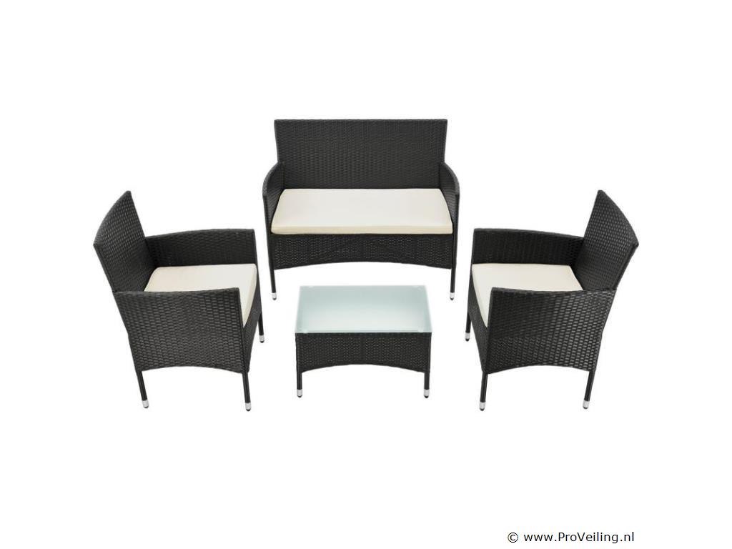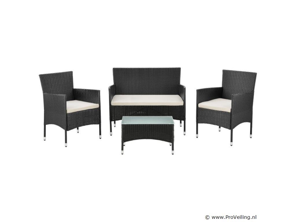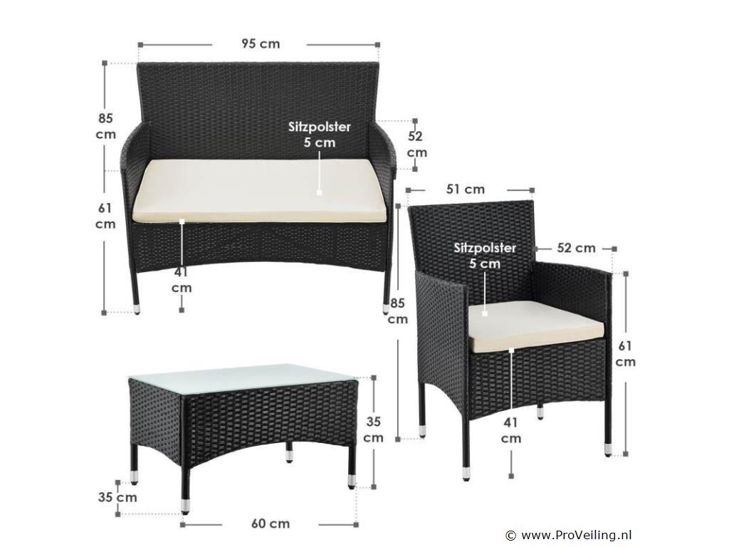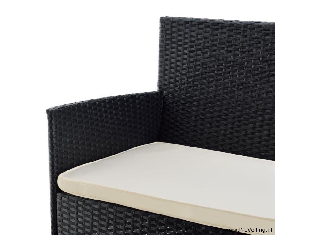 De poly rotan zitgroep Fort Myers (zwart met creme en witte hoezen) dient als comfortabele lounge voor 4 personen. Met de edele rotan-look verfraait hij elke tuin, terras of balkon. Uitgerust met een rugleuning en kussens, is de tuinset perfect om vele uren door te brengen met familie en vrienden. De 4-delige tuinmeubelset met een stevig metalen frame bestaat uit een 2-zitsbank, twee fauteuils en een kleine bijzettafel met glazen blad. De balkonset is geschikt om gasten in stijl te ontvangen. Zet drankjes en hapjes op tafel en geniet samen van de zomer. Technische specificaties: Materiaal frame: staal, gepoedercoat Materiaal weefsel: polyrotan, gevlochten Materiaal zitkussens: schuim Materiaal hoezen: polyester Materiaal glasplaat: glas (veiligheidsglas) Vlechtkleur: zwart Kleur omslag: cremewit Aantal zitplaatsen: Voor 4 personen Stijl, design: moderne rotan-look Afmetingen (ongeveer): Afmetingen tuintafel: 60 × 35 × 35 cm Afmeting bank: 95 × 52 × 85 cm Afmetingen tuinstoelen: 51 × 52 × 85 cm Hoogte rugleuning vanaf vloer: 85 cm Hoogte armleuning vanaf vloer: 61 cm Zithoogte zonder bekleding: 41 cm Dikte zitkussen: 5 cm Leveringsomvang: 1 x glazen tafel 2 x stoelen 1 x 2-zits zitbank 1 x groot zitkussen 2 x kleine zitkussens 1 x montagehandleiding
