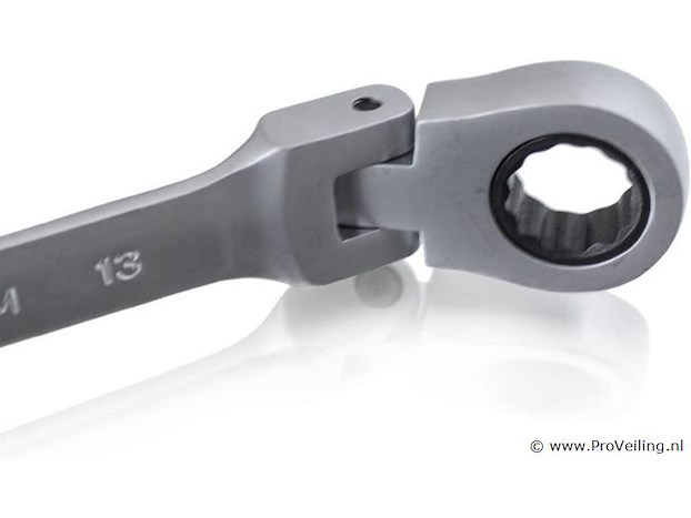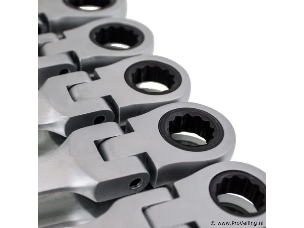 De set bestaat uit 12 ratelsleutels met scharnierkoppen, waarmee je ook op moeilijk bereikbare plaatsen kunt werken. De gereedschappen zijn gemaakt van robuust en duurzaam chroom-vanadiumstaal Ratelsleutels: 6 mm, 7 mm, 8 mm, 9 mm, 10 mm, 11 mm, 12 mm, 13 mm, 14 mm, 15 mm, 17 mm, 19 mm (5 graden terughaalhoek / 72 tanden) Praktisch en overzichtelijk, veilig opgeborgen in de kunststof koffer Technische specificaties: Maten: 6 mm, 7 mm, 8 mm, 9 mm, 10 mm, 11 mm, 12 mm, 13 mm, 14 mm, 15 mm, 17 mm, 19 mm Aantal tanden: 72 Resethoek: 5 graden Materiaal kast: kunststof Gereedschapsmateriaal: chroom-vanadiumstaal Leveringsomvang: 1x ratelsleutel met scharnier: 6 mm, 7 mm, 8 mm, 9 mm, 10 mm, 11 mm, 12 mm, 13 mm, 14 mm, 15 mm, 17 mm, 19 mm