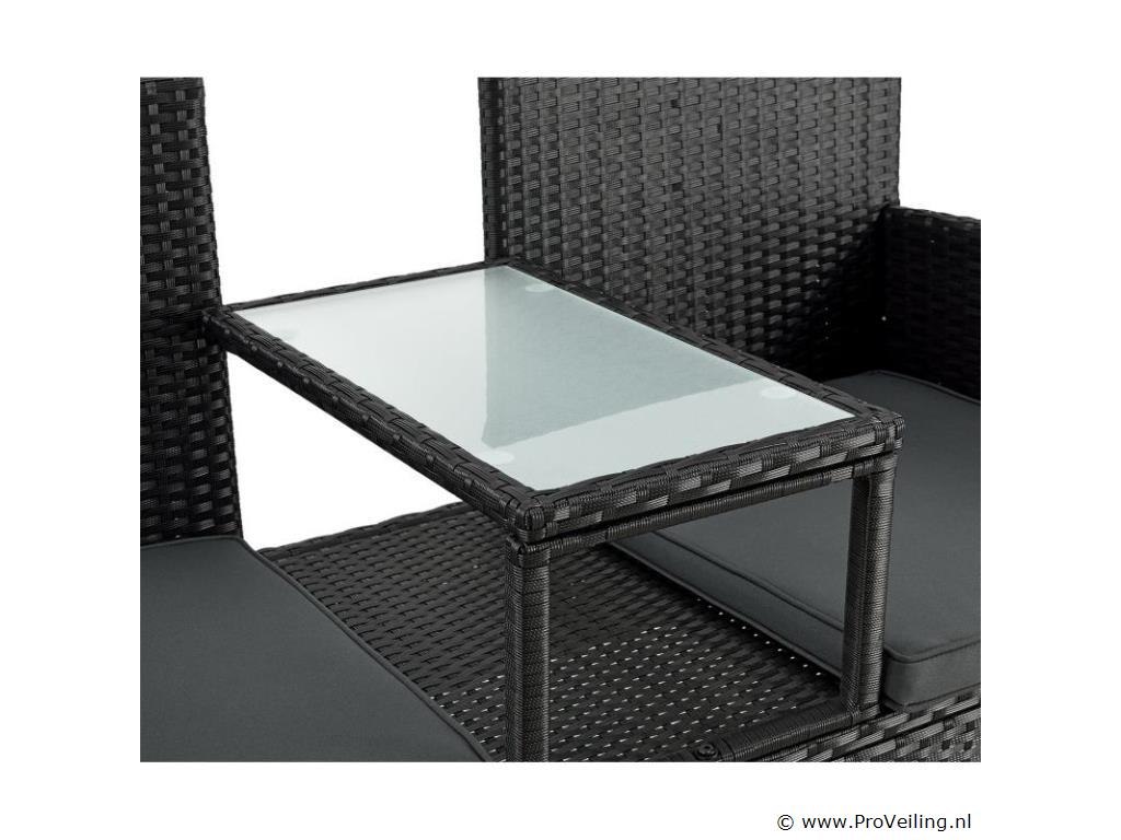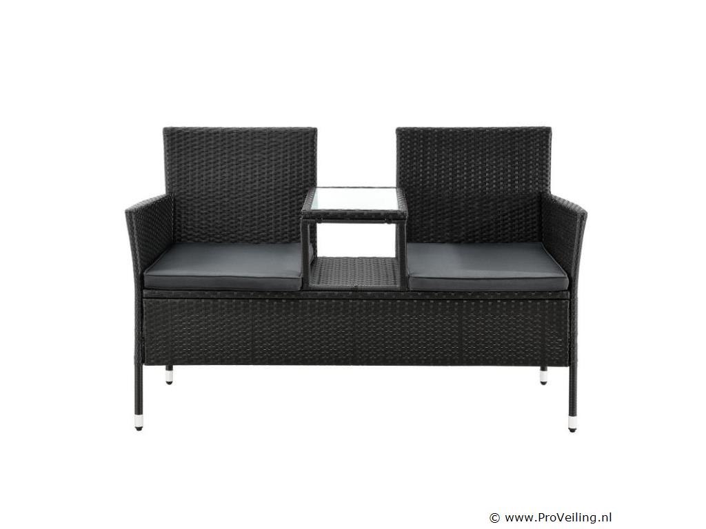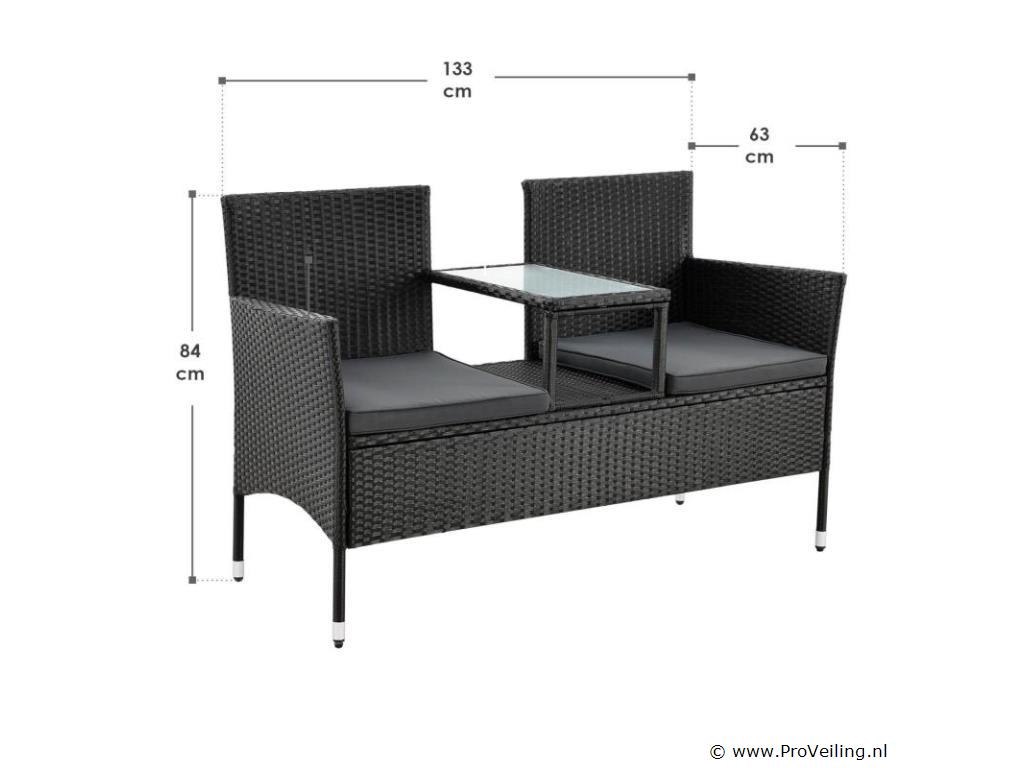 Bent u op zoek naar een stijlvolle zitgelegenheid voor uw balkon, tuin of terras die comfortabel en ruimtebesparend is? Kies dan voor de moderne polyrotan bank Monaco in zwart met donkergrijze zitkussens. De kleine tuinbank voor 2 personen neemt buiten maar weinig ruimte in beslag (133 × 63 × 84 cm) en is daarom ideaal als balkonmeubel. Ook bij de vijver, het zwembad of onder een boom oogt de 2-zitsbank in rotan-look modern en tijdloos. Het trendy vlechtwerk van polyrattan is onderhoudsvriendelijk en zorgt samen met het dikke zitkussen voor een zachte zitervaring. Zet drankjes of snacks op het kleine tafeltje in het midden. Technische specificaties: Materiaal gaas: polyrotan Materiaal frame: staal Materiaal tafelblad: glas Materiaal bekleding: schuim Materiaal hoezen: polyester Vlechtkleur: zwart Kleur kussensloop: donkergrijs Aantal zitplaatsen: 2 Hoezen wasbaar: ja Weerbestendig: ja Afmetingen (ongeveer): Totale afmetingen (BxDxH): 133 × 63 × 84 cm Zitkussen: 5 cm hoog Hoogte van de glasplaat: 0,5 cm Leveringsomvang: 1 x poly rotan bank 1 x geïntegreerde tafel 2 x zitkussens 1 x Instructie De poly rattan zitgroep wordt geleverd als bouwpakket voor zelfmontage per pakketdienst.