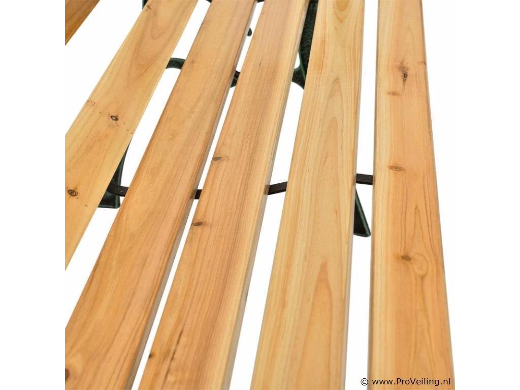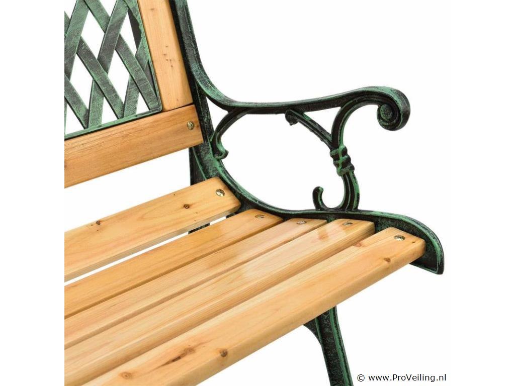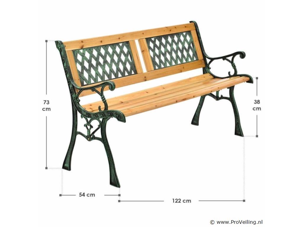 De romantische en speelse tuinbank Sanremo staat prachtig in je tuin met zijn retro flair! Het is gemaakt van gelakt dennenhout en gietijzeren zijkanten met patina-effect. De weerbestendige en robuuste materialen maken de bank perfect voor buitengebruik. Op de 122 cm lange en 54 cm diepe zitting kunnen 2 personen comfortabel zitten. Praktische armleuningen bieden u extra comfort. De bank ziet er geweldig uit met veel tuinmeubelen en rondt je buitenuitrusting af. Technische specificaties: Materiaal: gelakt dennenhout, gepoedercoat gietijzer Materiaal diamant decoratief element: kunststof Kleur hout: naturel Kleur gietijzer: zwart-groen Aantal zitplaatsen: 2 Houtdikte: 18 mm Gewicht: 13,5 kg Afmetingen (ongeveer): Lengte: 122 cm Breedte: 54cm Hoogte: 73cm Zithoogte: 38 cm Leveringsomvang: 1 × tuinbank 1 × montage-instructies