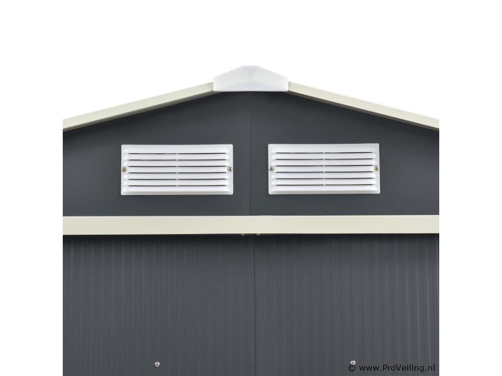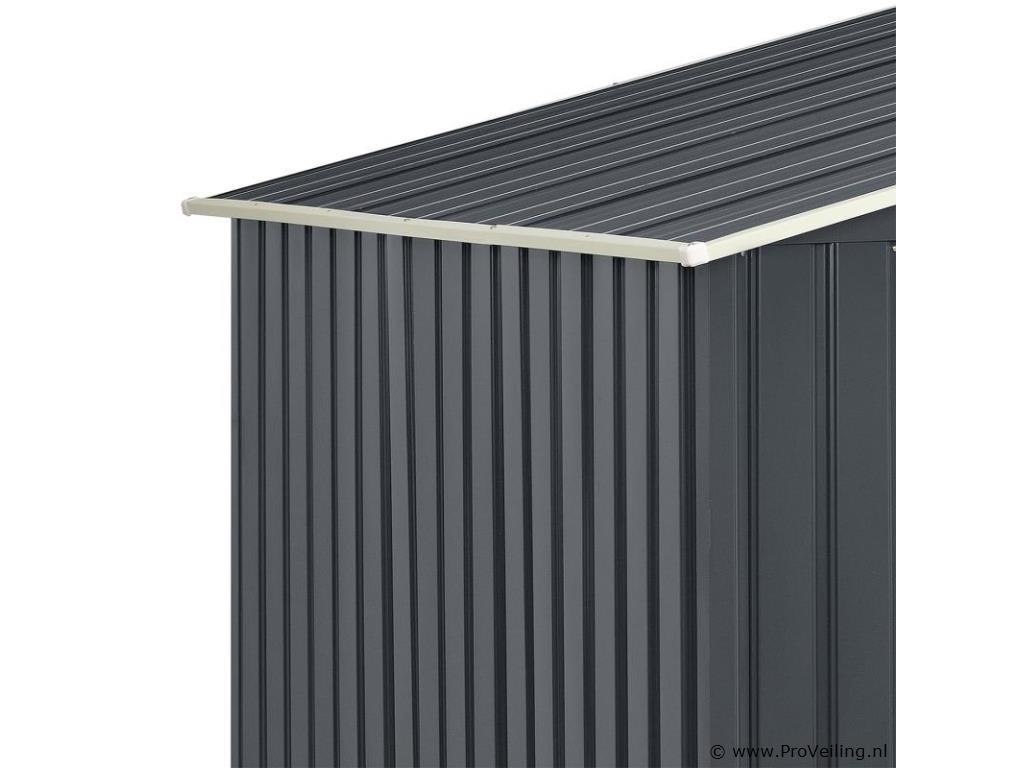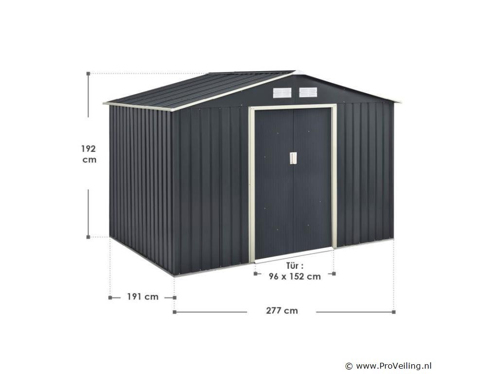 Creëer orde in je tuin - met de moderne XL metalen gereedschapsschuur met schuin dak. Maak een einde aan roestig tuingereedschap of lelijke geïmproviseerde hoezen. Tuinmeubelen, tuingereedschap en fietsen vinden een beschutte plek in de ruime gereedschapsschuur. Zo berg je je outdoor spullen droog, schoon en netjes op. Een onderstel van metaal en een praktische dubbele schuifdeur maken de uitrusting compleet. Nog een pluspunt: ventilatieroosters zorgen voor een goede luchtcirculatie. Technische specificaties: Materiaal tuinhuisje: plaatstaal, kunststof Materiaal fundering: metalen frame Kleur antraciet Bergruimte: ca. 9 m³ Afmetingen (ongeveer): Totale afmetingen: 277 × 191 × 192 cm Interne afmetingen: 267 × 181 × 187 cm Afmetingen voet: 267 × 181 cm Nokhoogte: 192 cm Hoogte dakrand: 152 cm Deur: 96 x 152 cm Leveringsomvang: 1 x metalen gereedschapsschuur 1 x funderingsframe 1 x montage-instructies Dit artikel bestaat uit 3 dozen, het kan logistiek voorkomen dat het in meerdere dagen geleverd wordt.