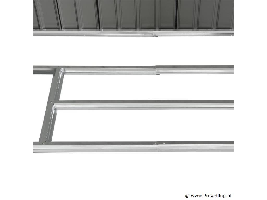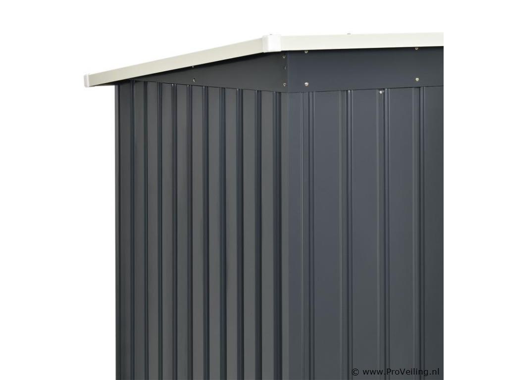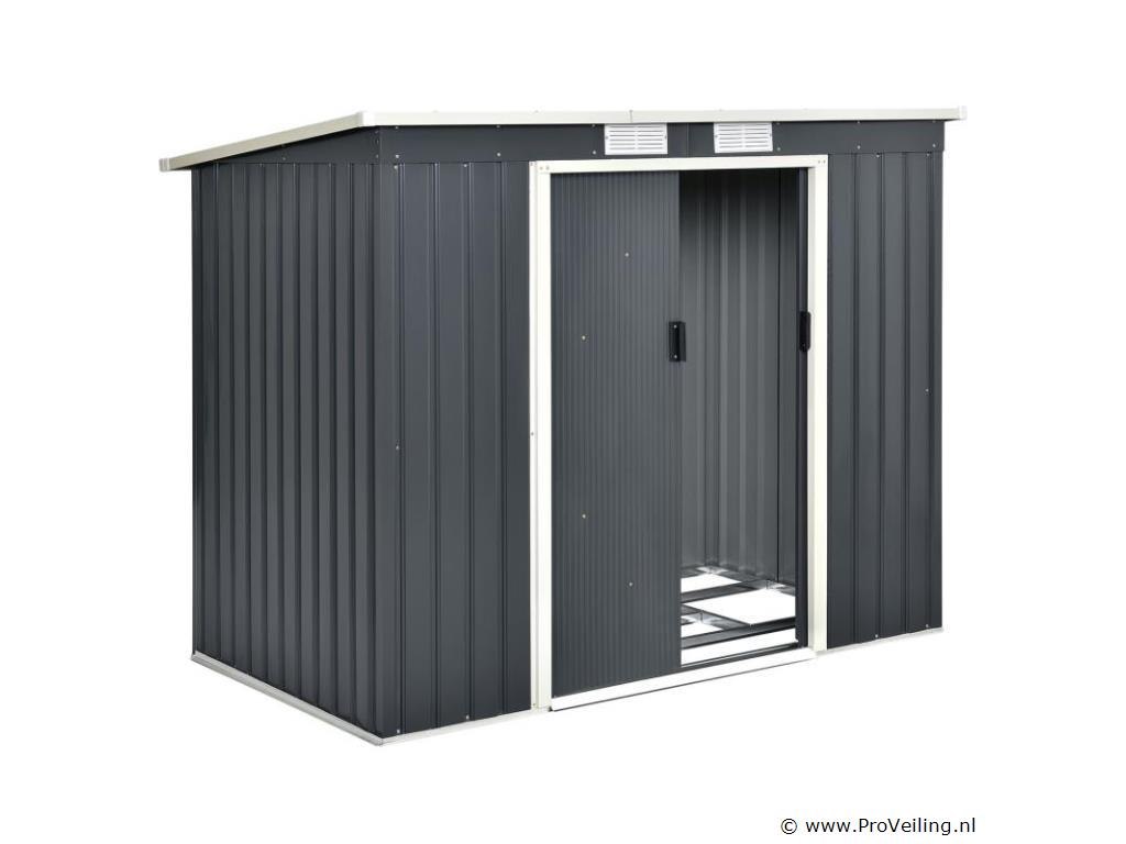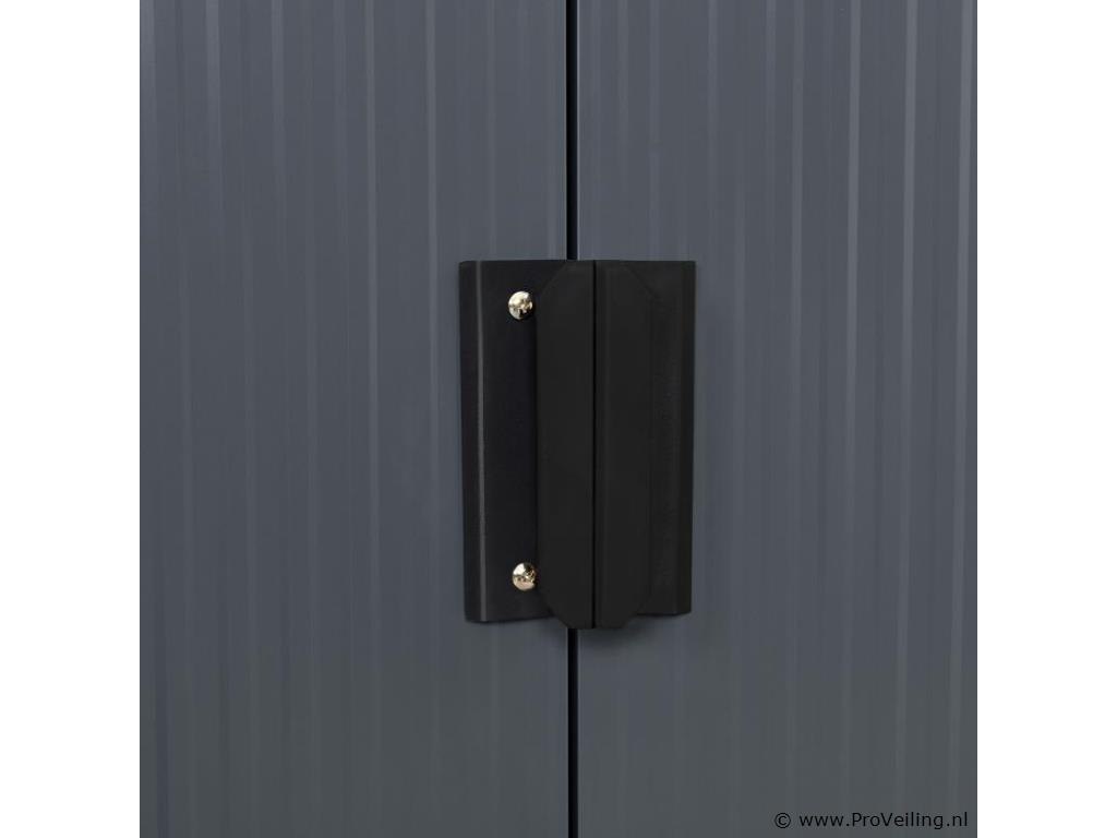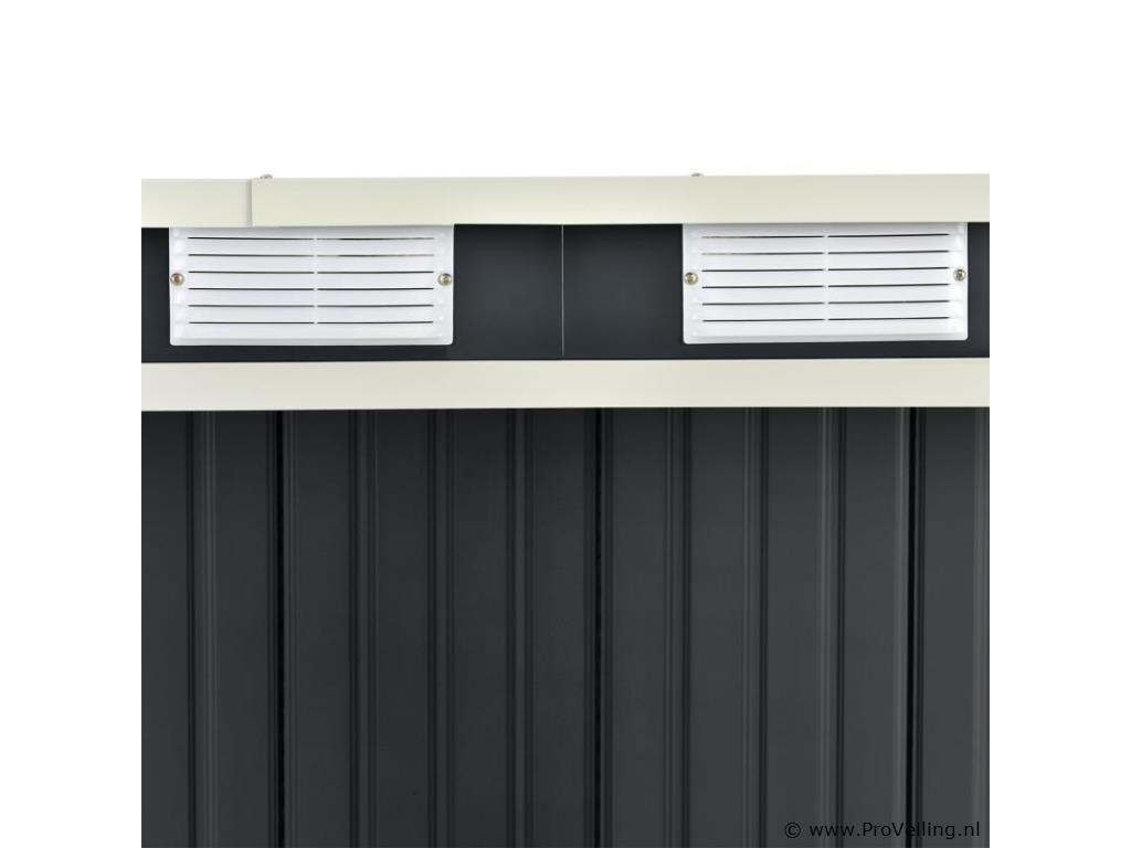 Creëer orde in je tuin - met de moderne metalen gereedschapsschuur met lessenaarsdak in maat M. Maak een einde aan roestig tuingereedschap of lelijke geïmproviseerde afdekkingen. Tuinmeubelen, tuingereedschap en fietsen vinden een beschutte plek in de ruime gereedschapsschuur. Zo berg je je outdoor spullen droog, schoon en netjes op. Een basisframe van metaal en een praktische dubbele schuifdeur ronden de uitrusting af. Nog een pluspunt: ventilatieroosters zorgen voor een goede luchtcirculatie. Technische specificaties: Materiaal tuinhuisje: plaatstaal, kunststof Materiaal fundering: metalen frame Kleur antraciet Bergruimte: ca. 4 m³ Afmetingen (ongeveer): Totale afmetingen: 213 × 130 × 173 cm Binnenafmetingen: 203 × 117 × 170 cm Afmetingen voet: 203 × 117 cm Nokhoogte: 173 cm Hoogte dakrand: 152 cm Deur: 96 x 152 cm Leveringsomvang: 1 x metalen gereedschapsschuur 1 x funderingsframe 1 x montagehandleiding