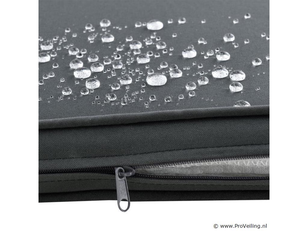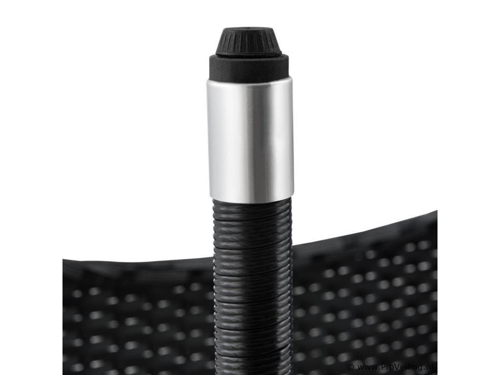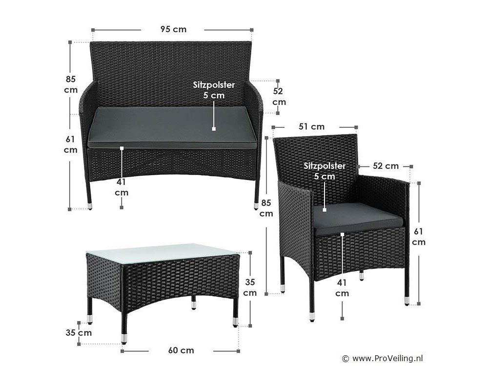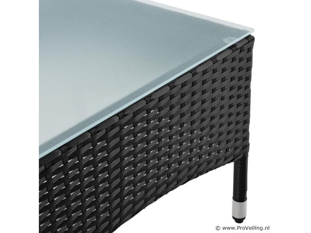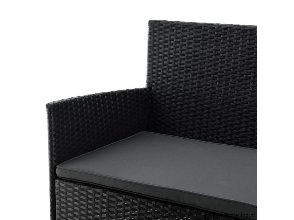 De poly rotan zitgroep Fort Myers (zwart met donkergrijze hoezen) dient als comfortabele lounge voor 4 personen. Met de edele rotan-look verfraait hij elke tuin, terras of balkon. Uitgerust met een rugleuning en kussens, is de tuinset perfect om vele uren door te brengen met familie en vrienden. De 4-delige tuinmeubelset met een stevig metalen frame bestaat uit een 2-zitsbank, twee fauteuils en een kleine bijzettafel met glazen blad. De balkonset is geschikt om gasten in stijl te ontvangen. Zet drankjes en hapjes op tafel en geniet samen van de zomer. Technische specificaties: Materiaal frame: staal, gepoedercoat Materiaal weefsel: polyrotan, gevlochten Materiaal zitkussens: schuim Materiaal hoezen: polyester Materiaal glasplaat: glas (veiligheidsglas) Vlechtkleur: zwart Kleur bekleding: donkergrijs, antraciet Aantal zitplaatsen: Voor 4 personen Stijl, design: moderne rotan-look Afmetingen (ongeveer): Afmetingen tuintafel: 60 × 40 × 35 cm (BxDxH) Afmetingen bank: 86 × 51 × 84 cm (BxDxH) Afmetingen tuinstoelen: 42 × 51 × 84 cm (BxDxH) Hoogte rugleuning vanaf vloer: 84 cm Hoogte armleuning vanaf vloer: 62 cm Zithoogte zonder bekleding: 42 cm Dikte zitkussen: 5 cm Leveringsomvang: 1 x glazen tafel 2 x stoelen 1 x 2-zits zitbank 1 x groot zitkussen 2 x kleine zitkussens 1 x montagehandleiding
