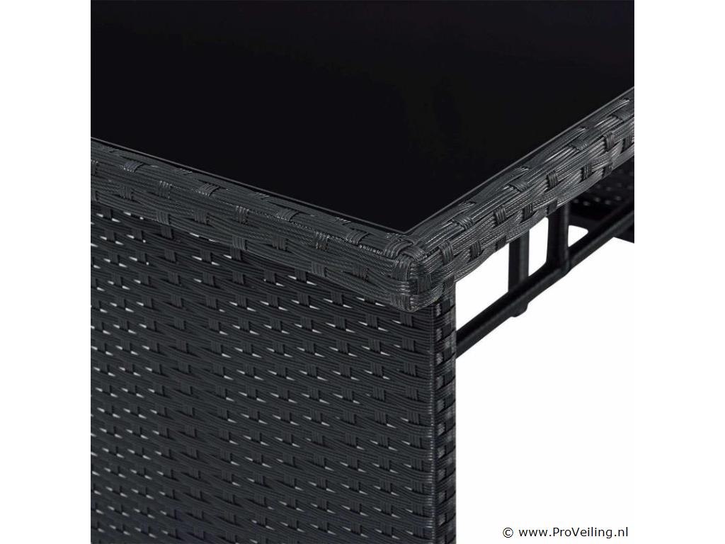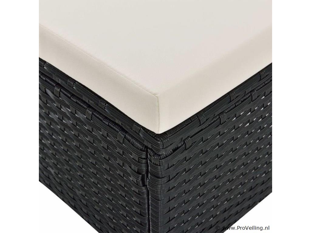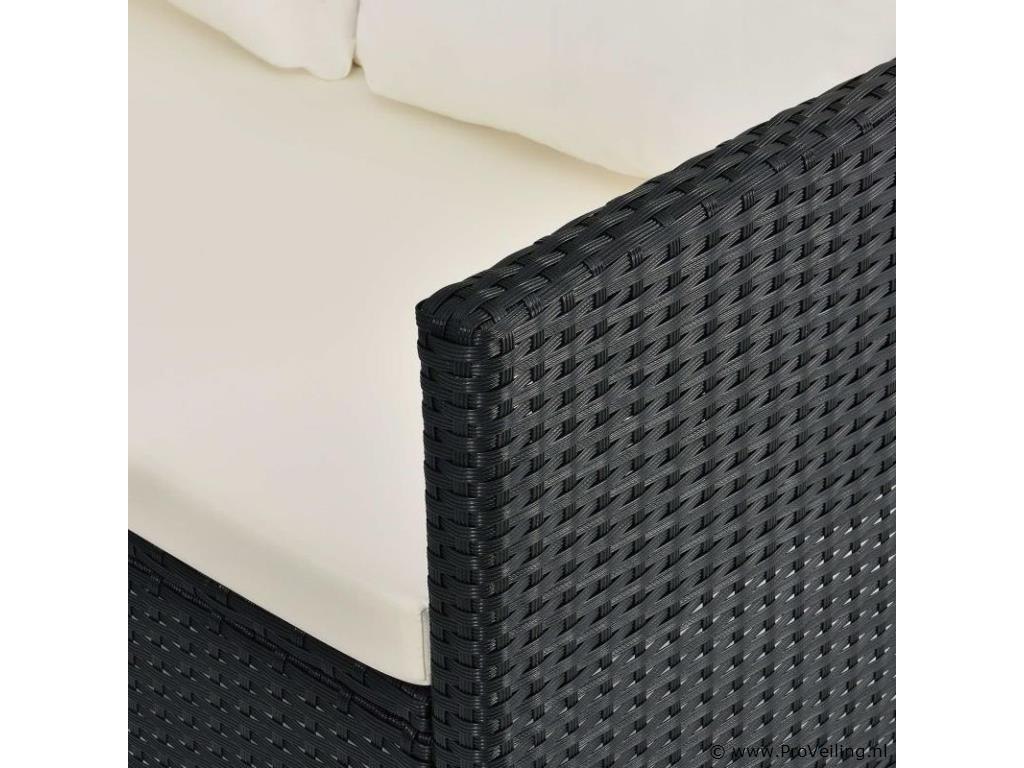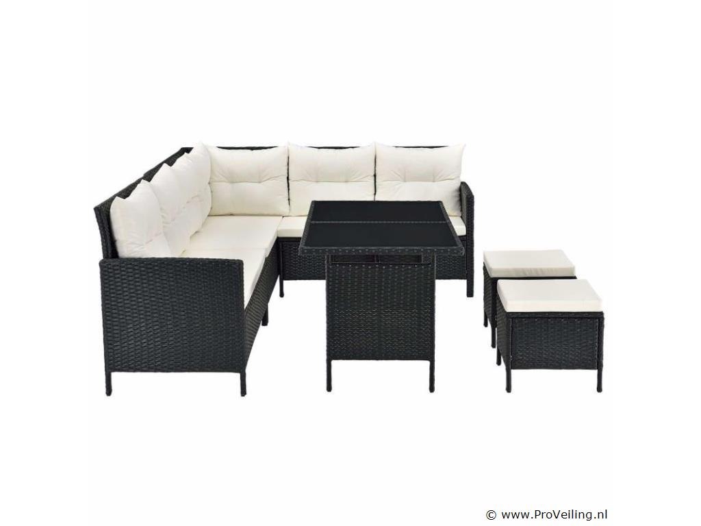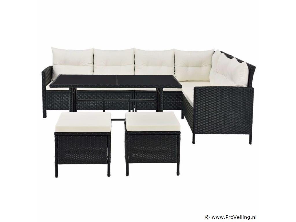 Met de Manacor polyrattan loungeset verander je je tuin, terras of balkon in een stijlvolle plek om te relaxen en je goed te voelen. De grote tuinlounge met een bank, 2 krukken en een tafel is geschikt voor maximaal 7 personen. Zachte zit- en rugkussens zorgen voor een comfortabele zitervaring. De grote eettafel is beschikbaar om te dineren of bordspellen. Gezellige avonden met familie, vrienden of buren worden een geweldige belevenis in de buitenlucht. De unieke rotan-look geeft de tuinmeubelset een moderne charme. Technische specificaties: Materiaal frame: staal, gepoedercoat Materiaal gaas: polyrotan Materiaal tafelblad: veiligheidsglas Materiaal zitkussen: 100% schuim Materiaal hoezen: 100% polyester Vlechtkleur: zwart Kleur hoes: creme Dikte glasplaat: 5 mm Aantal zitkussens: 5 Aantal rugkussens: 7 Dikte kussen: 5 cm Omslagen: 220g/m2 Afmetingen (ongeveer): Bankelement links: 110 x 62 x 80 cm Rechter bankelement: 110 x 62 x 80 cm Centraal bankelement: 118 x 62 x 80 cm Kruk: 40 x 40 x 35 cm Tafel: 116 x 66 x 66 cm Let op: De hoezen van de zitkussens kunnen eraf geritst en gewassen worden. De hoezen van de rugkussens zijn echter niet afneembaar (hoes aan het kussen genaaid) en dus niet wasbaar. Ze hebben een ritssluiting, maar die heeft geen functie. Alleen de hoezen van het zitkussen zijn wasbaar. Ververs de impregnering na het wassen. Het hele kussen mag niet in de wasmachine, anders zal de vulling eronder lijden. Leveringsomvang: 1 × hoekbank 2 × krukken 1 × tafel 2 × glasplaten 5 × zitkussens 7 × rugkussens 1 × Instructie