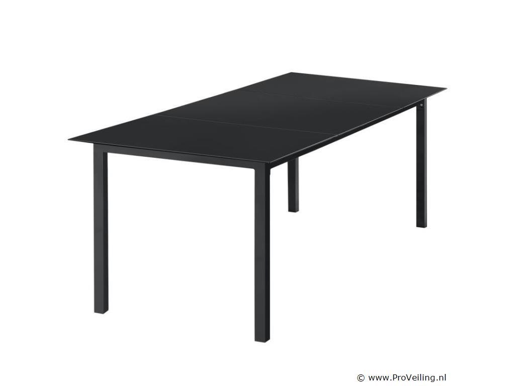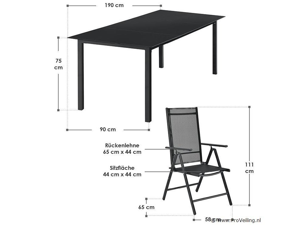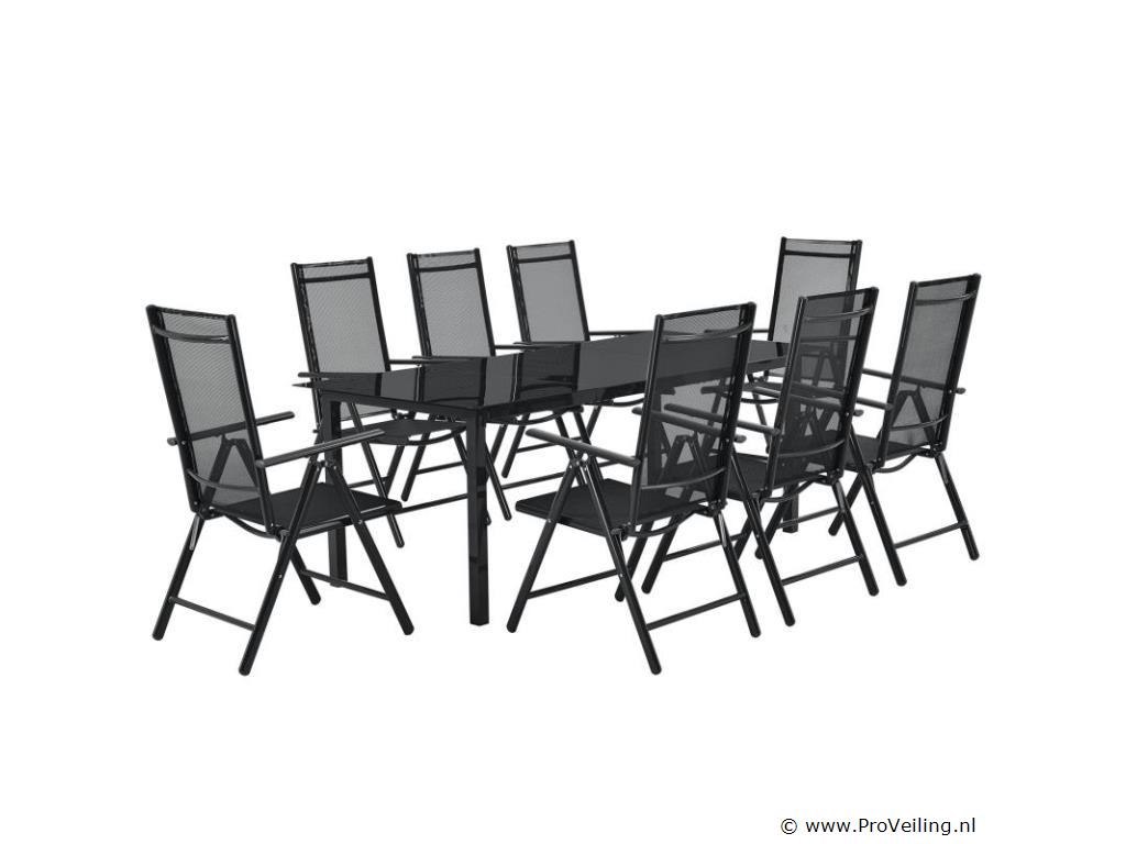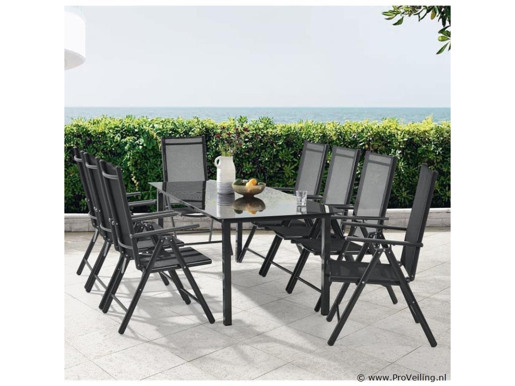 De 9-delige aluminium tuinset Milano met een grote tafel en acht stoelen is een perfecte zomerse metgezel voor frisse lucht kenners. Breng spelavonden, brunch- en koffiekransen, kleurrijke kinderverjaardagsfeestjes en grote barbecuefeesten door bij je nieuwe eetgezelschap. De montage is snel gedaan en de lichte tuinmeubelen zijn in een mum van tijd mee te nemen. De supergemakkelijke reiniging en verzorging duurt niet lang na elk feest. Vouw je stoelen in één keer op en alle sporen zijn verdwenen. Technische specificaties: Materiaal frame: gepoedercoat aluminium Materiaal gaas: textielweefsel (PVC gecoat) Materiaal tafelbladen: 5 mm veiligheidsglas Kleur frame: donkergrijs Vlechtkleur: zwart Afmetingen (ongeveer): Afmetingen tafel: 190 x 90 x 75 cm Afmeting stoel: 52 x 65 x 110 cm Zitting: 44 x 44 cm Ruggedeelte: 65 x 44 cm Leveringsomvang: 1 × tafel 8 × stoel 3 × glasplaat 1 × montage-instructies