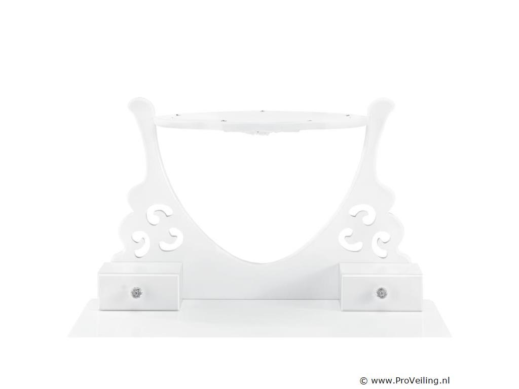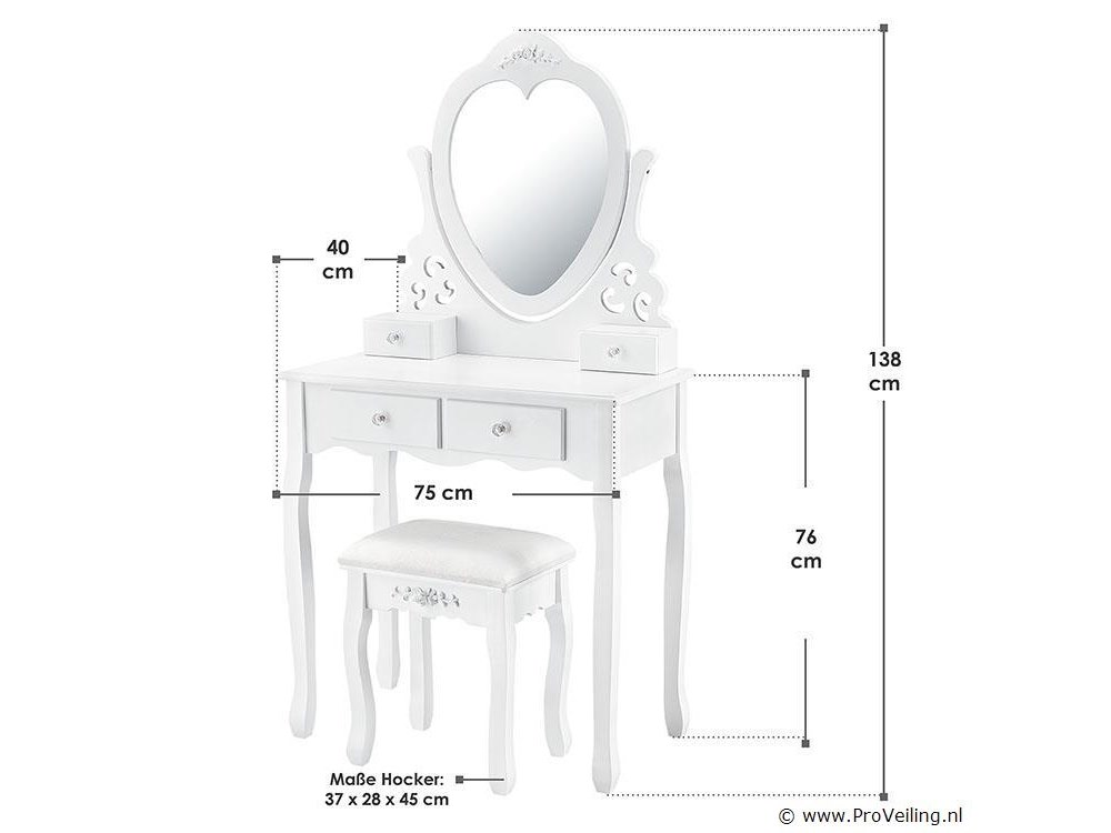 De make-up tafel Julia wit met spiegel, krukje en 4 lades is de absolute musthave voor beauty queens. Ontwerp een comfortabele cosmetica- en kappershoek in de slaapkamer, tienerkamer of kinderkamer. De kaptafel is gemaakt van wit gelakt MDF-hout en maakt indruk met zijn romantische, speelse landelijke uitstraling. De hartvormige spiegel en het krukje met bloemenbekleding zorgen voor veel comfort bij dagelijkse make-up en kappersbeurt. Vier lades met decoratieve handgrepen bieden ruimte voor cosmetica, parfum, sieraden en allerlei accessoires. Technische specificaties: Kaptafel: 100% MDF-hout Kruk: 40% katoen, 60% polyester Kleur wit Ontwerp: landelijke stijl Aantal spiegels: 1 Aantal lades: 4 Maximale belasting kruk: 100 kg Afmetingen (ongeveer): Totale afmetingen: 74 x 40 x 138 cm (BxDxH) Hoogte tafel: 76 cm Hoogte spiegelbevestiging: 62 cm Kruk: 37 x 28 x 45 cm Leveringsomvang: 1 × kaptafel 1 × kruk 1 × montage-instructies