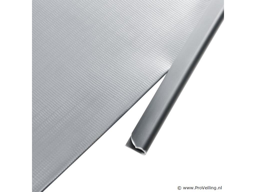 Technische specificaties: Kleur: lichtgrijs Aantal montageklemmen: 120 Materiaal: PVC PVC-kwaliteit: 450 g / m Temperatuurbereik: -30 ° C tot +70 ° C UV- en weerbestendig: Ja Afmetingen (ongeveer): Lengte: 4 x 35m Hoogte: 19cm
