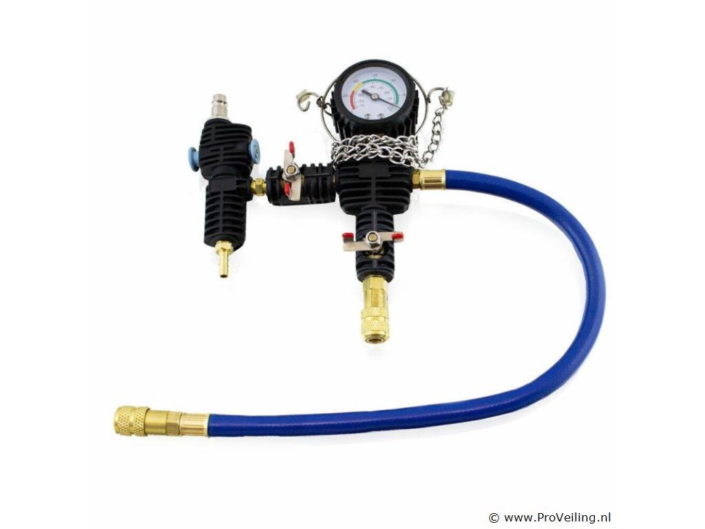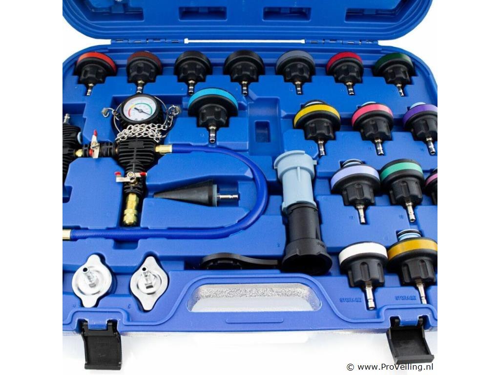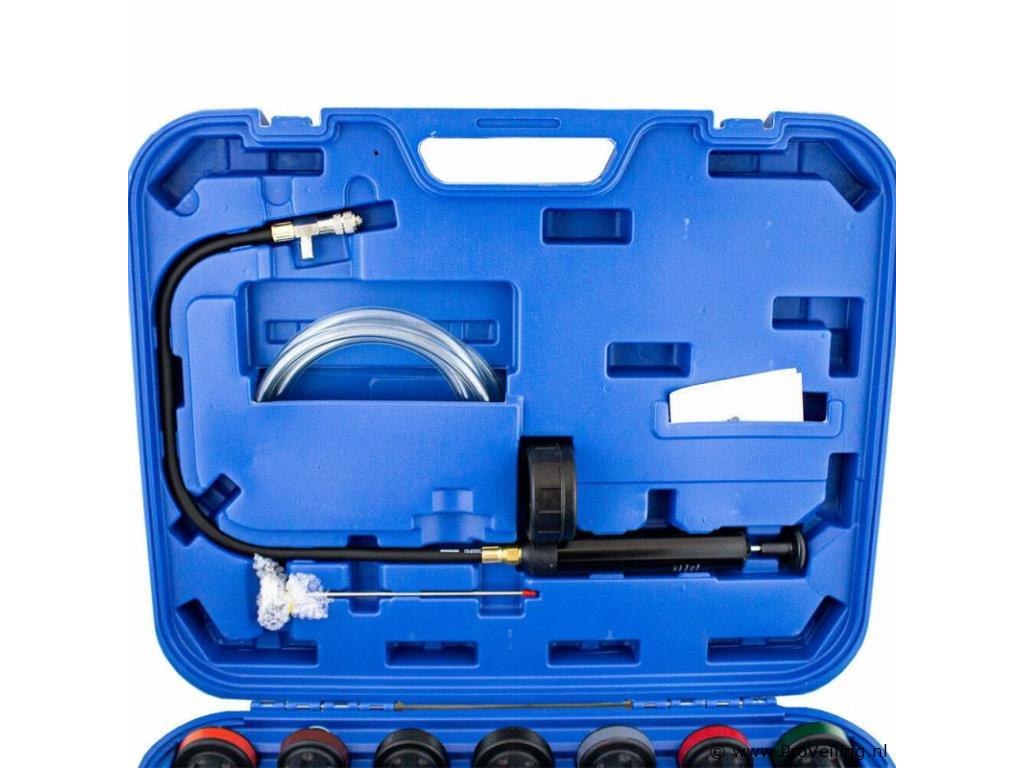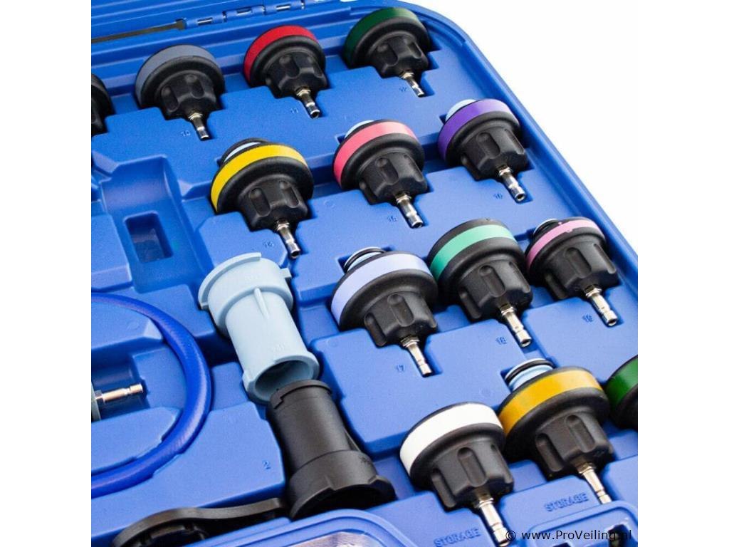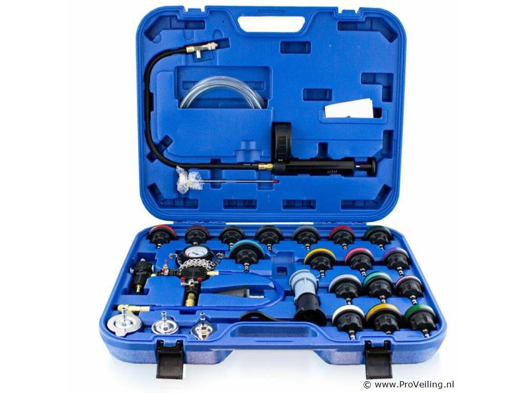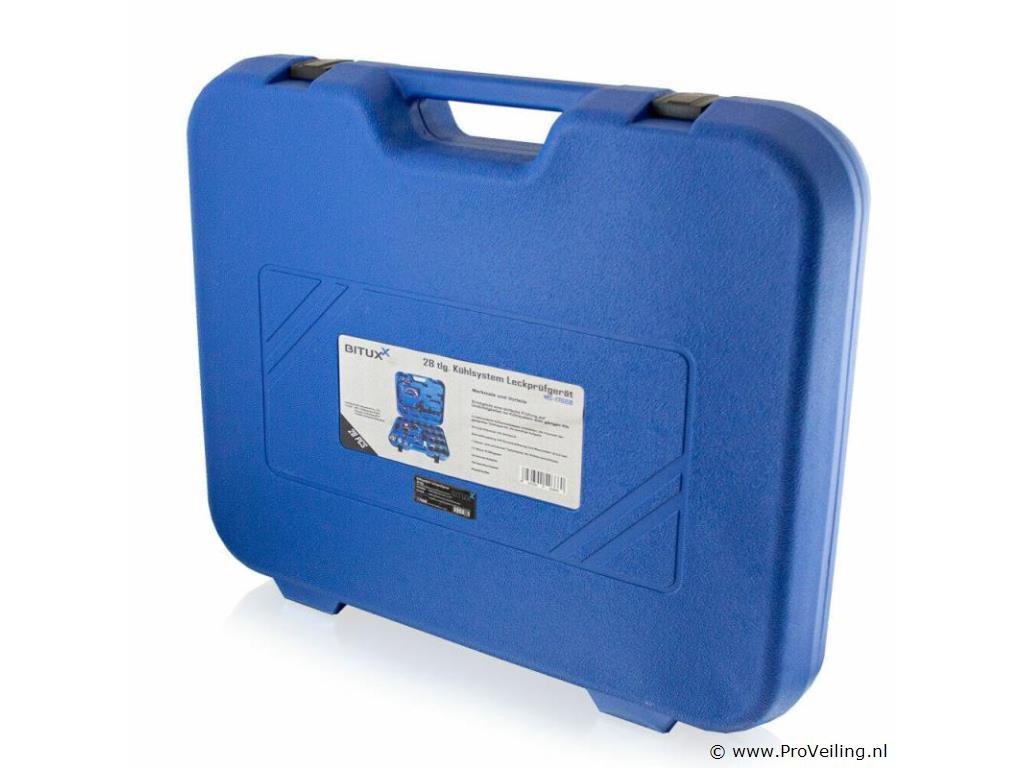 Uitgebreid 28-delig koelsysteem, test- en vulsysteem in praktische koffer De lekdetector voor het koelsysteem is geschikt voor alle gangbare automodellen en merken uit Europa, Azië en de VS Controleer en test snel het koelsysteem van uw voertuig met deze lekdetector voor het koelsysteem. Eenvoudige en ongecompliceerde testset voor het koelsysteem bestaande uit een manometer met pomp, vuleenheid en verschillende adapters voor de voertuigmodellen Ideaal voor werkplaatsen en hobbyisten leveringsomvang 1x pomp met manometer 1x vuleenheid 1x temperatuursensor 0-200° 1x slang 1x adaptersleutel 23x adapters 1x kunststof koffer Technische specificaties Afmetingen kast: 580 mm x 480 mm x 110 mm (L/B/H) maximale druk: 0 - 2,5 bar Gewicht: 5,5 kg