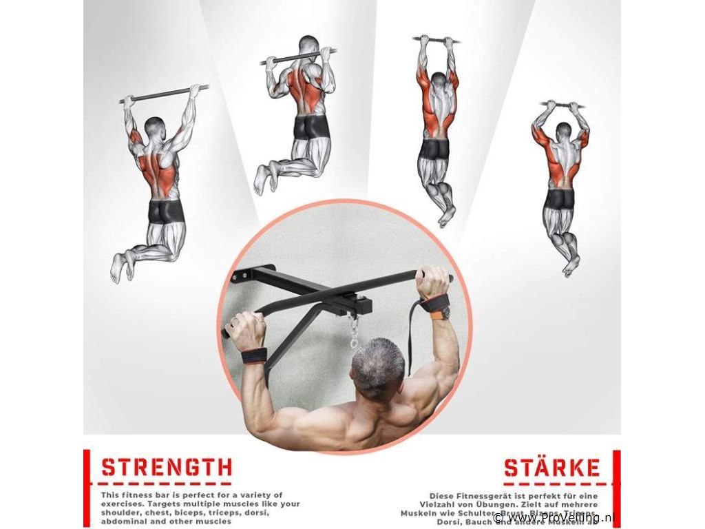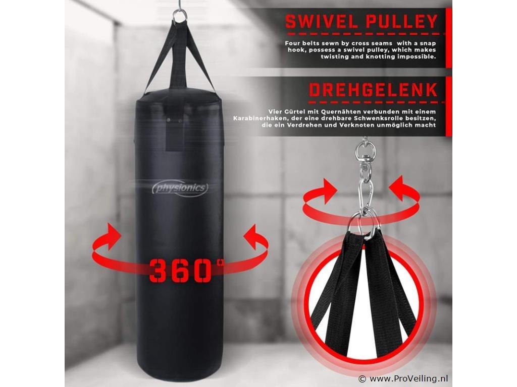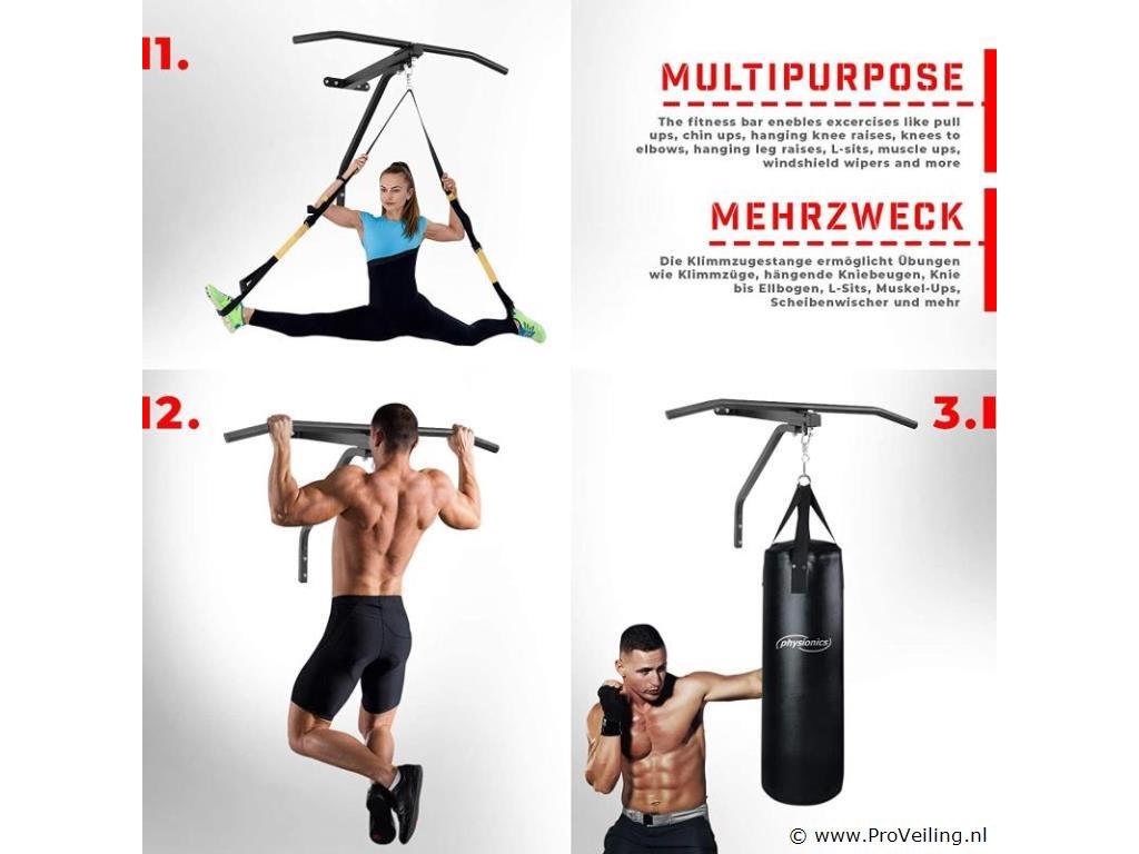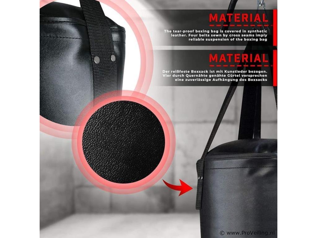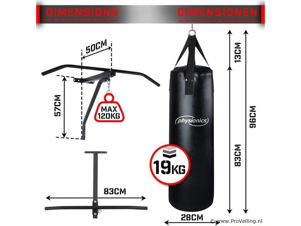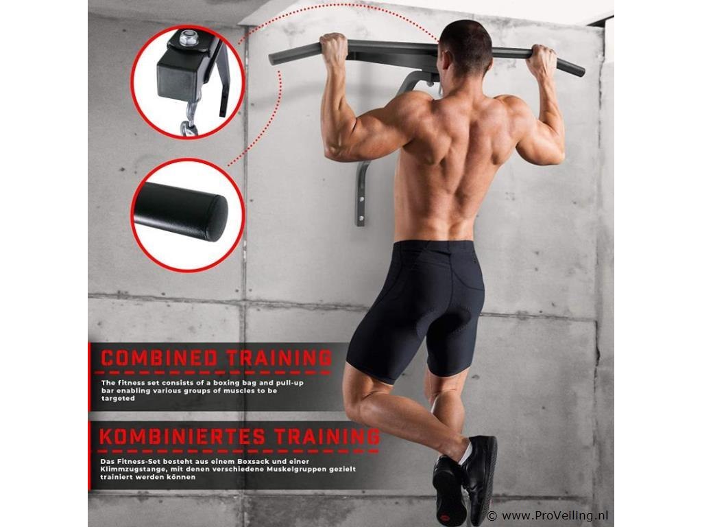Deze set bestaat uit een optrekstang en een bokszak, die zowel voor beginners als professionals geschikt is. Gebruikers van deze sportuitrusting kunnen complete trainingen van verschillende spiergroepen uitvoeren door deze 2 gereedschappen effectief te gebruiken. Je kunt je algemene spieren ontwikkelen en bovendien na een lange dag spanning ontlasten. De pull-up stang is gemaakt van robuust staal, terwijl de gevulde bokszak is gemaakt van kunstleer. De houder is eenvoudig te monteren, zodat je met de training kunt beginnen zodra je thuiskomt. Geschikt voor beginners en professionals. Stabiele constructie. Eenvoudige montage. Versterkte kruisnaden met klinknagels. Maximale belastbaarheid: 120 kg. Technische gegevens: Afmetingen optrekstang: ca. 82 / 56,5 / 53 cm Afmetingen bokszak (Ø / H): ca. 28 NL/83 cm Gewicht bokszak: ca. 19 kg. Totale hoogte: ca. 132 cm Totaal gewicht: optrekstang + bokszak: ca. 22,5 kg. Materiaal: staal. Stof: 100% polyurethaan. Kleur: zwart. Inhoud levering: 1 x bokszak met houder KLMZ02. 1 x handleiding in meerdere talen (DE / FR / EN / ES). Opmerking: Geen verzending buiten het schiereiland Montagemateriaal niet inbegrepen.