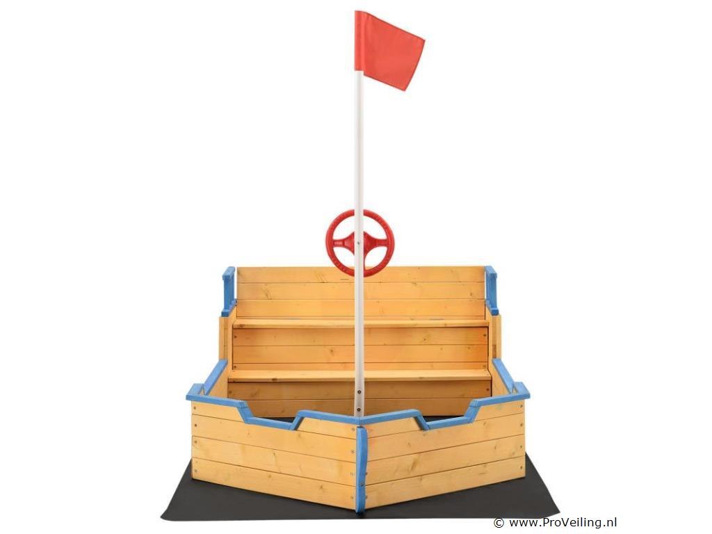 Zandbak Captain Pit met bankje en grondzeil Kinderen houden ervan om creatief te spelen, vooral als ze tegelijkertijd dingen kunnen vormgeven en creëren. Je kunt precies dit fantasierijke spel ondersteunen met onze sandbox Captain Pit. Het creatieve piratendesign laat de harten van kinderen tot bloei komen en brengt de kinderspeelplaats in de eigen tuin. De kleintjes kunnen graven, vormen en bouwen zoals hun hartje begeert. Tegelijkertijd bevordert u spelenderwijs zijn motoriek. Coördinatie en bereidheid om te experimenteren worden in het vrije spel versterkt en je kind kan met vertrouwen de wereld ontdekken. Geïntegreerde bank In de speelse zandbak zijn extra zitjes verwerkt. Deze zijn populair bij kinderen en bieden extra comfort en speelmogelijkheden. De lengte van bijna twee meter en 94 cm breedte biedt voldoende ruimte om te spetteren en te spelen met andere kinderen. Massief natuurlijk hout Het massieve grenenhout biedt een hoge mate van sterkte en veerkracht. Het werken met natuurlijke materialen zoals hout en zand en het aanraken van verschillende oppervlakken prikkelt de zintuigen van je kind en bevordert de ontwikkeling. Technische specificaties: Materiaal zandbak: grenenhout Materiaal vlag: zijden stof Materiaal stuur: kunststof Materiaal mast: kunststof Kleur: naturel Leeftijdsbeperking: 3 – 10 jaar Grondzeil: aanwezig Afmetingen (ongeveer): Afmetingen (L x B x H): 195 x 94 x 136 cm Hoogte boot zonder mast: 48 cm Hoogte boot met mast: 136 cm Vulhoogte zand: 12 cm Leveringsomvang: 1x Zandbak Captain Pit 1 * Instructie