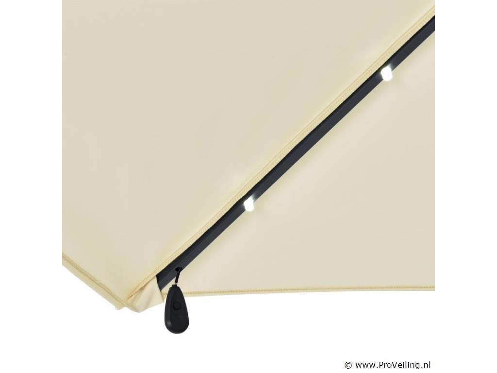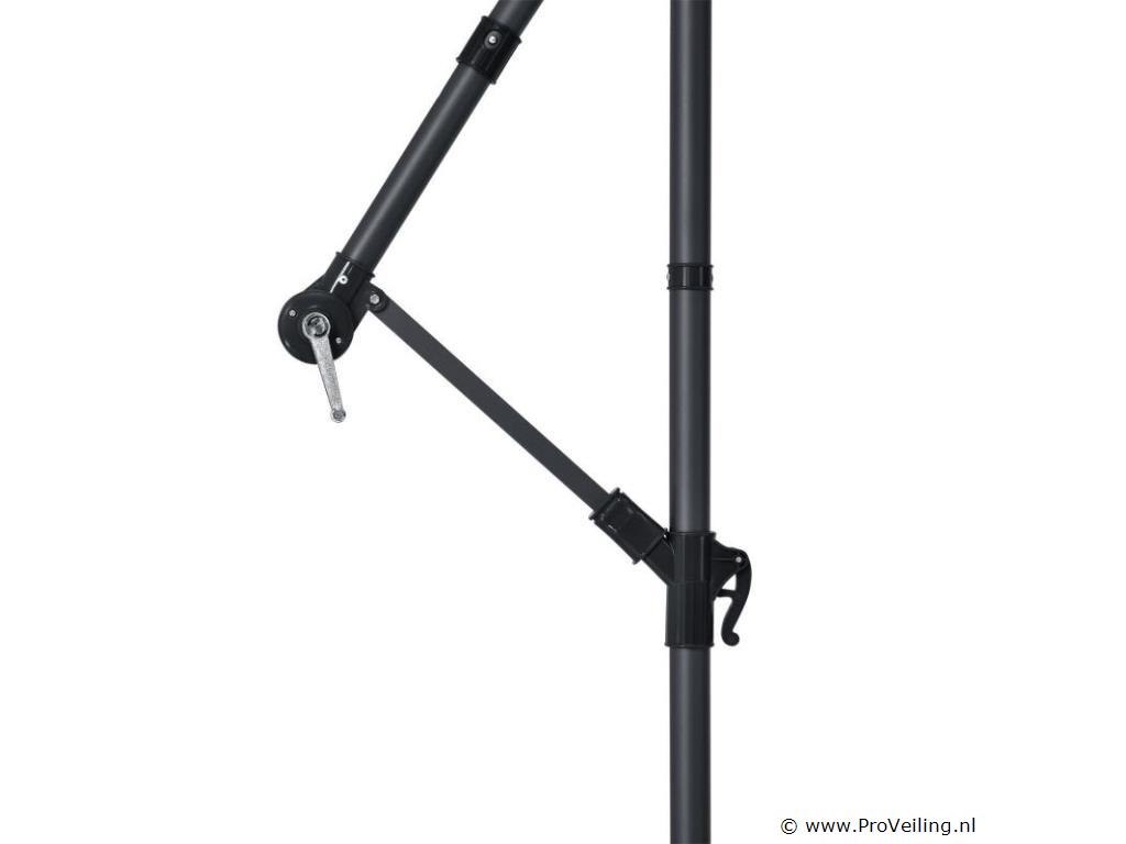 De trendy zweefparasol Brazil met led-verlichting, zwengel en voet in grijs/crème is de perfecte aanvulling op balkon, terras, zwembad of tuin. Met zijn parasol van 350 cm beschermt de parasol je tegen de brandende zon en gedeeltelijk tegen UV-straling. Zit koel in de schaduw. Dankzij de aan de zijkant gemonteerde arm kan de ruimte onder de parasol optimaal worden benut. Daarnaast is de marktparaplu traploos kantelbaar, waardoor je de paraplu eenvoudig met een hendel aan de stand van de zon kunt aanpassen. In het donker zorgt de 24 LED-verlichting voor een sfeervolle ambiance. Zo kunt u heerlijk ontspannen en genieten van het mooie zomerweer in de tuin. Technische specificaties: Materiaal: polyester (160g/m²), staal (gepoedercoat) Kleur: grijs met creme wit Aantal daksteunen: 6 Bediening: slinger Helling: Traploos verstelbaar, eenzijdig aan de mast Aantal LED's: 24 lampen Vermogen LED-verlichting: 0,7 watt Afmetingen (ongeveer): Diameter kap: 330 cm Hoogte gesloten: 250 cm Hoogte uitgeklapt: 245 cm Stahoogte: 196 cm Ø parasolstok: 42 mm Ø standpijp: 48 mm Afmeting voet: 100 x 100 cm Afmeting paraplu: 350 cm Leveringsomvang: 1 x vrijhangende parasol met voet 1 x zonnepaneel met batterij