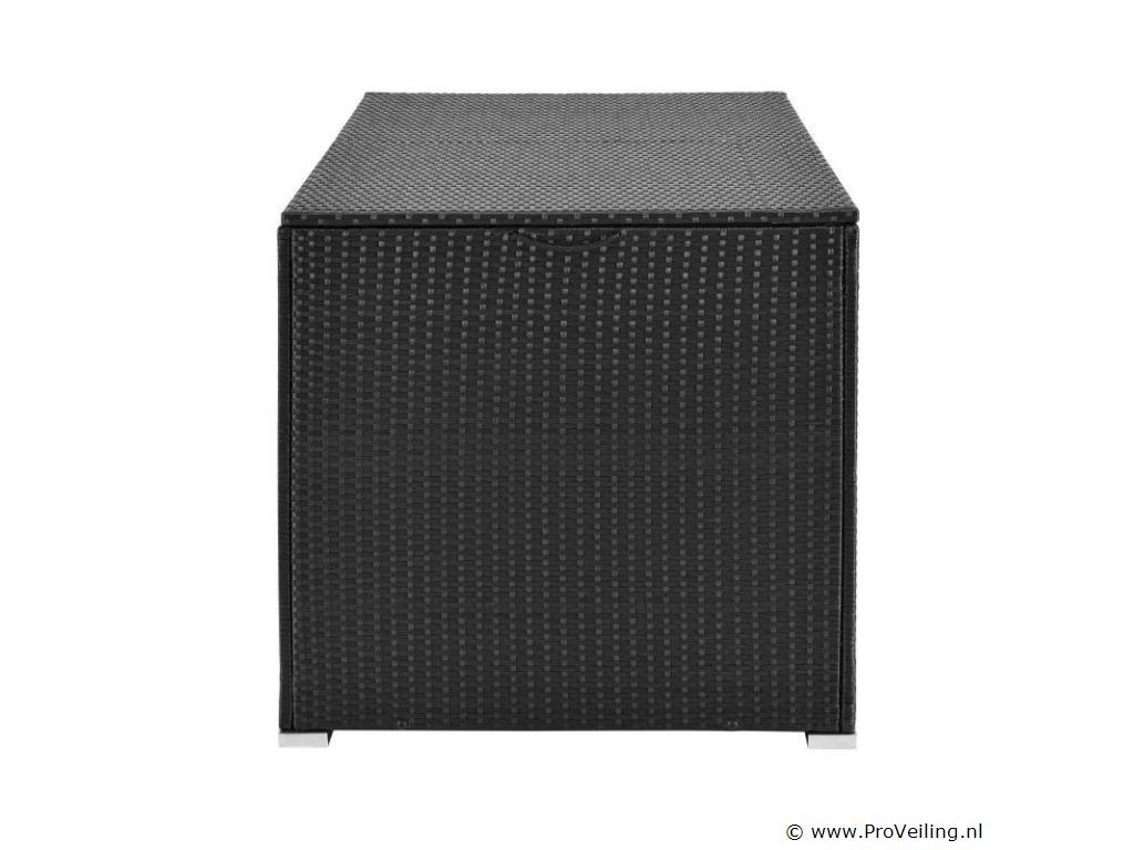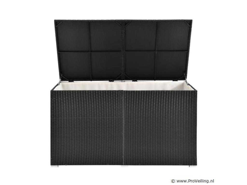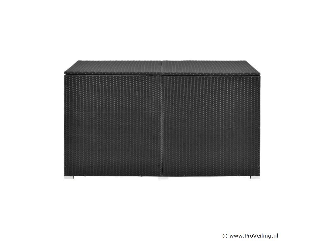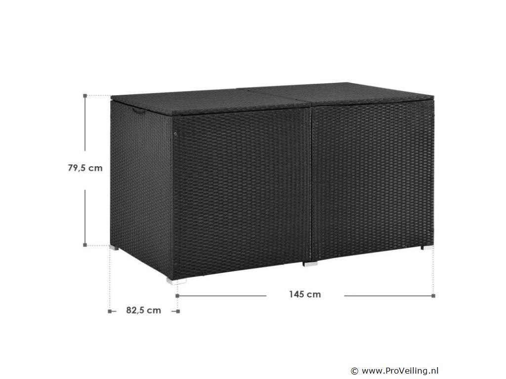 De polyrotan tuinmeubelbox Ikaria (950 L inhoud, zwart) biedt de perfecte opbergruimte voor je tuinspullen. Berg kussens, kussens of kinderspeelgoed netjes op in de tuinbox. Daar zijn de uitgaven optimaal beschermd. Het binnenzeil zorgt voor extra bescherming en het deksel houdt de box gesloten. Een automatisch hefmechanisme op het deksel maakt veilig sluiten mogelijk. De opbergbox is een echte eye-catcher. Of het nu buiten op het terras, het balkon, in de tuin of binnen in de serre is. De kast van polyrotan overtuigt door zijn moderne en stabiele stijl. Technische specificaties: Materiaal opbergdoos: polyrotan, staal Materiaal binnenzeil: polyester Kleur opbergdoos: zwart Kleur binnenzeil: wit Inhoud: 950 liter Vorm: Rechthoekig Deksel: versterkt, automatisch optillen Plaats van gebruik: binnen & buiten Poten: hoekvoet (4x), zijpoot (2x) Afmetingen (ongeveer): Lengte: 145cm Breedte: 82,5 cm Hoogte: 79,5 cm Leveringsomvang: 1 x paddoos 1 x binnenzeil 1 x Instructie Je ontvangt het product goed verpakt als bouwpakket voor zelfmontage per pakketdienst. De padbox is niet waterdicht. Plaats de box alleen op een weerbestendige of droge plaats.