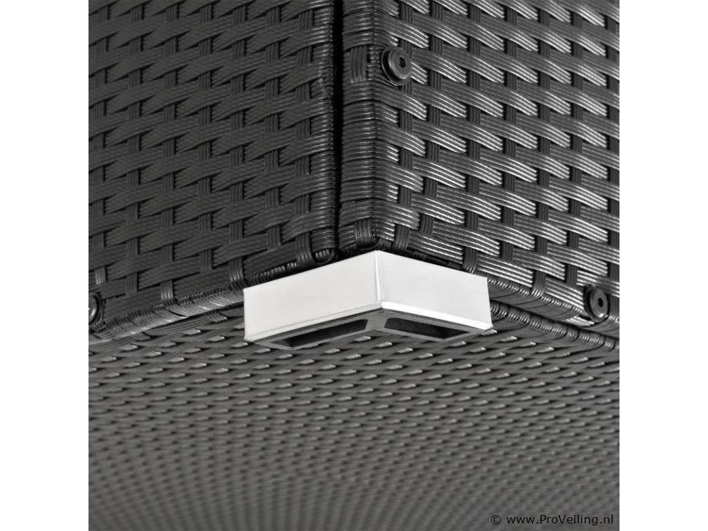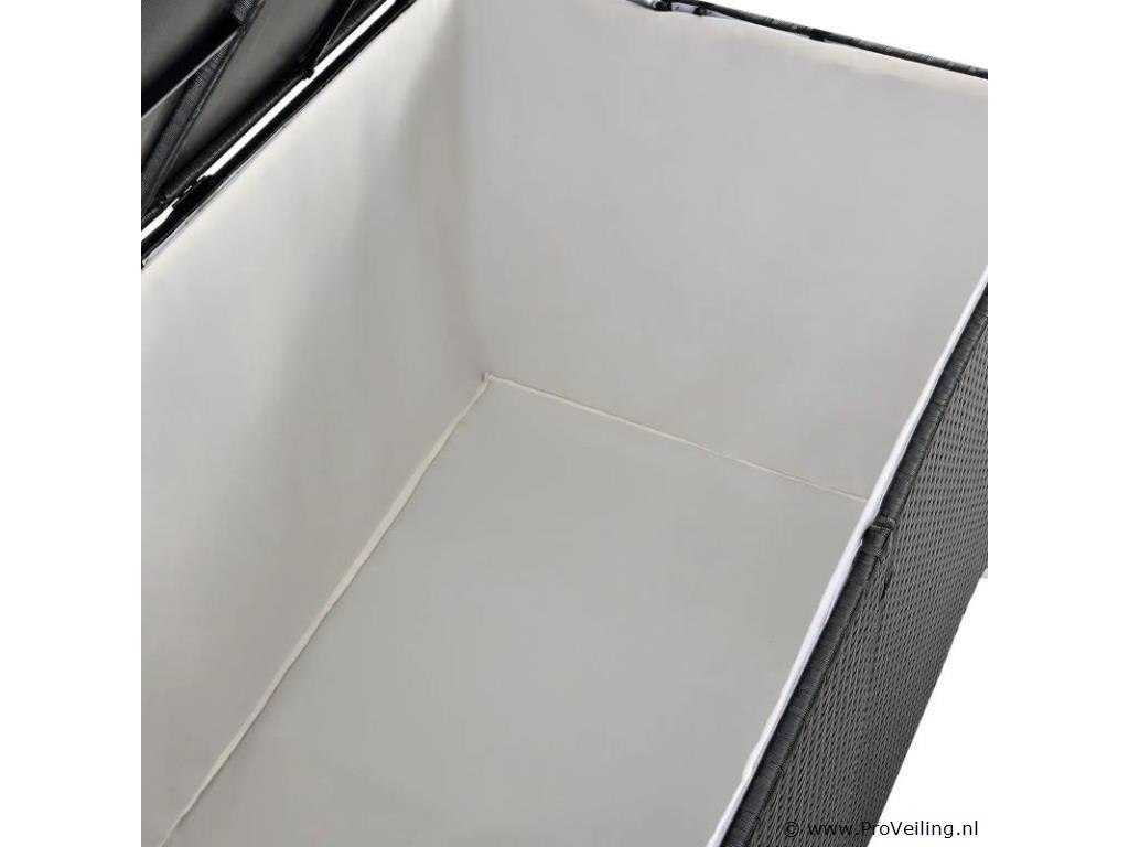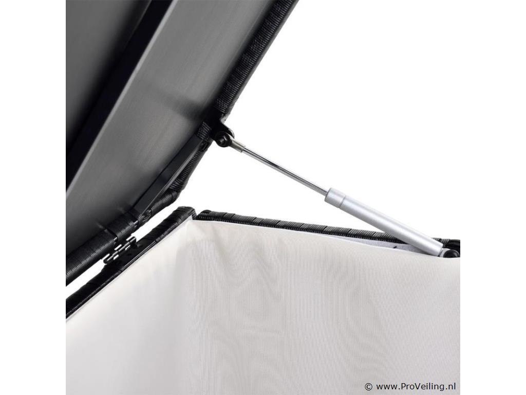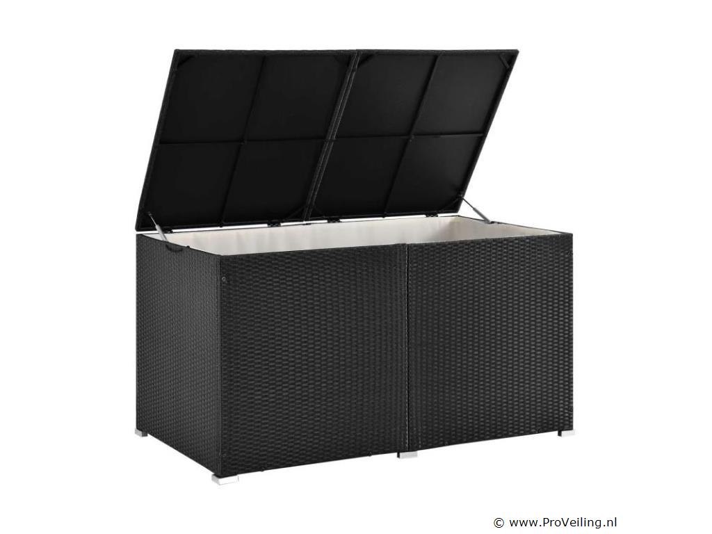 De polyrotan tuinmeubelbox Ikaria (950 L inhoud, zwart) biedt de perfecte opbergruimte voor je tuinspullen. Berg kussens, kussens of kinderspeelgoed netjes op in de tuinbox. Daar zijn de uitgaven optimaal beschermd. Het binnenzeil zorgt voor extra bescherming en het deksel houdt de box gesloten. Een automatisch hefmechanisme op het deksel maakt veilig sluiten mogelijk. De opbergbox is een echte eye-catcher. Of het nu buiten op het terras, het balkon, in de tuin of binnen in de serre is. De kast van polyrotan overtuigt door zijn moderne en stabiele stijl. Technische specificaties: Materiaal opbergdoos: polyrotan, staal Materiaal binnenzeil: polyester Kleur opbergdoos: zwart Kleur binnenzeil: wit Inhoud: 950 liter Vorm: Rechthoekig Deksel: versterkt, automatisch optillen Plaats van gebruik: binnen & buiten Poten: hoekvoet (4x), zijpoot (2x) Afmetingen (ongeveer): Lengte: 145cm Breedte: 82,5 cm Hoogte: 79,5 cm Leveringsomvang: 1 x paddoos 1 x binnenzeil 1 x Instructie Je ontvangt het product goed verpakt als bouwpakket voor zelfmontage per pakketdienst. De padbox is niet waterdicht. Plaats de box alleen op een weerbestendige of droge plaats.