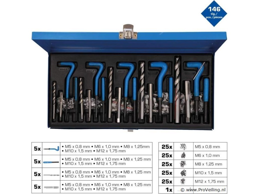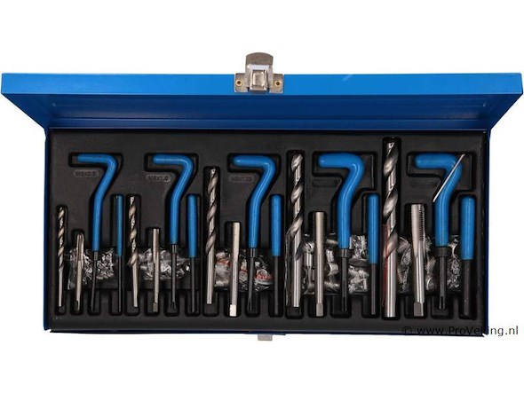 131-delige reparatieset voor binnendraad M5-M6-M8-M10-M12 Inbegrepen: 5 tangbrekers voor het verwijderen van de inschroeftangen 5 Insteekgereedschap voor het installeren van de reparatie-inserts 5 tikken 5 spiraalboren voor het uitboren van de defecte schroefdraad 110 draadinzetstukken in de volgende maten: 25 stuks elk: M5x0,8 - M6x1,0 - M8x1,25 - M10x1,5 10 stuks: M12x1,75 Schroefdraadreparatieset voor het repareren van beschadigde inwendige schroefdraad. Geschikt voor gescheurde schroefdraad op de motor en bougieschroefdraad in de cilinderkop. De metalen kast wordt in rood of blauw verzonden. Beschrijving: Boor de beschadigde schroefdraad uit met de spiraalboor. Knip een nieuwe draad af met de kraan. Daarna zetten ze de nieuwe schroefdraadhuls erin. Gebruik tot slot de tang breaking tool om de uitstekende tang af te breken. Plaats nu de nieuwe schroef zoals gewoonlijk.