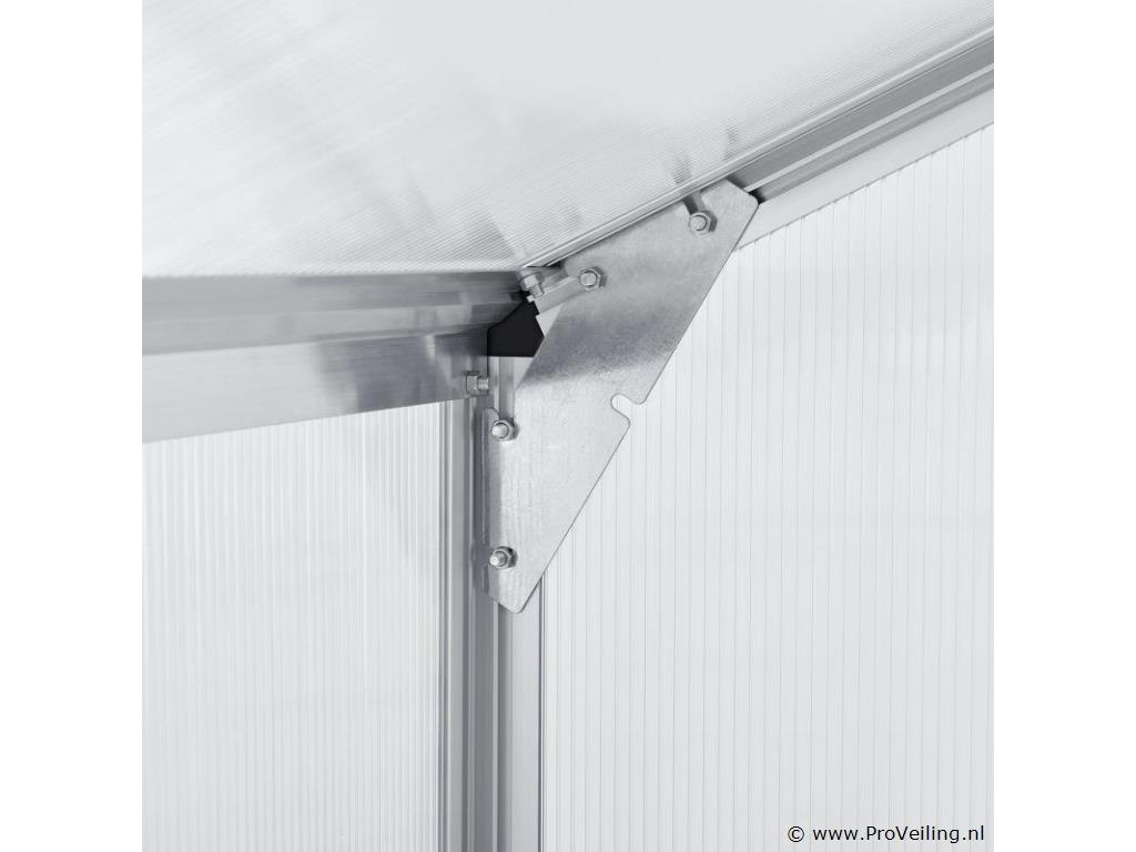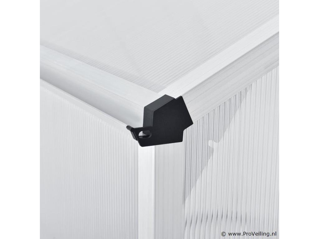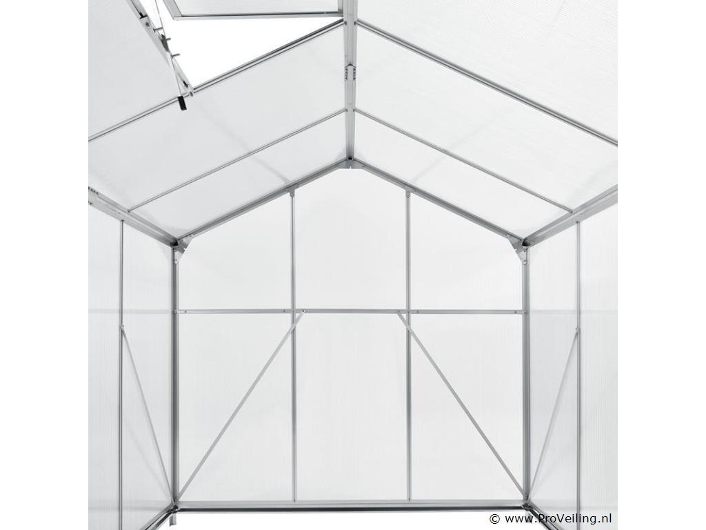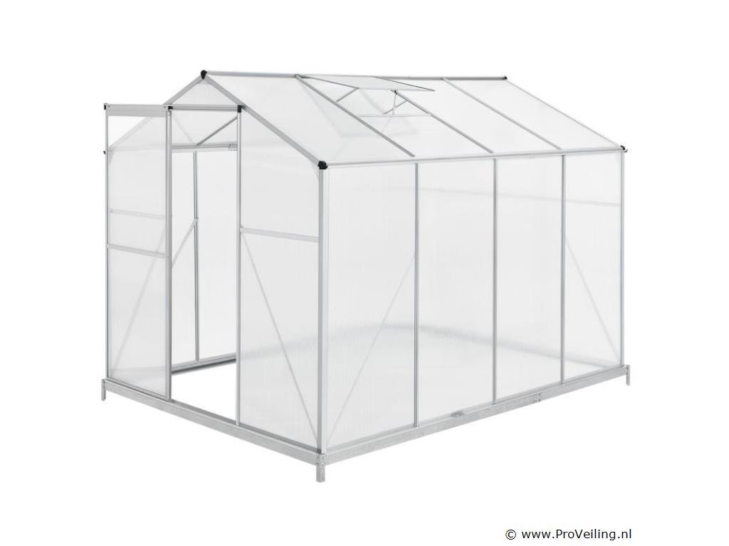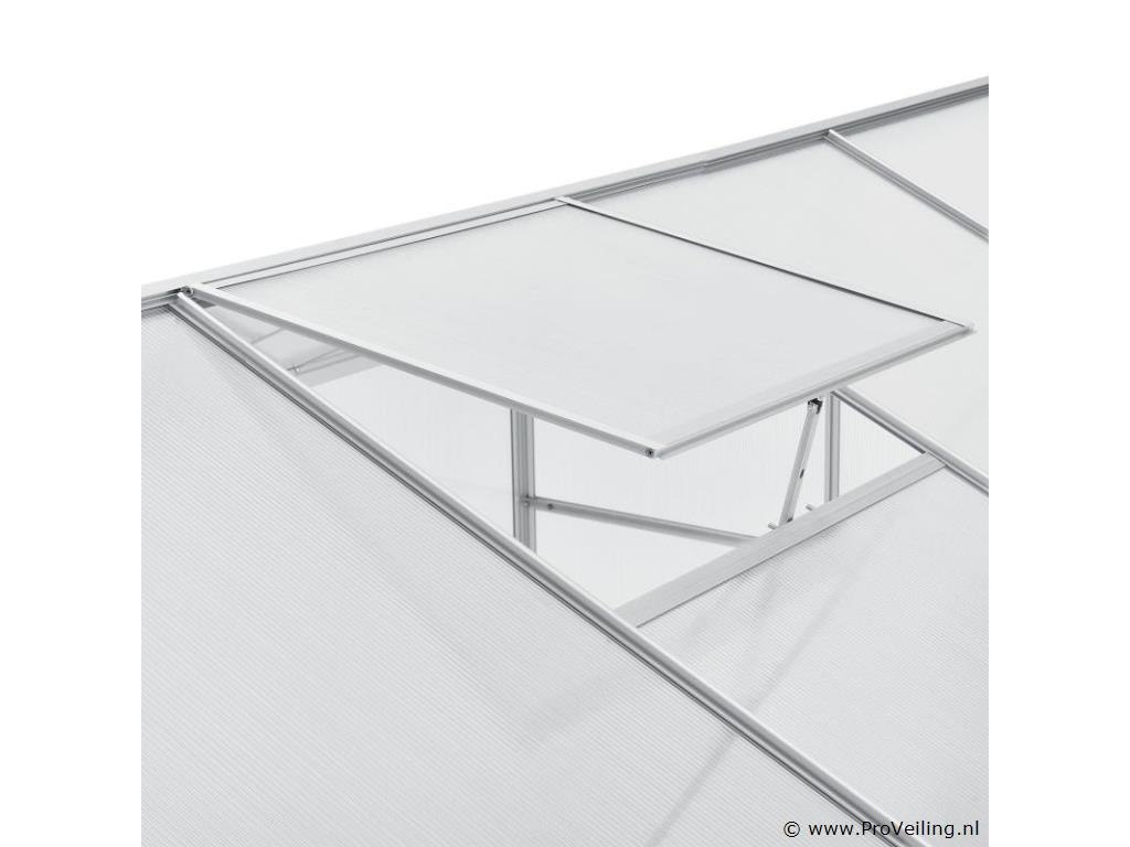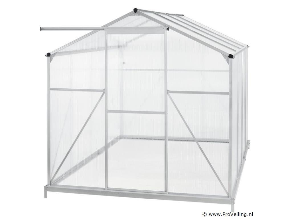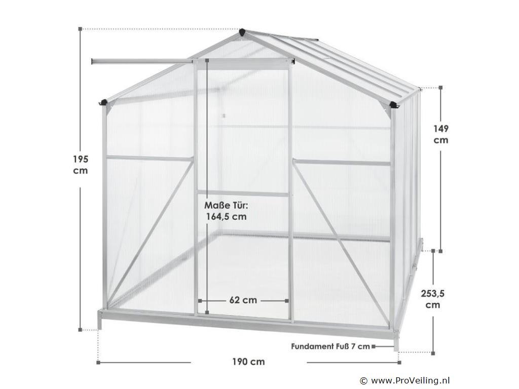 Heb je altijd al je eigen groente- of kruidenbed in je tuin willen creëren voor het kweken van tomaten, komkommers, kruiden of bloemen? Dan is deze aluminium serre met fundering en lichtkoepel de juiste keuze! De kas van 190 × 253 cm is te gebruiken als koelkas, tomatenhuis, plantenhuis of tuinhuisje. Met een vloeroppervlak van 4,75 m² biedt hij ook voldoende ruimte voor het kweken van groenten en fruit en voor het overwinteren van planten. Ideaal voor gepassioneerde hobbytuiniers. Technische specificaties: Materiaal broeikas: aluminium, polycarbonaat Materiaal fundering: staal, verzinkt Kleur lijst: zilver Kleur dubbelwandige platen: transparant Dikte van hollekamerbaanplaten: 4 mm Vloeroppervlakte: 4,75 m² Deur: 1 schuifdeur Ramen: 1 dakraam Kas: gegevensblad om te downloaden Afmetingen (ongeveer): Voetafdruk: 190 × 253 Paginahoogte: 149 Nokhoogte: 195 Voetenfundament: 7 Afmeting deur: 62 × 164 Afmeting raam: 51 x 59 Leveringsomvang: 1 × broeikas 1 × montage-instructies