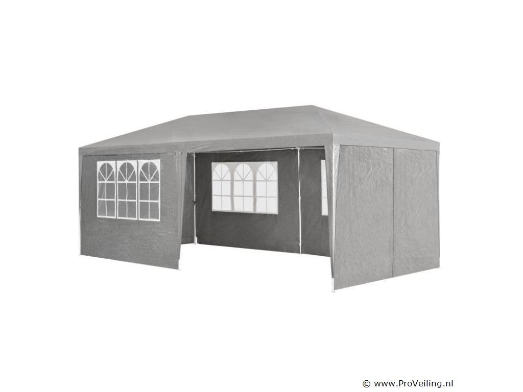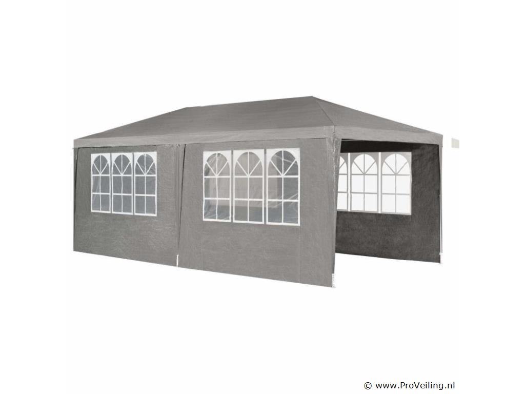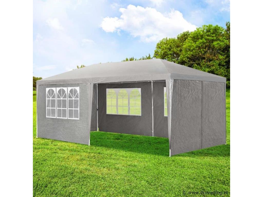 De partytent van 3 x 6 m (grijs) is de perfecte zonwering voor alle soorten buitenevenementen Of het nu gaat om een ??barbecue, een verjaardag of een bruiloft - het praktische paviljoen nodigt uit om samen te zitten en feest te vieren met familie en vrienden. Onder de feesttent zijn u en uw gasten goed beschermd tegen de brandende zon. 's Avonds dienen de uitneembare zijpanelen als extra bescherming tegen koele tocht en muggen. Optimale voorwaarden om speciale gelegenheden uitgebreid te vieren in eigen tuin of op het terras. Technische specificaties: Materiaal frame: staal, gepoedercoat (100%) Materiaal dak: 100 g/m² polyethyleen (100%) Materiaal zijdelen: 90 g/m² polyethyleen (100%) Kleur tuintent: grijs Zijwand met raam: 4 Zijpaneel met ritssluiting: 2 Aantal voeten: 6 Aantal bevestigingstouwen: 6 Aantal grondpennen: 12 Afmetingen (ongeveer): Breedte: 300cm Diepte: 600 cm Hoogte: 250cm Paaldak: Ø 1,8 cm Plaatbodem: Ø 2,4 cm Leveringsomvang: 1 × feesttent 1 × montage-instructies tips: LET OP: Het tuinpaviljoen biedt onvoldoende bescherming bij storm of slecht weer. Niet gebruiken tijdens onweer, sterke windstoten, zware regenval of hagel. Het paviljoen is niet ontworpen voor dit weertype. Alleen geschikt voor privégebruik. Zet de partytent veilig op een vlakke, droge en stevige ondergrond. Houd de minimale afstand van 3 m tot de volgende tent aan. Het is niet mogelijk om 2 tenten aan elkaar te koppelen.