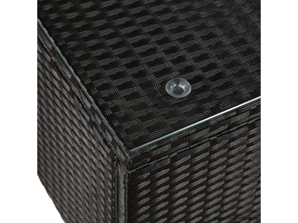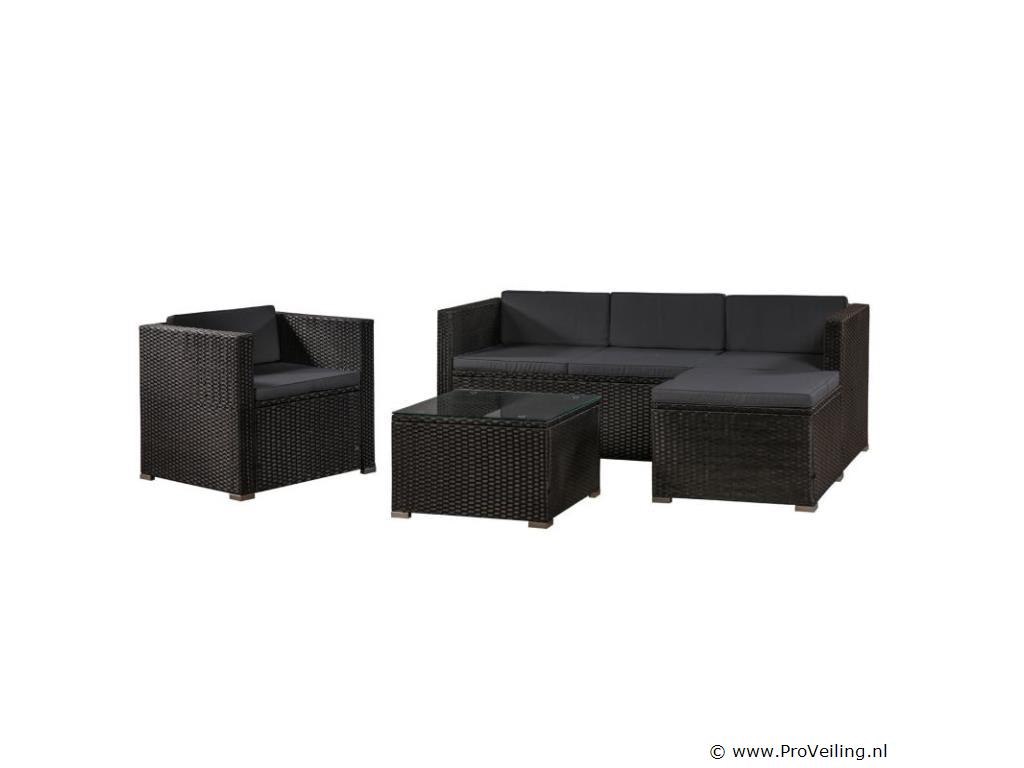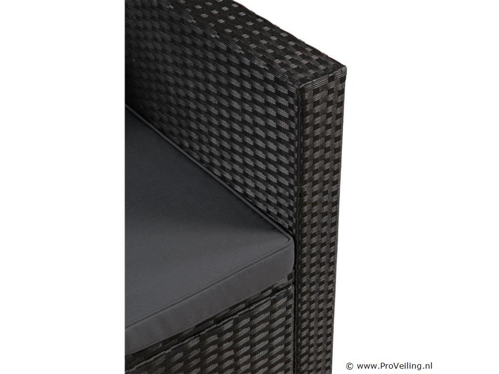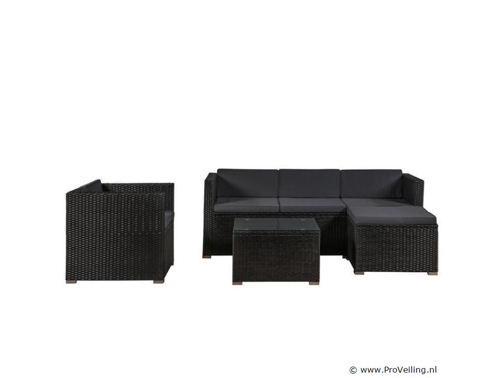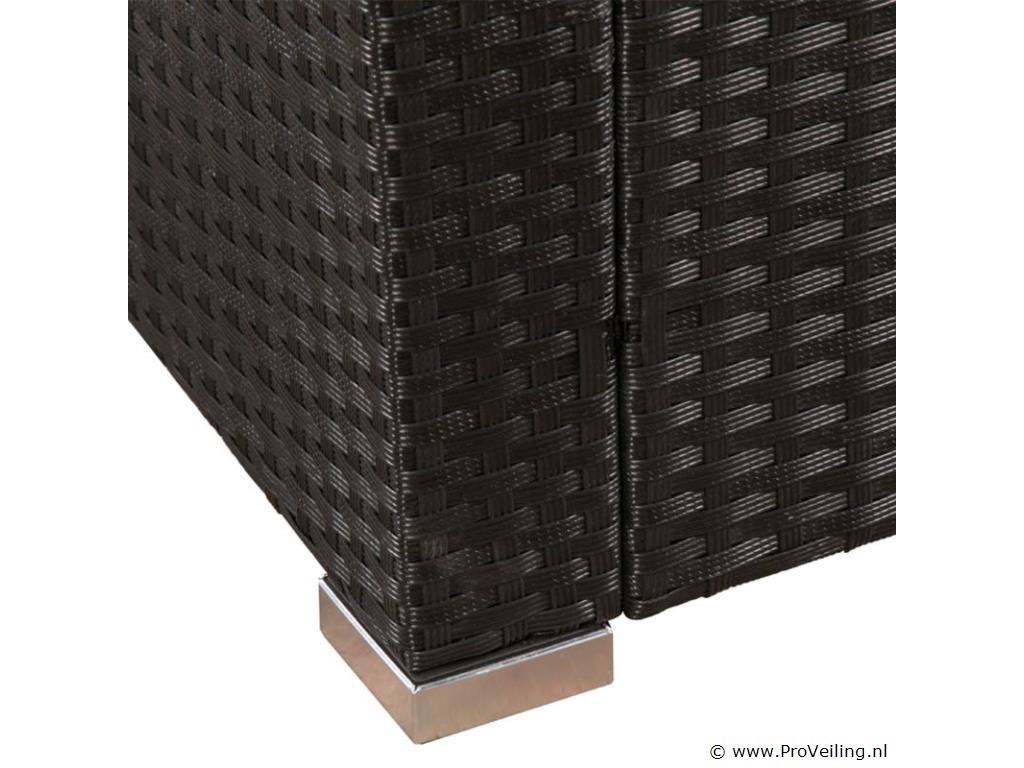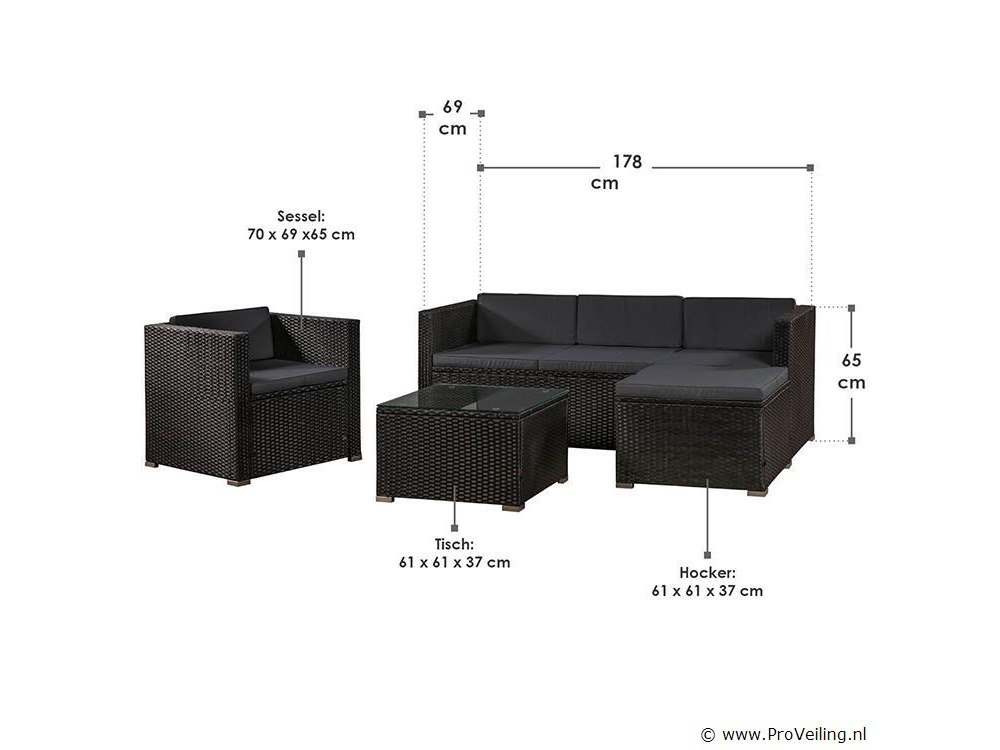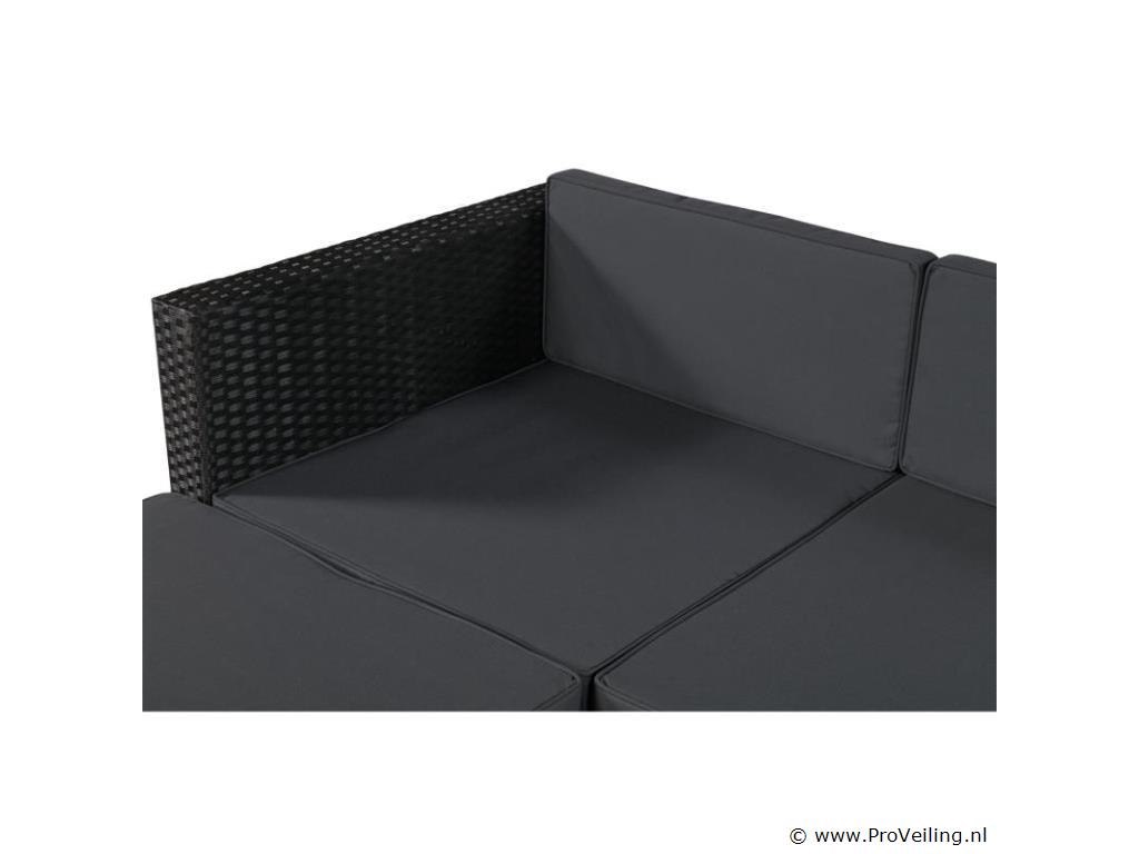 Ben je op zoek naar een comfortabele en grote loungeset voor in je tuin, terras of balkon? Met de zitset "Punta Cana L" verander je je buitenruimte in een stijlvolle plek om te ontspannen en je goed te voelen. Gezellige avonden met familie, vrienden of buren worden een belevenis in de buitenlucht. De unieke rotan look in zwart met grijze vulling geeft je nieuwe loungemeubel een moderne charme. Creëer je eigen oase van welzijn om te ontspannen en samen te zitten. Technische specificaties: Materiaal: Weefsel: polyrotan vezels Basis: staal Tafelblad: glas Hoezen: schuim, polyester Kleur: Vlecht: zwart Tafelblad: helder Kussenslopen: donkergrijs Afmetingen (ongeveer): Tafel: 61 × 61 × 37 cm (L x B x H) Hoekbank: 178 × 69 × 65 cm (L x B x H) Fauteuil: 70 × 69 × 65 cm (L x B x H) Kruk: 61 × 61 × 37 cm (L x B x H) Dikte zitkussen: 5 cm Dikte glasplaat: 0,5 cm Breedte rugkussen: 54 cm Zitkruk: 60 × 60 cm Leveringsomvang: 1x tafel 1 x hoekbank 1 x fauteuil 1 x kruk 5 x zitkussens 4 x rugkussens 1 x montage-instructies Let op: U ontvangt het product goed verpakt als bouwpakket voor zelfmontage per pakketdienst. Dit artikel bestaat uit 2 dozen, het kan logistiek voorkomen dat het in meerdere dagen geleverd wordt.