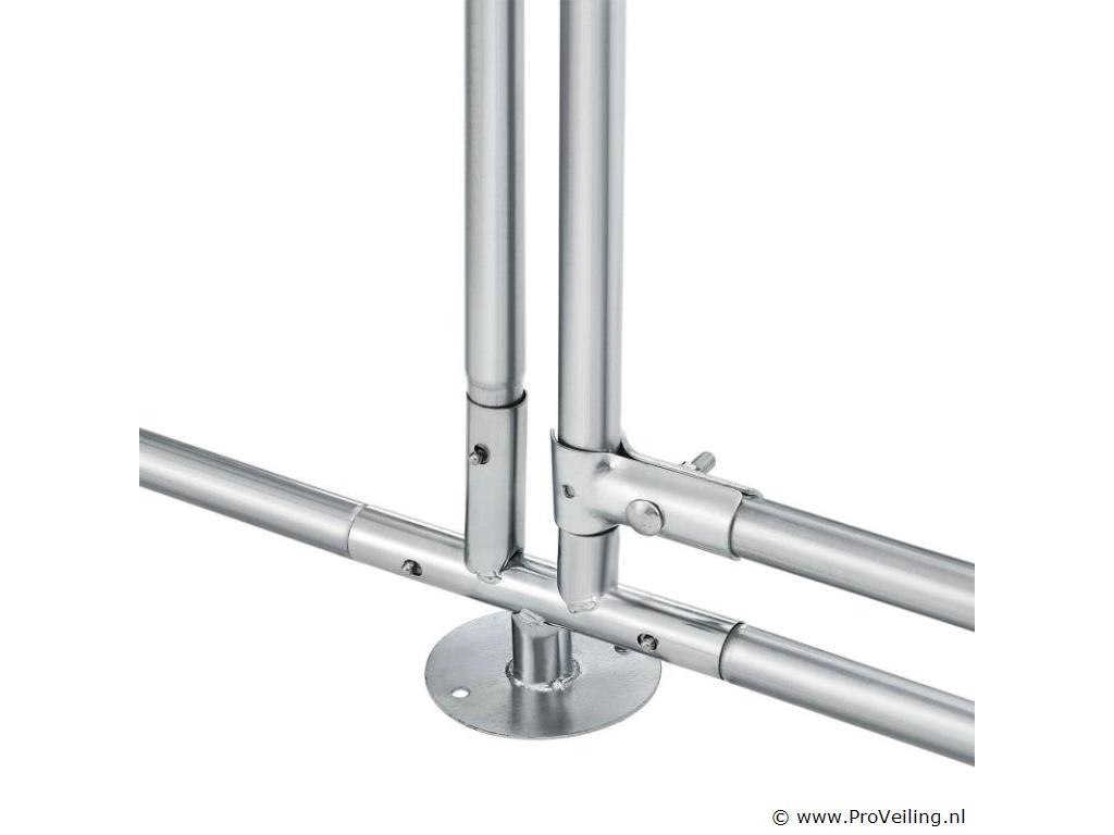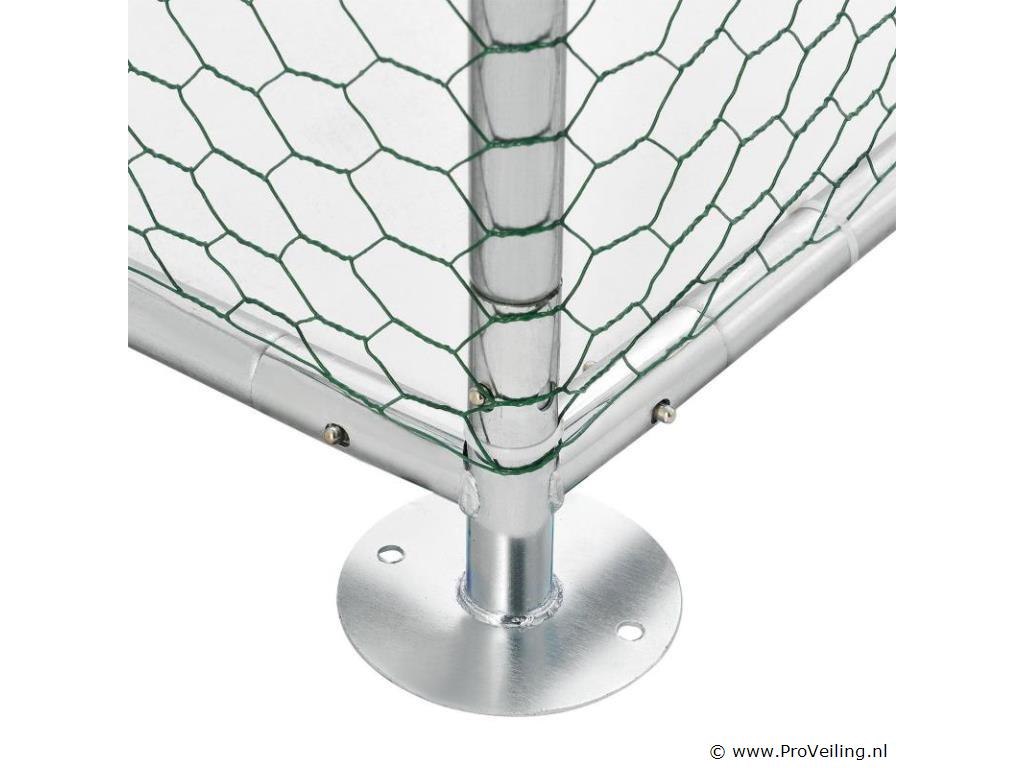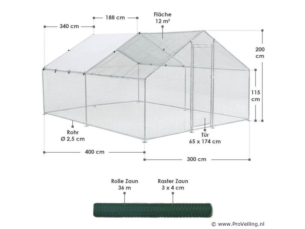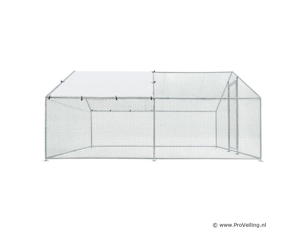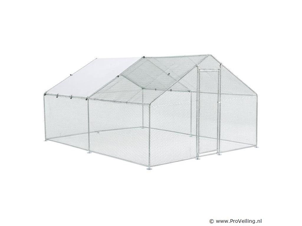 Ben je zelfvoorzienend of heb je een uitlaatklep nodig voor de trend “houd de kippen in de tuin”? Het buitenverblijf HLS25T van 3x4x2 m is perfect voor het soortspecifiek buiten houden van dieren. In de gegalvaniseerde box voor kippen, konijnen en ganzen hebben kleine dieren buiten genoeg ruimte op 12 m². Planten zijn hier ook beschermd en droog. Je bevestigt het waterdichte zeildoek flexibel aan het frame. Door de gegalvaniseerde buizen en het PVC-gecoate hek heb je een stabiel en duurzaam kippenhok dat je eenvoudig in elkaar zet door middel van het plug-and-click systeem. Technische specificaties: Materiaal draad: galvanisch verzinkt ijzer, PVC gecoat, zeshoekig (vorm) Materiaal palen: gegalvaniseerd ijzer Materiaal dekzeil: PE (waterdicht, regenbescherming), materiaal accessoires: kunststof Boxkleur: zilver, grijs (frame), wit (zeildoek), groen (net) Geschikt voor: kleine dieren zoals kippen, konijnen, ganzen, eenden & planten (bijv. gewassen, bloemen) Bijzonderheden: Toegankelijk via hoge deur, met poortgrendel, zeildoek Boxvorm: Vierkant Plaats van gebruik: buiten Afmetingen (ongeveer): Totale afmetingen van de volière: 300 x 400 x 200 cm (BxLxH), 385 cm (exacte lengte) Buitenruimte: 12 m² Hoogte dak: 115 - 200 cm Deur: 55 x 158 cm (BxH) Buisdiameter: 2,5 cm, dikte: 1 mm Rasterhek: 3 x 4 cm (BxH), dikte: 0,5 mm Dekzeil: 340 x 195 cm (BxH) Rol kippennet: 1 x 36m Leveringsomvang: 1 x Ren 1 x rol kippenhek 1 x dakzeil 1 x deur met vergrendeling 1 x Instructie Let op: Alleen geschikt voor kleine dieren zoals kippen, konijnen, ganzen, eenden & planten. Vraag: Kan ik meerdere producten aan elkaar koppelen? Nee. Kan de deur rechts of links worden geopend? We raden aan om ze links te monteren, rechts kan ook. De box is afsluitbaar met een grendel. Er is geen slot met sleutel, het wordt met de hand geopend en gesloten. Het PE dekzeil (waterdicht) heeft geen zonwerende functie, maar dient als regenwering. Je bevestigt het dekzeil flexibel aan de palen door middel van de elastische banden.
