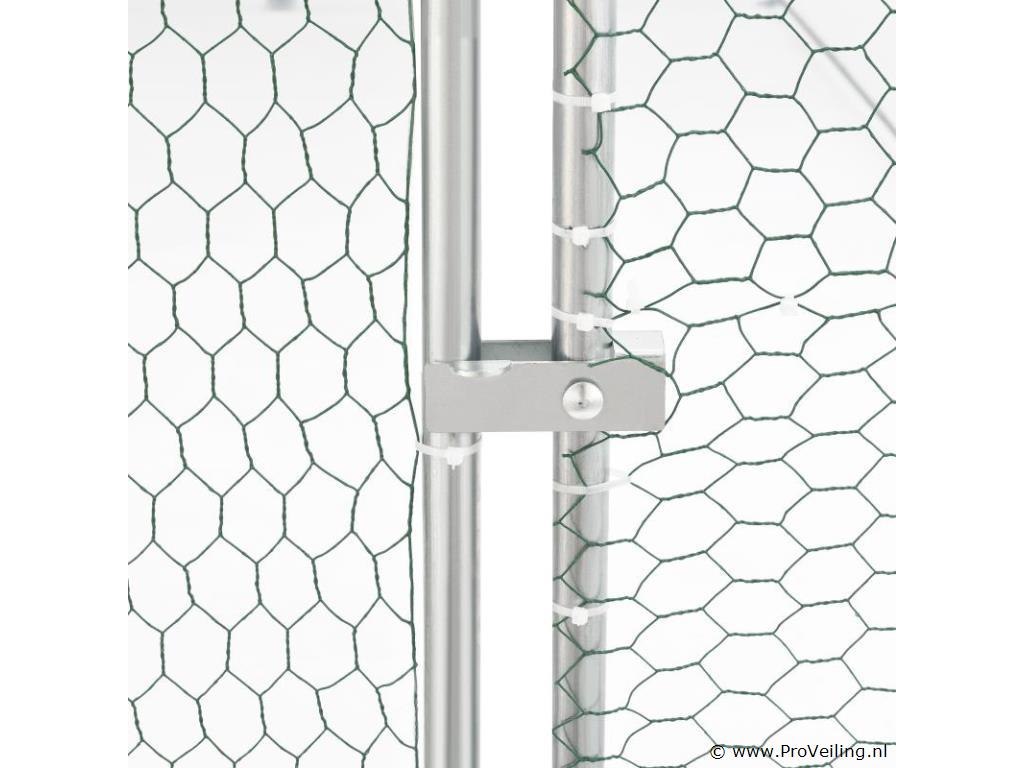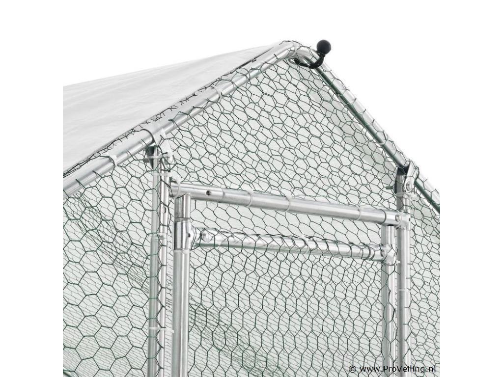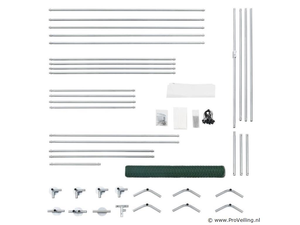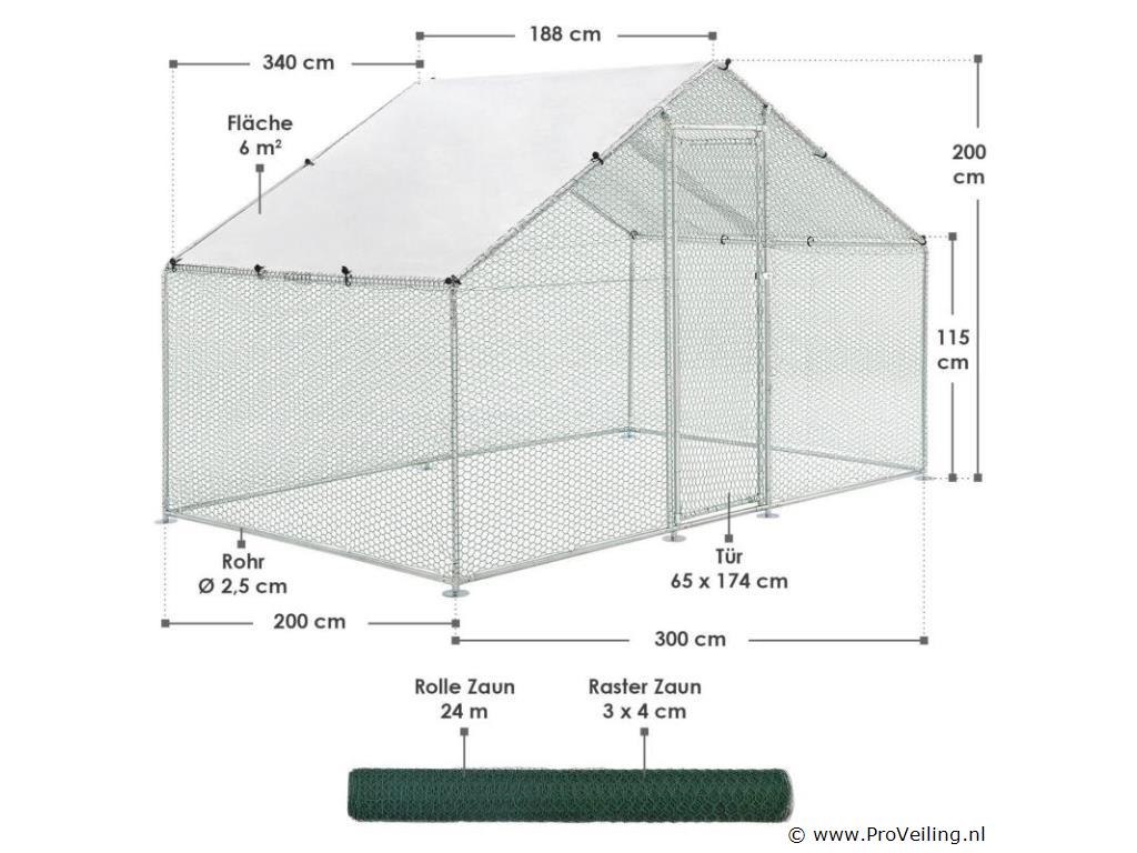 Ben je zelfvoorzienend of heb je een uitlaatklep nodig voor de trend “houd de kippen in de tuin”? Het buitenverblijf HLS25T van 3x2x2 m is perfect om dieren op een soortspecifieke manier buiten te houden. In de gegalvaniseerde box voor kippen, konijnen en ganzen hebben kleine dieren op 6 m² genoeg buitenruimte. Planten zijn hier ook beschermd en droog. Je bevestigt het waterdichte zeildoek flexibel aan het frame. Door de gegalvaniseerde buizen en het PVC-gecoate hek heb je een stabiel en duurzaam kippenhok dat je eenvoudig in elkaar zet door middel van het plug-and-click systeem. Technische specificaties: Materiaal draad: galvanisch verzinkt ijzer, PVC gecoat, zeshoekig (vorm) Materiaal palen: gegalvaniseerd ijzer Materiaal dekzeil: PE (waterdicht, regenbescherming), materiaal accessoires: kunststof Boxkleur: zilver, grijs (frame), wit (zeildoek), groen (net) Geschikt voor: kleine dieren zoals kippen, konijnen, ganzen, eenden & planten (bijv. gewassen, bloemen) Bijzonderheden: Toegankelijk via hoge deur, met poortgrendel, zeildoek Boxvorm: Vierkant Plaats van gebruik: buiten Buitenverblijf 2x3 m: datablad om te downloaden Afmetingen (ongeveer): Totale afmetingen van de volière: 300 x 200 x 200 cm (BxLxH) Oppervlakte buitenruimte: 6m² Hoogte dak: 115 - 200 cm Deur: 65 x 174 cm (BxH) Buisdiameter: 2,5 cm, dikte: 1 mm Rasterhek: 3 x 4 cm (BxH), dikte: 0,5 mm Dekzeil: 340 x 188 cm (BxH) Rol kippennet: 1 x 24m Leveringsomvang: 1 x Kippenren 1 x rol kippenhek 1 x dakzeil 1 x deur met vergrendeling 1 x Instructie Let op: Alleen geschikt voor kleine dieren zoals kippen, konijnen, ganzen, eenden & planten. Vraag: Kan ik meerdere producten aan elkaar koppelen? nee Kan de deur rechts of links worden geopend? We raden aan om ze links te monteren, rechts kan ook. De box is afsluitbaar met een grendel. Er is geen slot met sleutel, het wordt met de hand geopend en gesloten. Het PE dekzeil (waterdicht) heeft geen zonwerende functie, maar dient als regenwering. Je bevestigt het dekzeil flexibel aan de palen door middel van de elastische banden.
