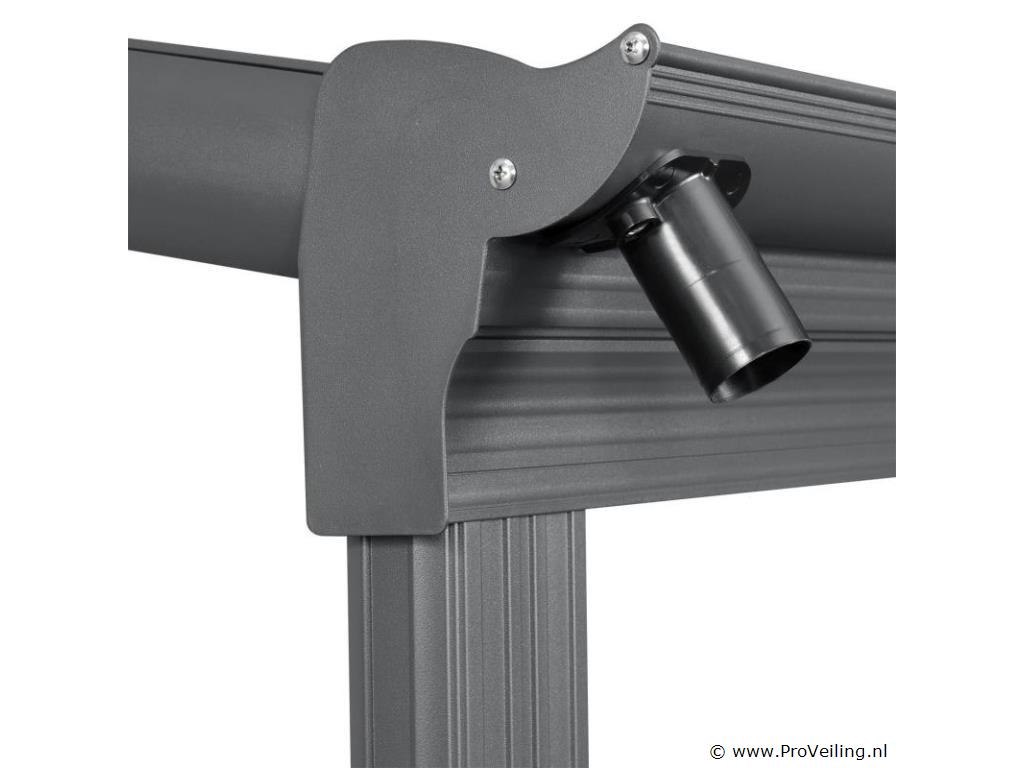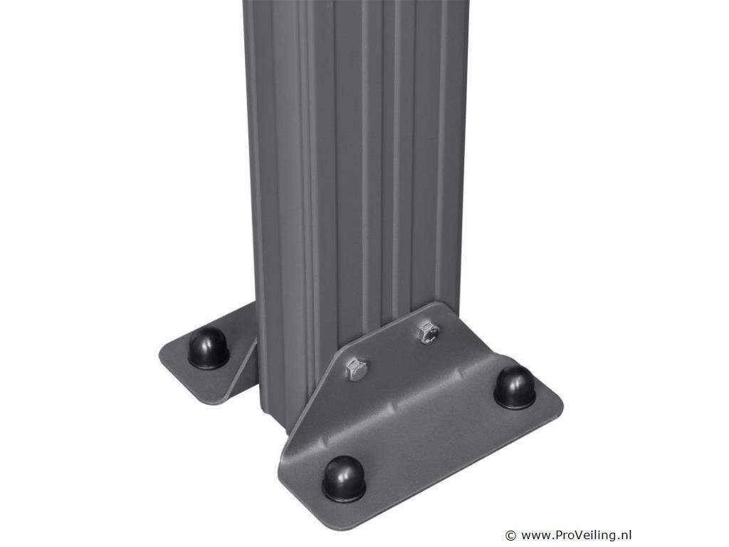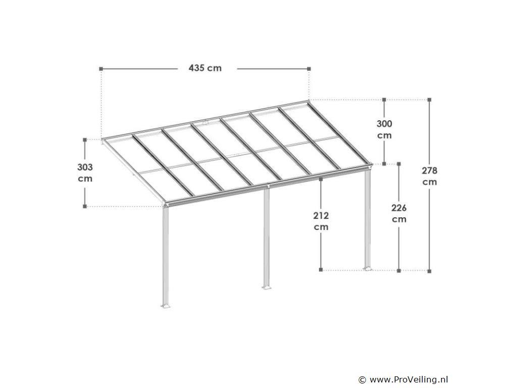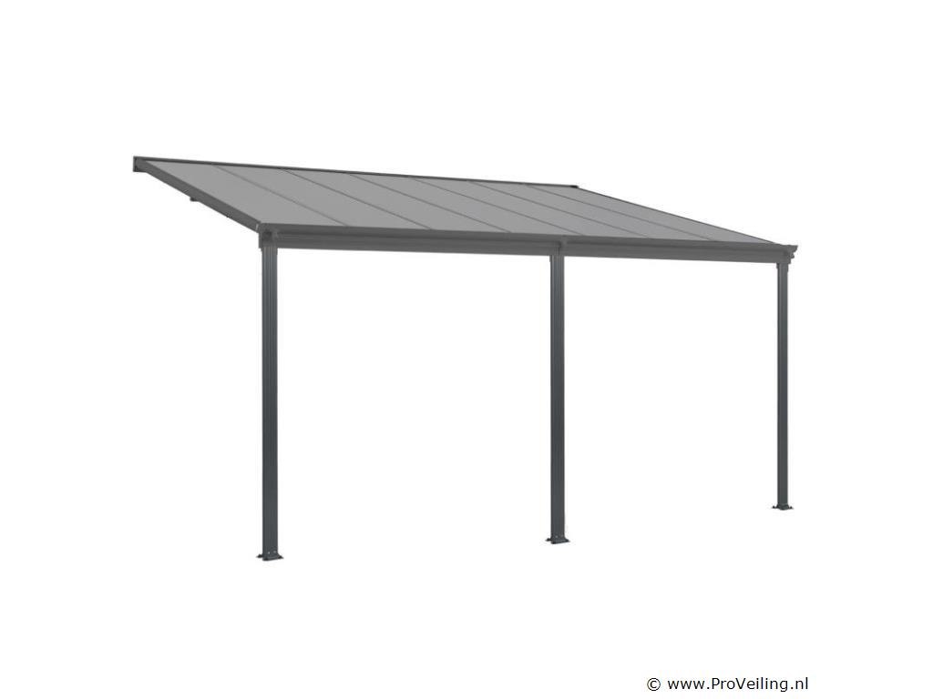 Bent u op zoek naar een moderne, stabiele en hoogwaardige zonwering? De 4×3 m aluminium terrasoverkapping Borneo (antraciet) is de perfecte overkapping voor uw terras. Door de robuuste metalen constructie en de elegante uitstraling dient het dak jarenlang als stijlvolle zonwering. Of het nu gaat om de felle zon of een regenbui - de terrasoverkapping biedt u bescherming tegen regen en schadelijke UV-straling. Zo breng je je vrije tijd altijd ontspannen buiten door. Want met de betrouwbare overkapping ben je goed beschermd! Tegelijkertijd beschermt het ook je geliefde tuinmeubelen tegen weersinvloeden. Technische specificaties: Materiaal frame: aluminium gepoedercoat Materiaal aansluitingen: verzinkt staal Materiaal dak: polycarbonaat met UV-coating Kleur frame & webplaten: donkergrijs Aantal berichten: 3 Aantal regengoten: 2 Aantal kanaalafvoer: 3 Dakdruk draagvermogen: 70 kg/m2 Windkracht: Tot 100 km/u (windkracht 10) Afmetingen (ongeveer): Breedte: 435cm Diepte: 303 cm Hoogte voorkant: 212 cm Hoogte voorzijde: 226 cm Hoogte achter: 278 cm Metaaldikte: 1 mm Dikte dubbelwandige platen: 6 mm Afmetingen paal: 4 x 10 cm Leveringsomvang: 1 x terrasoverkapping 1 x instructie