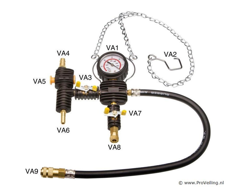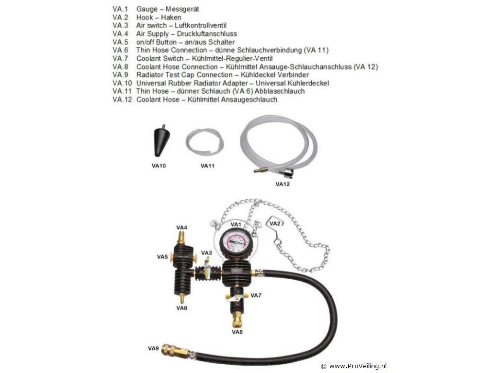 28-delige koelsysteemtester Radiatordruktester Set met gebruikslijst in kunststof koffer Door druk op te bouwen met de handpomp, Koelsystemen van een breed scala aan voertuigtypen kunnen worden getest. Compleet met diverse adapters, zie foto voor de verschillende items. Specificatie van de vacuümkoelsysteem KIT: 1. Manometer 2. Haak 3. Persluchtschakelaar 4. Persluchttoevoer 5. Aan/uit-knop 6. Dunne slangaansluiting (afvoerlucht) 7. Koelvloeistofschakelaar 8. Koelvloeistofslang, aansluiting voor slang #12 9. Koelertest - aansluiting deksel 10. Universele rubberen radiateuradapter 11. dunne slang voor afvoerlucht 12. Koelvloeistofslang voor het bijvullen van koelvloeistof