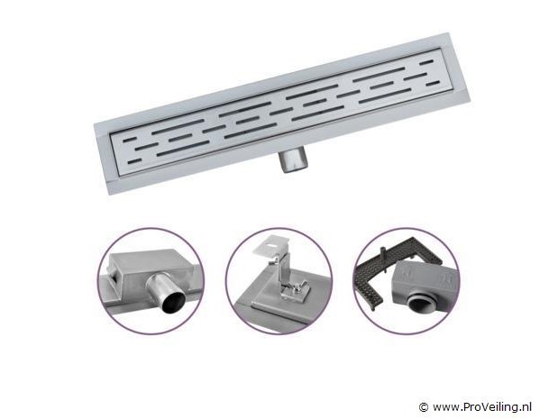 Een design bovenrooster uit RVS naar keuze Een uitneembare kunststof sifon (gemakkelijk te reinigen) Kunststof haarrooster Zij-aansluiting van 40 mm PVC aansluitmof van 40 naar 50 mm Rondom voorzien van een flens (20 mm) Waterkerend membraan voor waterdichte montage De douchegoten hebben een gemiddelde capaciteit van 30 L/min