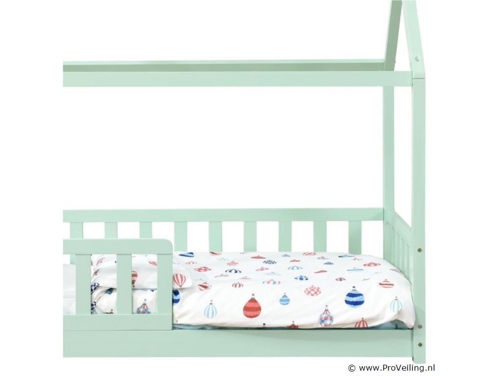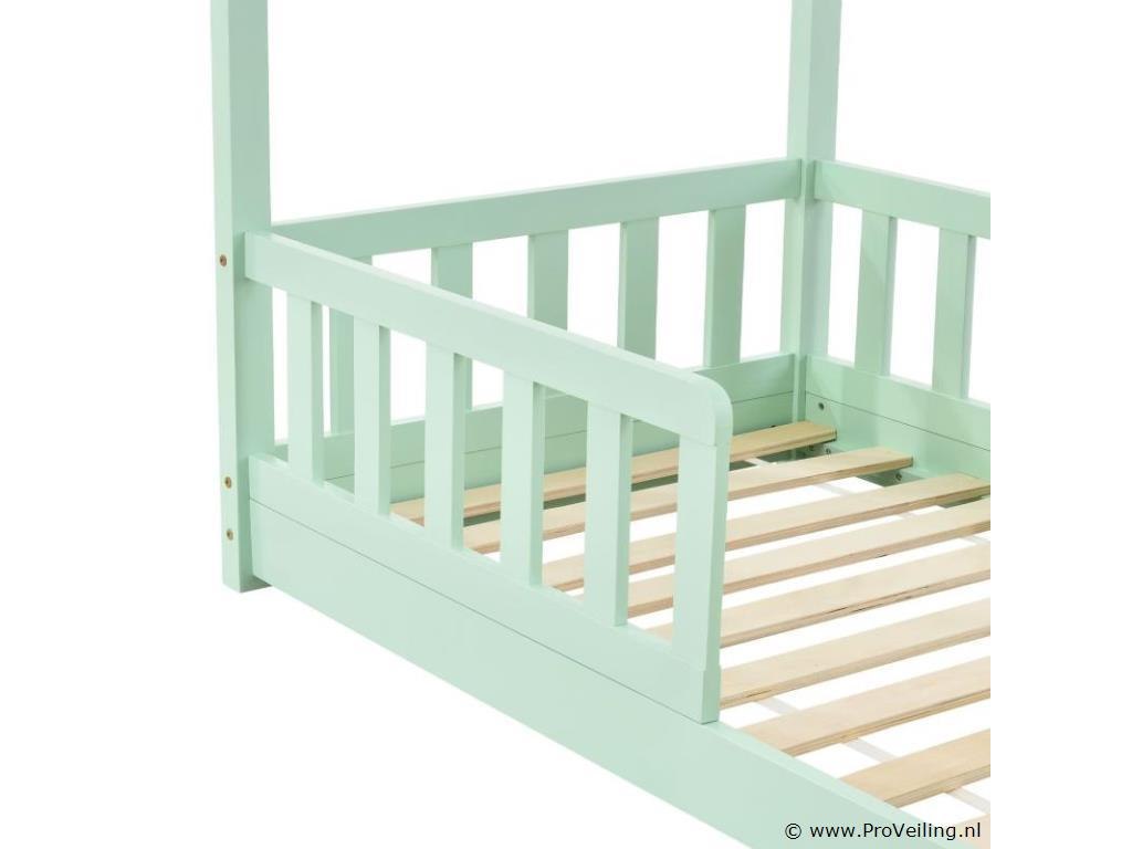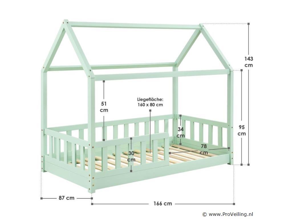 Het moderne kinderbed Marli (160x80 cm, mint) met valbeveiliging, lattenbodem en dak is ideaal voor meisjes en jongens van 3 tot 10 jaar. Als gezellige slaap- en speelplek verfraait het huisbed elke kinderkamer. Want de woninglook met open dak biedt veel mogelijkheden! Ontwerp het bed met baldakijndecoratie, als hol of avontuurlijk speelbed. Zeker voor jonge kinderen biedt een poortje meer bescherming en veiligheid. Het houten bed is de juiste keuze voor langdurig gebruik dankzij het stevige en onderhoudsvriendelijke grenenhout. Technische specificaties: Materiaal frame: grenen hout Materiaal lattenbodem: hout, 11 latten Kleur: mint Afmeting: 80x160cm Maximale belasting: 120 kg Matras: zonder Afmetingen (ongeveer): Totale afmetingen (BxLxH): 87 x 166 x 143 cm Ligoppervlak: 160x80 cm Leveringsomvang: 1 × kinderbed 1 × lattenbodem 1 × dak 1 × Montage-instructies