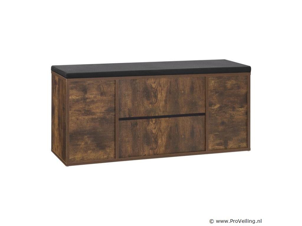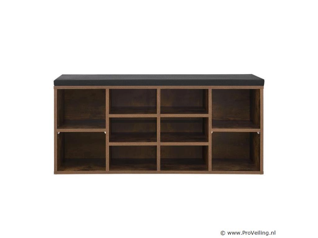 Het grote houten schoenenrek combineert praktische opbergruimte met comfortabel zitten. Of het nu in de gang, de keuken of in het woongedeelte is, de 10 vakken van verschillende grootte bieden voldoende ruimte voor gewone schoenen, hoge hakken en wandelschoenen. Als alternatief kan de kast ook worden gebruikt als voorraadkast of voor het opbergen van speelgoed, boeken of verzamelobjecten. De comfortabele en afneembare bekleding verandert de plank in een gezellige bank om te vertoeven of om je schoenen aan en uit te trekken. Zonder zitkussen dient de bank als lowboard voor de tv of kan met wat decoratie mooi worden geënsceneerd. Technische specificaties: Materiaal plank: spaanplaat E1 (melamine gecoat) Materiaal bekleding: stof Kleur plank: antiek bruin Kleur bekleding: zwart Maximaal draagvermogen: 150 kg Afmetingen (ongeveer): Totale afmetingen (LxBxH): 104 x 30 x 48 cm Brede vakken: 24 cm Diepe vakken: 30 cm Hoogte vakken: 6 x 13 cm | 4*20cm Houtdikte: 1,5 cm Paddikte 2,5 cm Leveringsomvang: 1 × schoenenrek 1 × kussen 1 × montage-instructies