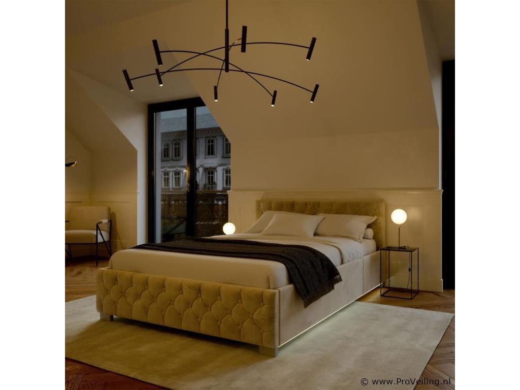 Het gestoffeerde bed Nizza combineert stijlvol Chesterfield-stikwerk met moderne, indirecte ledverlichting. Dankzij de zachte vulling met fluwelen hoes dient het hoge hoofdeinde als comfortabele rugleuning. De verende lattenbodem en de grote bedstee maken het comfortabele slaapkamermeubilair compleet. Technische specificaties: Materiaal lijst: MDF-hout Materiaal bekleding: fluweel Kleur hoes: beige Kleur voetjes: zilver Lichtkleur: wit Draagvermogen: 250 kg Afmetingen (ongeveer): Afmetingen staand: 128x216 cm Hoogte hoofdeinde: 83 cm Hoogte bedframe: 36 cm Hoogte voeten: 6 cm Ligvlak: 120x200 cm Leveringsomvang: 1 × gestoffeerd bed 1 × lattenbodem 1 × Instructie