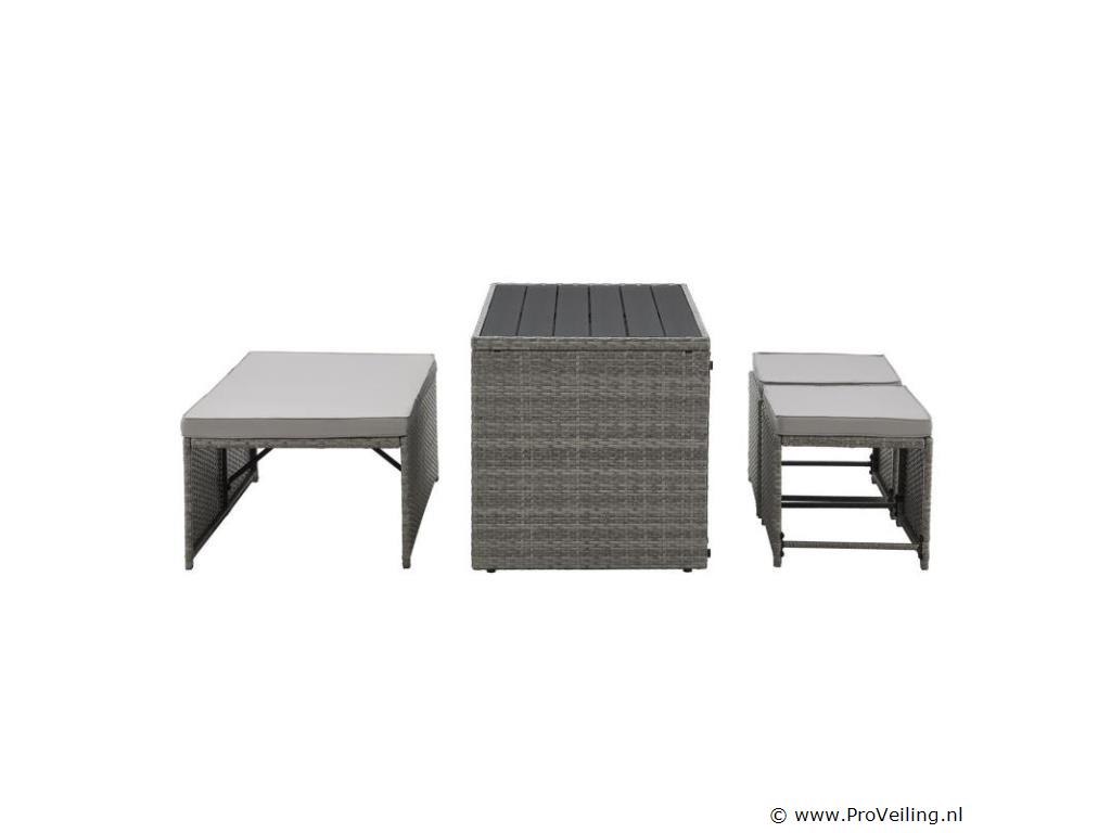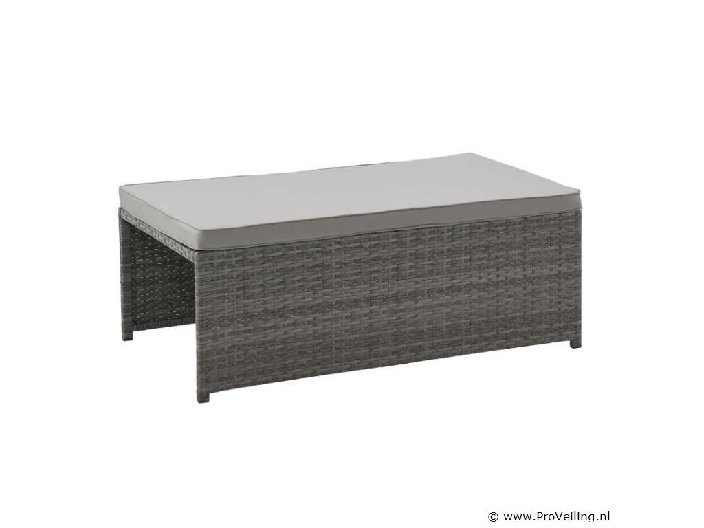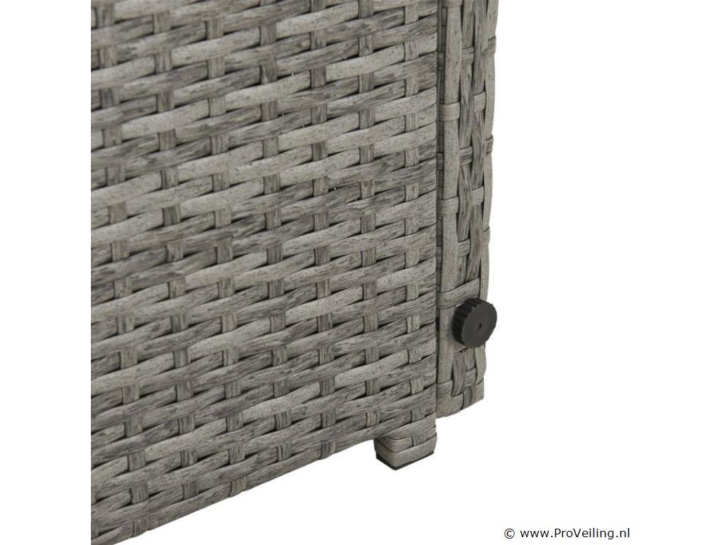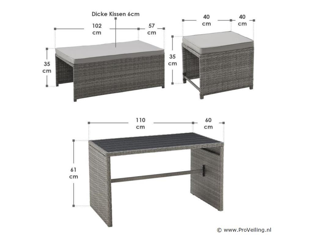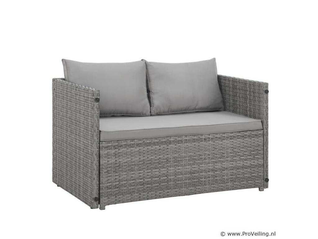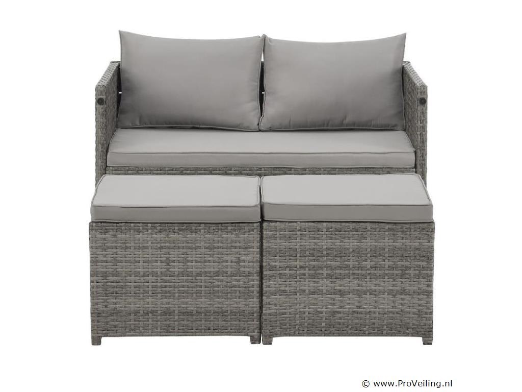 De 2in1 polyrotan Relax tuinmeubel Jamaica in grijs bestaat uit een tafel, bank en krukken. Gebruik de set als comfortabele bank of als zithoek met tafel. De bank doet ook dienst als bank en tafel als je de tafel 90 graden draait. De multifunctionele zitgroep voor 2 tot 4 personen is vooral geschikt waar weinig ruimte is, zoals voor een klein balkon, tuin of op de camping. De moderne lounge is gemaakt van polyrotan en is weerbestendig, onderhoudsvriendelijk en duurzaam. Technische specificaties: Materiaal gaas / frame: polyrotan / staal Materiaal hoes: 180 g/m² polyester Materiaal tafelblad: kunststof hout Kleur tuinlounge: Grijs (grijs gemêleerd) Kleur kussen: grijs (lichtgrijs) Aantal zitplaatsen: 2 tot 4 Hoezen wasbaar: ja Draagvermogen bank: 200 kg Draagvermogen per kruk: 100 kg Afmetingen (ongeveer): Tafel (LxBxH): 110x60x61 cm Bank (BxDxH): 102x57x35 Kruk (BxDxH): 40x40x35 Dikke kussens: 6 cm Leveringsomvang: 1x tafel 1 x Bank 2 x krukken 5 x kussens 1 x Instructie