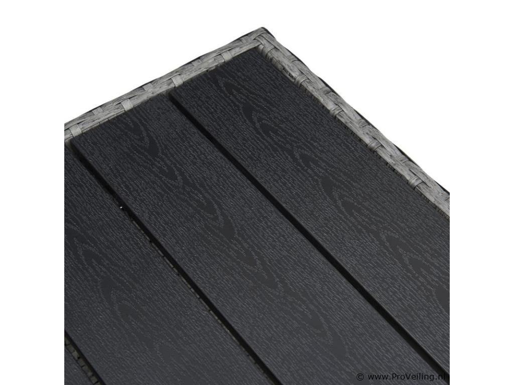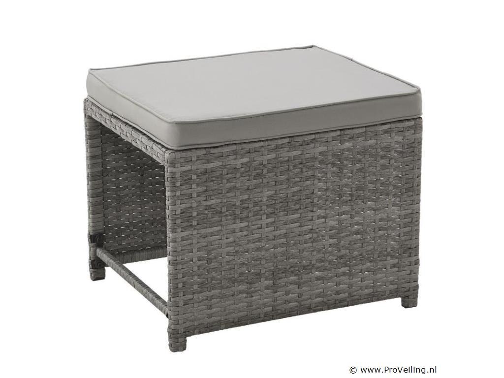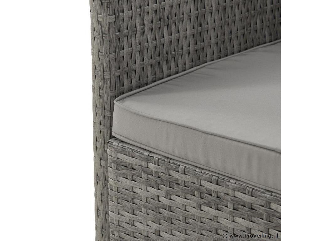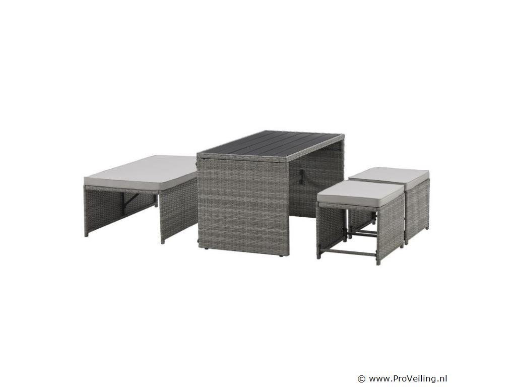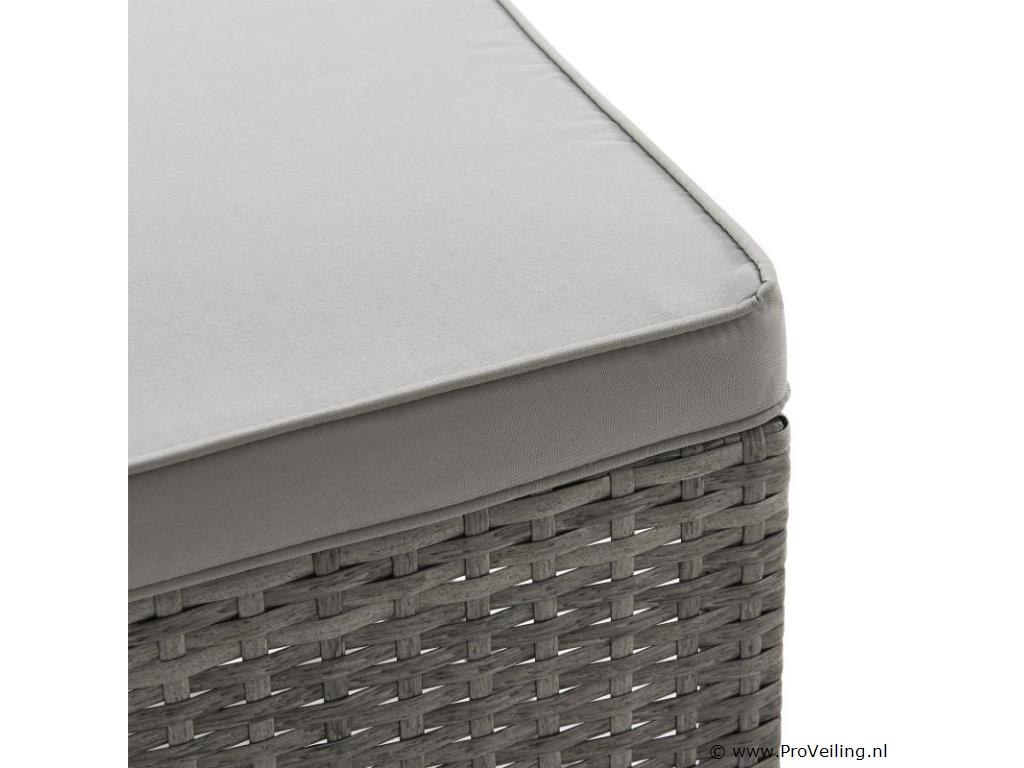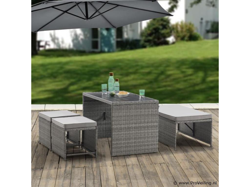 De 2in1 polyrotan Relax tuinmeubel Jamaica in grijs bestaat uit een tafel, bank en krukken. Gebruik de set als comfortabele bank of als zithoek met tafel. De bank doet ook dienst als bank en tafel als je de tafel 90 graden draait. De multifunctionele zitgroep voor 2 tot 4 personen is vooral geschikt waar weinig ruimte is, zoals voor een klein balkon, tuin of op de camping. De moderne lounge is gemaakt van polyrotan en is weerbestendig, onderhoudsvriendelijk en duurzaam. Technische specificaties: Materiaal gaas / frame: polyrotan / staal Materiaal hoes: 180 g/m² polyester Materiaal tafelblad: kunststof hout Kleur tuinlounge: Grijs (grijs gemêleerd) Kleur kussen: grijs (lichtgrijs) Aantal zitplaatsen: 2 tot 4 Hoezen wasbaar: ja Draagvermogen bank: 200 kg Draagvermogen per kruk: 100 kg Afmetingen (ongeveer): Tafel (LxBxH): 110x60x61 cm Bank (BxDxH): 102x57x35 Kruk (BxDxH): 40x40x35 Dikke kussens: 6 cm Leveringsomvang: 1x tafel 1 x Bank 2 x krukken 5 x kussens 1 x Instructie