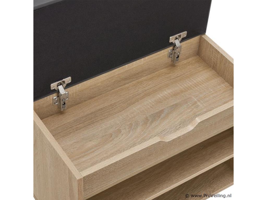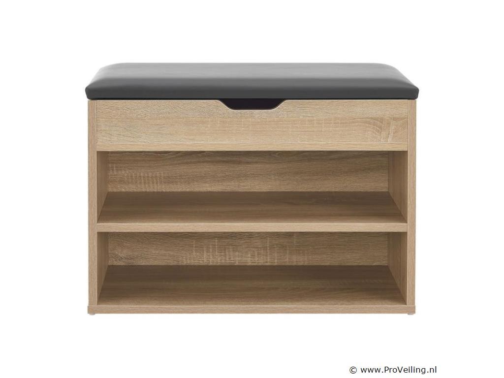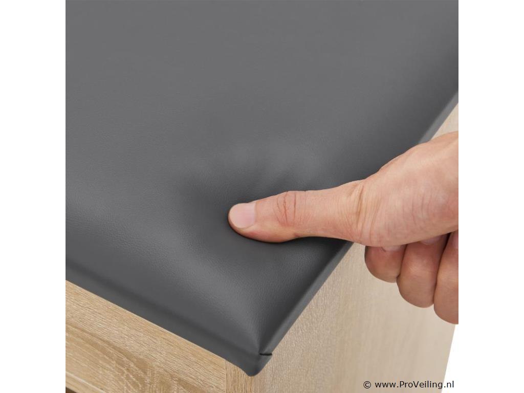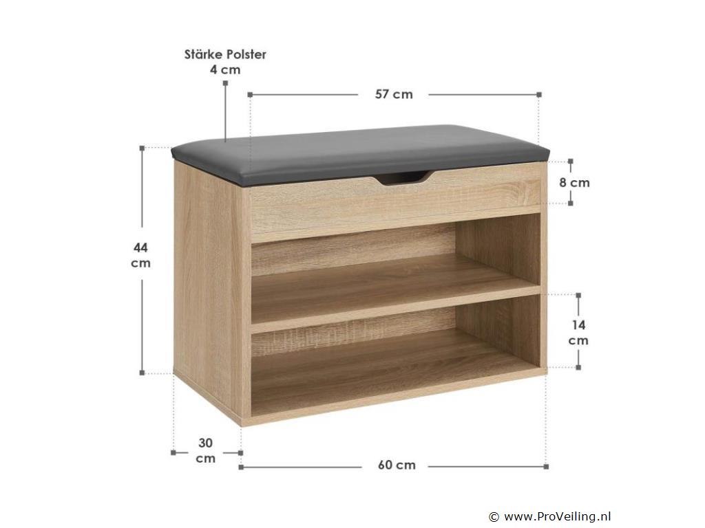 Het kleine schoenenrek blijkt een echt wonder van opbergruimte te zijn. De twee schoenenrekken bieden gemakkelijk plaats aan maximaal 6 paar schoenen. Bovendien is er een ruim vak verborgen onder het gevoerde deksel, waarin kleine voorwerpen zoals schoenlepels of schoenborstels een nieuw, onopvallend thuis vinden - binnen handbereik en netjes opgeborgen. De zachte bekleding doet tevens dienst als comfortabele zitplaats. Met een draagvermogen tot 150 kg zit je hier comfortabel om je schoenen aan en uit te trekken, schoon te maken en dergelijke. De plank is gemaakt van lichte en robuuste houten panelen met een slijtvaste melamine coating. Technische specificaties: Lichaamsmateriaal: spaanplaat E1 (melaminecoating) Materiaal achterwand: MDF-plaat Materiaal zitkussen: schuim, kunstleer (polyurethaan) Kleur romp: houtlook Kleur bekleding: grijs Maximaal draagvermogen: 150 kg Afwerking: Mat Afmetingen (ongeveer): Totale afmetingen (LxBxH): 60x30x44 cm Afmeting 1 vak: 57x27x8 cm Afmeting 2 vakken: 57x27x14 cm Paddikte: 4 cm Materiaaldikte: 15 mm Dikte achterwand: 3 mm Leveringsomvang: 1 × schoenenrek 1 × montage-instructies