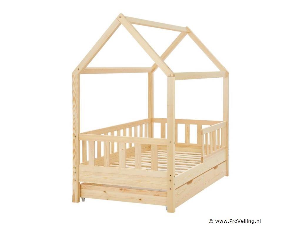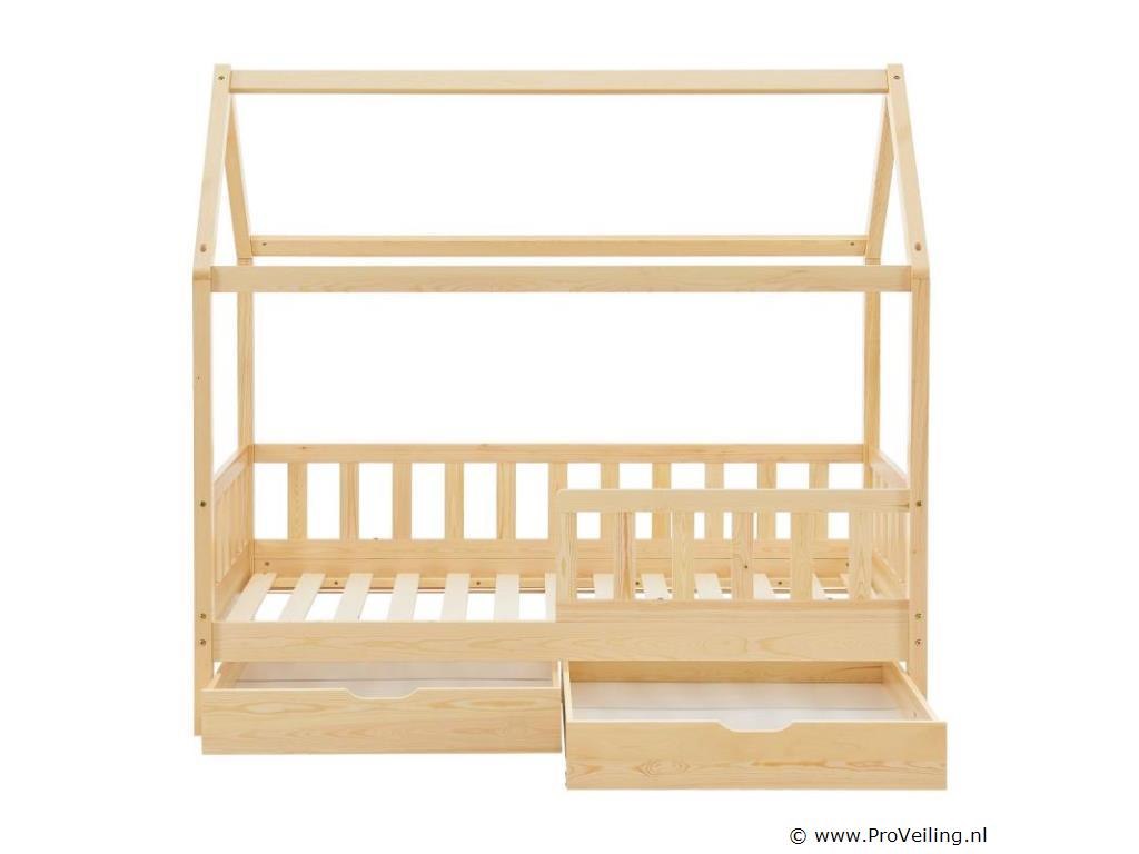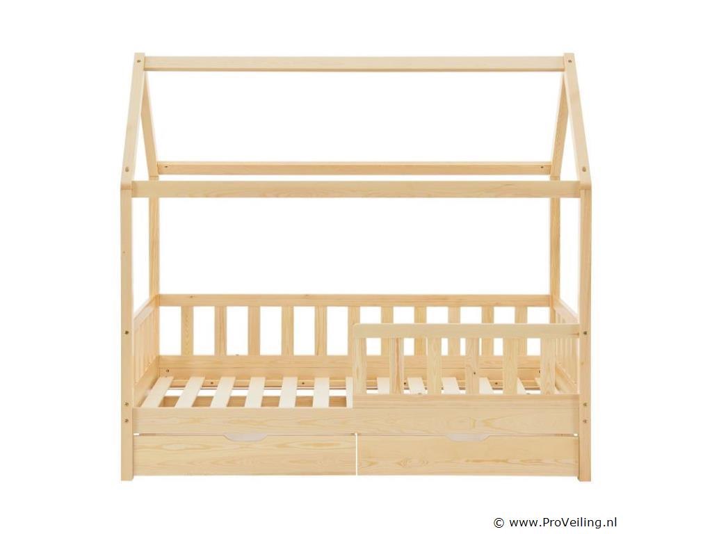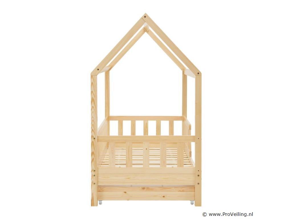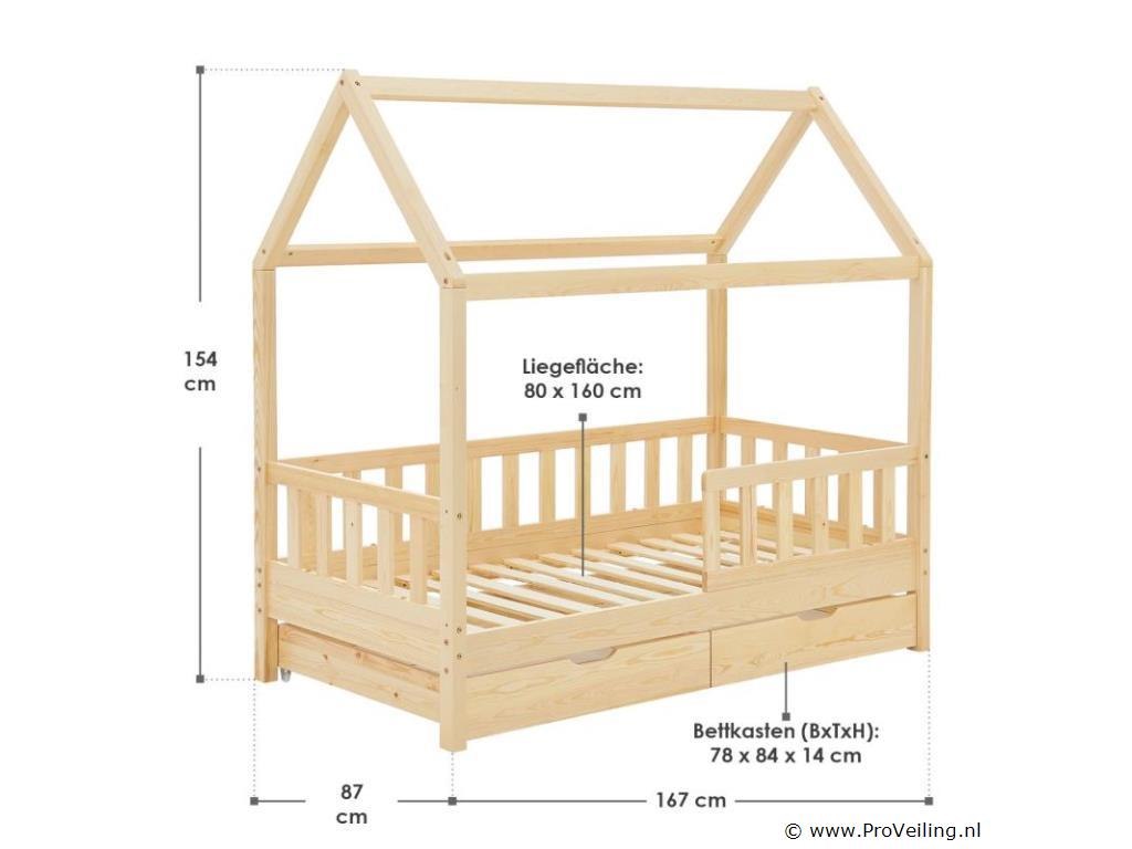 Het kinderbed Marli (160x80 cm, houtkleur) met bedstee, valbeveiliging en lattenbodem maakt indruk op meisjes en jongens van 3 tot 10 jaar. Verfraai de kinderkamer met het moderne huisbed, een slaapplek, speelbed en opbergruimte in één. Speelgoed kan netjes worden opgeborgen in de grote 2-delige bedbak. En de huislook met dak biedt vele vormgevingsmogelijkheden - als grot of met een betoverende luchtdecoratie. Uitgerust met een rail biedt het bed ook meer bescherming en veiligheid voor jonge kinderen. Het houten bed van massief en onderhoudsvriendelijk grenenhout is de juiste keuze voor langdurig gebruik. Technische specificaties: Materiaal lijst: grenenhout Materiaal lattenbodem: hout, 13 latten Kleur houtkleur Maximale belasting: 125 kg Maximale belasting per lade: 25 kg Aantal lades: 2 Matras: Geen Afmetingen (ongeveer): Totale afmetingen (BxLxH): 87x167x154 cm Ligvlak (BxL): 80x160 cm Bedstee (BxDxH): 78x84x14 cm Leveringsomvang: 1 x kinderbed 80x160 cm 1 x lattenbodem 1 x dak 2 x bedlade 1 x Instructie