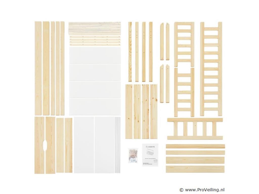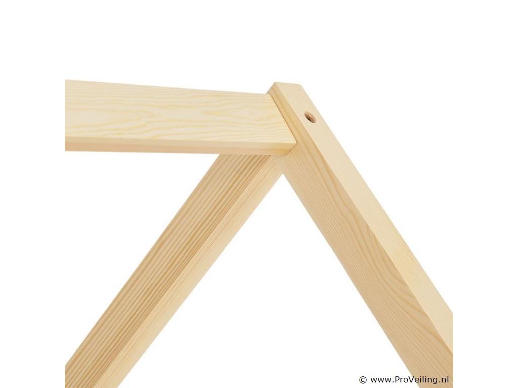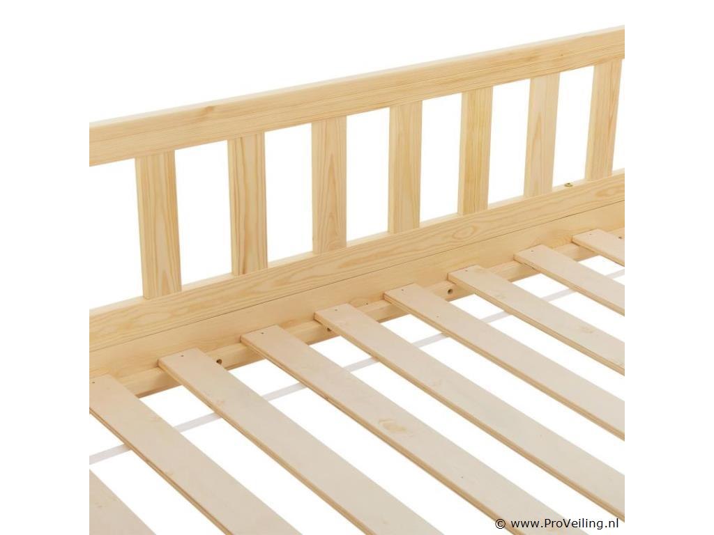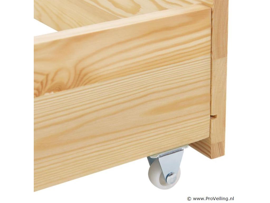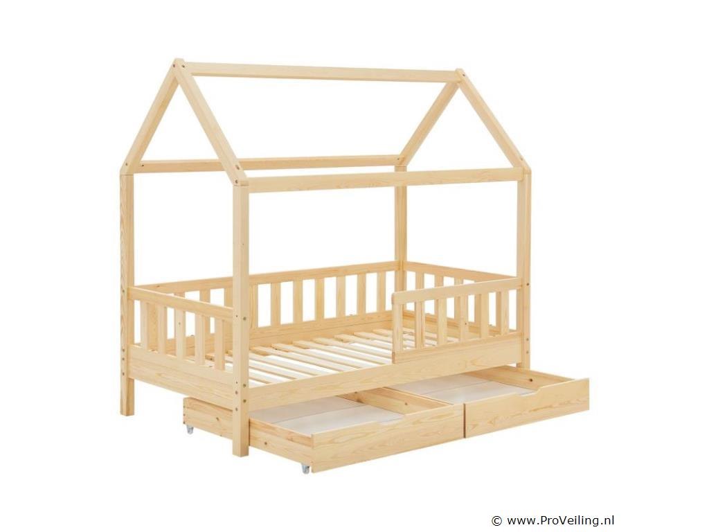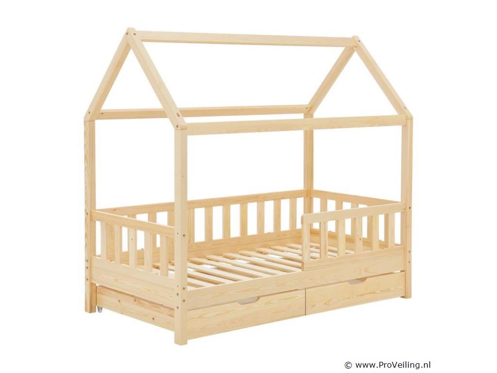 Het kinderbed Marli (160x80 cm, houtkleur) met bedstee, valbeveiliging en lattenbodem maakt indruk op meisjes en jongens van 3 tot 10 jaar. Verfraai de kinderkamer met het moderne huisbed, een slaapplek, speelbed en opbergruimte in één. Speelgoed kan netjes worden opgeborgen in de grote 2-delige bedbak. En de huislook met dak biedt vele vormgevingsmogelijkheden - als grot of met een betoverende luchtdecoratie. Uitgerust met een rail biedt het bed ook meer bescherming en veiligheid voor jonge kinderen. Het houten bed van massief en onderhoudsvriendelijk grenenhout is de juiste keuze voor langdurig gebruik. Technische specificaties: Materiaal lijst: grenenhout Materiaal lattenbodem: hout, 13 latten Kleur houtkleur Maximale belasting: 125 kg Maximale belasting per lade: 25 kg Aantal lades: 2 Matras: Geen Afmetingen (ongeveer): Totale afmetingen (BxLxH): 87x167x154 cm Ligvlak (BxL): 80x160 cm Bedstee (BxDxH): 78x84x14 cm Leveringsomvang: 1 x kinderbed 80x160 cm 1 x lattenbodem 1 x dak 2 x bedlade 1 x Instructie