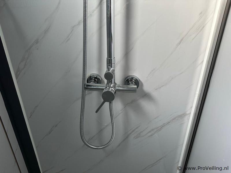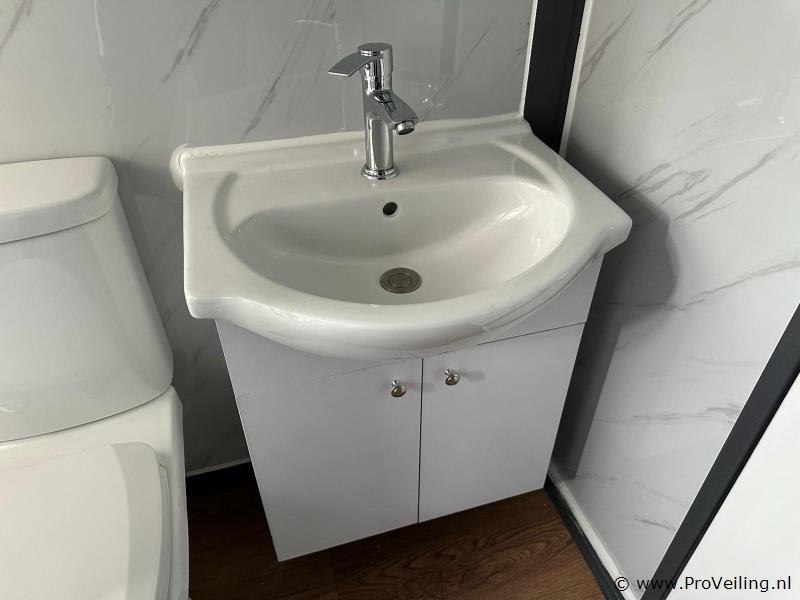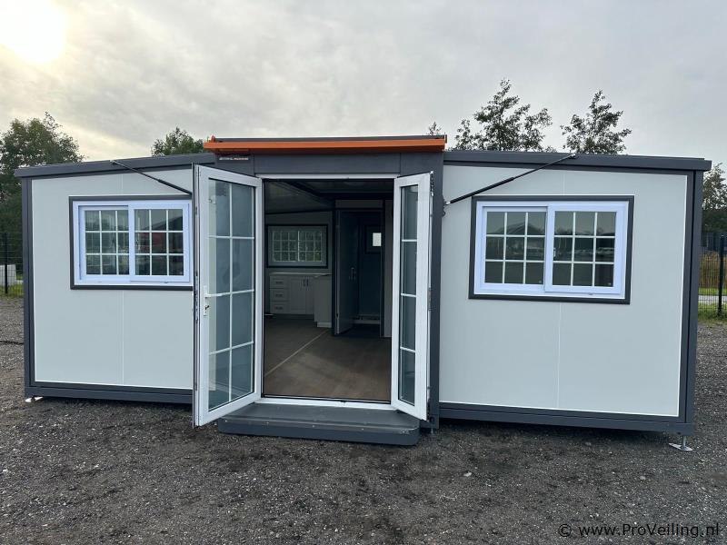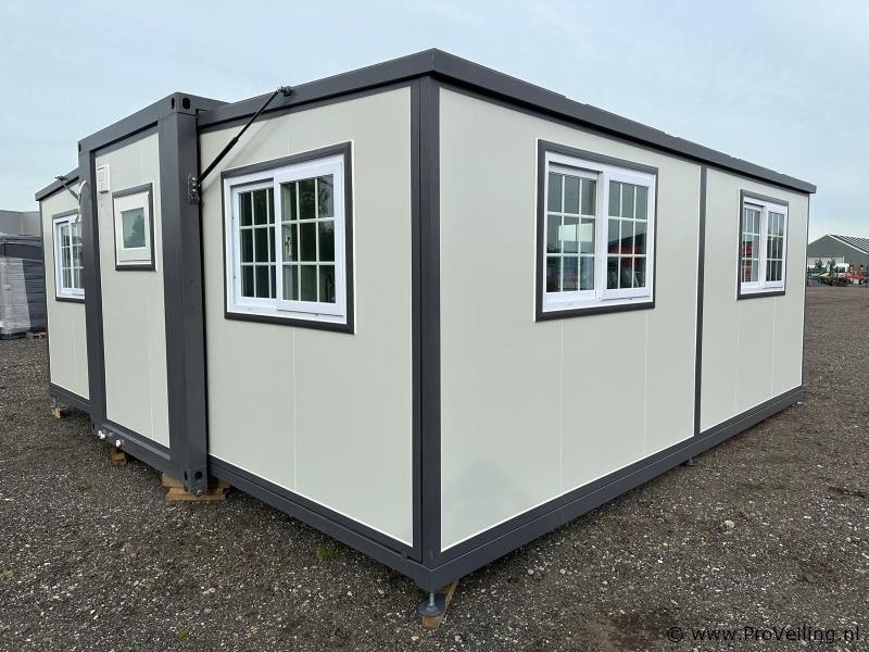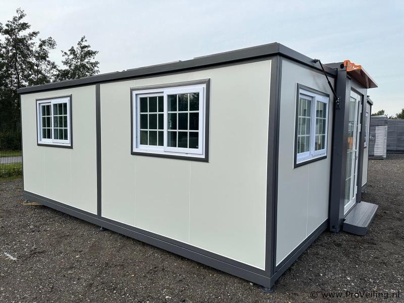 Type: Compleet Deluxe (19ft*20ft) Aantal ramen: 9 Keukenblok: true Toilet: true Eigen gewicht: 3550 kg Totale afmeting Lengte: 5860 mm Totale afmeting Breedte: 6220 mm Totale afmeting Hoogte: 2550 mm Additionele informatie: Voorzien van geïsoleerde wanden en dak; hoek keuken met boven kastjes; badkamer met toilet en regendouche; wastafel met spiegelkast en toiletgarnituur; vinyl vloer; ventilatiesysteem (230 Volt aansluiting); kunststof kozijnen met dubbele beglazing; afwateringsgoot; bordes; water, stroom en afvoer kan makkelijk aangesloten worden is voorbereid; afsluitbaar met sleutel en knopcilinder; afmetingen ingeklapt 5860x2110x2550 mm (transport afmetingen); ongebruikt