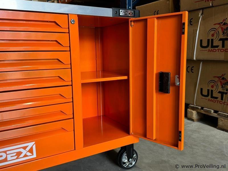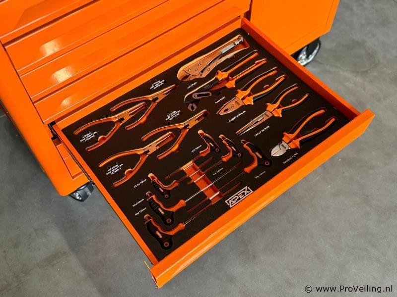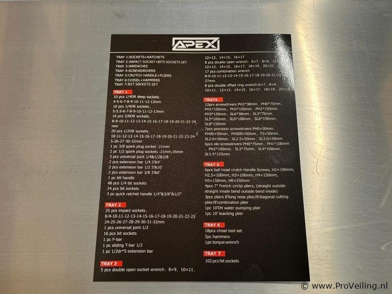 Afmetingen LxBxH: 110x45x88 cm Lengte zonder handgreep: 103 cm Hoogte zonder wieltjes: 72 cm Inhoud Lade 1: Steekdoppen + Ratstels Lade 2: Impact Steekdoppen + Bit Steekdoppenset Lade 3: Sleutels Lade 4: Schroevendraaiers Lade 5: Kruishoofd Schroefdraaiers + Tang Lade 6: Beitel + Hamers Lade 7: Bit Steekdoppenset Lade 1: Steekdoppen en Ratstels 10 stuks 1/4DR diepe steekdoppen: 4-5-6-7-8-9-10-11-12-13 mm 10 stuks 1/4DR steekdoppen: 5-5.5-6-7-8-9-10-11-12-13 mm 16 stuks 3/8DR steekdoppen: 8-9-10-11-12-13-14-15-16-17-18-19-20-21-22-24 mm 20 stuks 1/2DR steekdoppen: 10-11-12-13-14-15-16-17-18-19-20-21-22-23-24-25-26-27-30-32 mm 1 stuk 3/8 bougie steekdoppen: 21 mm 2 stuks 1/2 bougie steekdoppen: 21 mm, 16 mm 3 stuks universele gewricht 1/4 & 1/2 & 3/8 2 stuks verlengstang 1/4 2' & 4' 2 stuks verlengstang 1/2 5' & 10' 2 stuks verlengstang 3/8 3' & 6' 1 stuk bit houder 48 stuks 1/4 bit steekdoppen 24 stuks bit steekdoppen 3 stuks snelle ratstelhouder 1/4" & 3/8" & 1/2" Lade 2: Impact Steekdoppen en Bit Steekdoppenset 25 stuks impact steekdoppen: 8-9-10-11-12-13-14-15-16-17-18-19-20-21-22-23-24-25-26-27-28-29-30-31-32 mm 1 stuk universele gewricht 1/2 16 stuks bit steekdoppen 1 stuk F-bar 1 stuk glijdende T-bar 1/2 1 stuk 1/2dr*5 verlengstang Lade 3: Sleutels 5 stuks dubbele open sleutel: 8×9, 10×11, 12×13, 14×15, 16×17 8 stuks dubbele open sleutel: 6×7, 8×9, 10×11, 12×13, 14×15, 16×17, 18×19, 20×22 17 stuks combinatie sleutel: 8-9-10-11-12-13-14-15-16-17-18-19-20-21-22-24-27 mm 8 stuks dubbele offset ringsleutel: 6×7, 8×9, 10×11, 12×13, 14×15, 16×17, 18×19, 20×22 Lade 4: Schroevendraaiers 12 stuks schroevendraaiers: PH238 mm, PH075 mm, PH3150 mm, SL638 mm, SL375 mm, SL5100 mm, SL6100 mm, SL6150 mm, PH1100 mm, PH2100 mm, PH2150 mm, SL8150 mm 7 stuks precisie schroevendraaiers: PH0x50 mm, PH00x50 mm, PH000×50 mm, T5x50 mm, SL2.0x50 mm, SL2.5×50 mm, SL3.0x50 mm 6 stuks ele-schroevendraaiers: PH075 mm, PH1100 mm, PH2100 mm, SL375 mm, SL4100 mm, SL5.5125 mm Lade 5: Kruishoofd Schroefdraaiers en Tang 6 stuks kruishoofd schroefdraaiers: H2x100 mm, H2.5x100 mm, H3x100 mm, H4x150 mm, H5x150 mm, H6x150 mm 4 stuks 7" Franse kniptang: (recht buiten recht binnen gebogen buiten gebogen binnen) 3 stuks tang: 8' lange neus tang/8' diagonale kniptang/8' combinatie tang 1 stuk 10' D4 waterpomptang 1 stuk 10' vergrendelende tang Lade 6: Beitel en Hamers 18 stuks beitel gereedschapsset 2 stuks hamers 1 stuk koppelingsmeter Lade 7: Bit Steekdoppenset 102 stuks bit steekdoppen