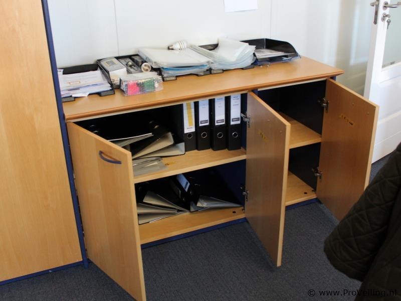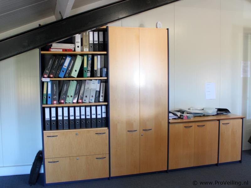 Kastenwand in houtdecor – 3-delig Uitvoering combinatie van hoge kasten en lage kast met blad Kleur licht houtdecor (beuken/ahorn tint) met donkerblauw frame en grepen 1) Hoge kast half open met archiefladen Afmetingen 93 x 50 x 218 cm (b x d x h) Bovenzijde open legplanken Onderzijde voorzien van 2 uittrekbare archiefladen (hangmappenframes) Extra afsluitbaar compartiment 2) Hoge kast met planken Afmetingen 93 x 50 x 218 cm (b x d x h) Dubbele deuren Meerdere verstelbare legplanken 3) Lage kast met blad Afmetingen 140 x 54 x 81 cm (b x d x h) Dubbele deuren met legplanken Bovenblad inzelfde houtdecor Toepassing Geschikt voor kantoor, archief of vergaderruimte Combinatie van open opslag, hangmappen en gesloten bergruimte Demontage: U dient deze kavel zelf te demonteren Conditie gebruikt (normale gebruikssporen mogelijk)