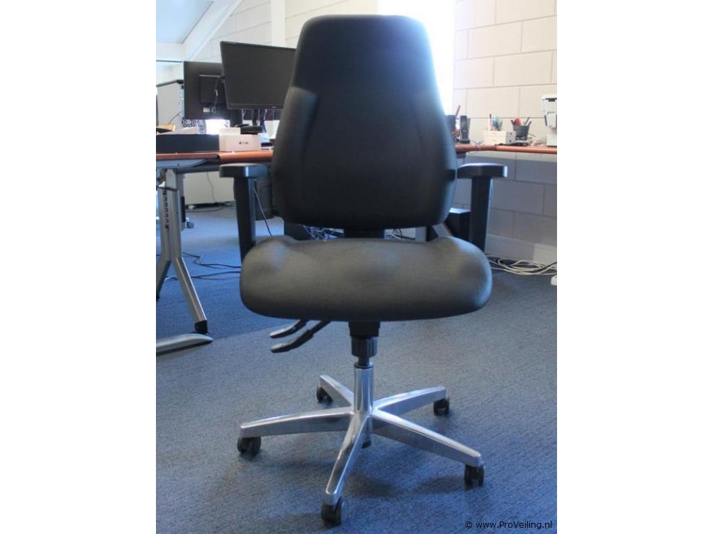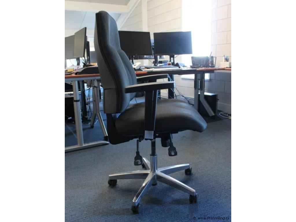 Ergonomische bureaustoel – zwart/grijs Uitvoering draaibare bureaustoel met hoge rugleuning Bekleding zwart/grijze stof Onderstel aluminium stervoet met zwenkwielen Armleuningen vaste armleuningen Verstelling gaslift (hoogte verstelbaar) en kantelmechanisme Toepassing geschikt voor kantoor of thuiswerkplek Conditie gebruikt (normale gebruikssporen)